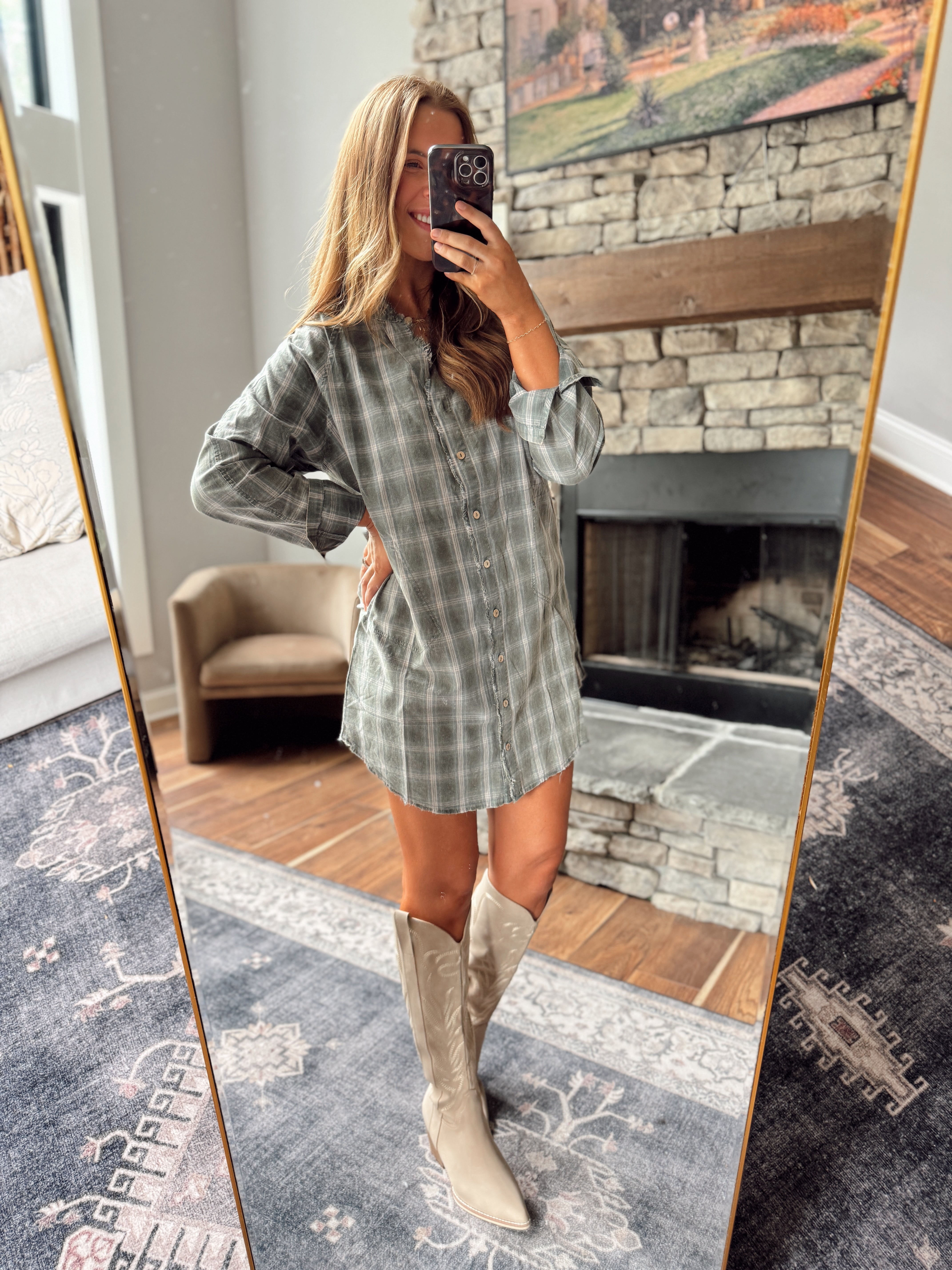 Pine Green Plaid Flannel Shirt Mini Dress