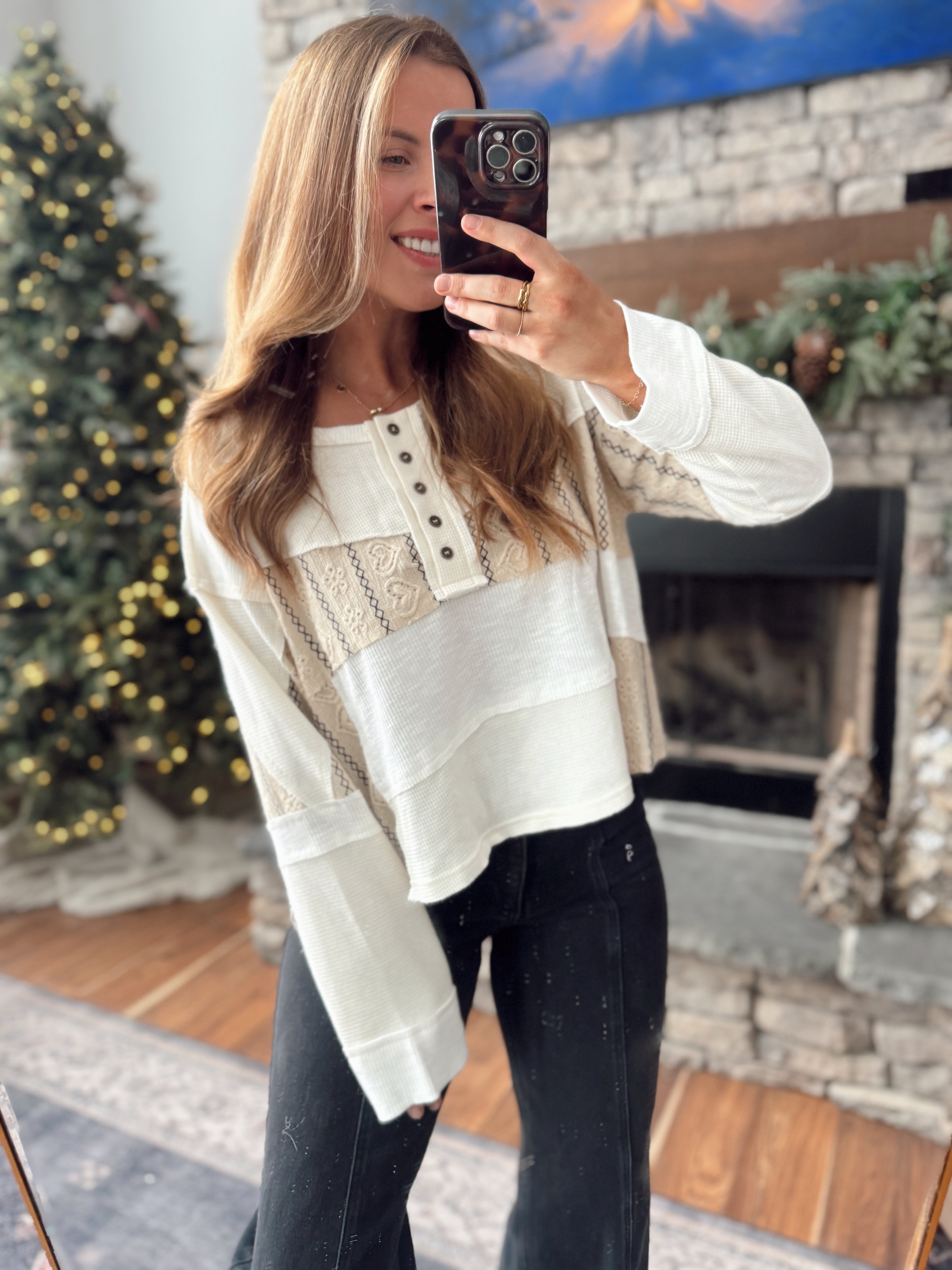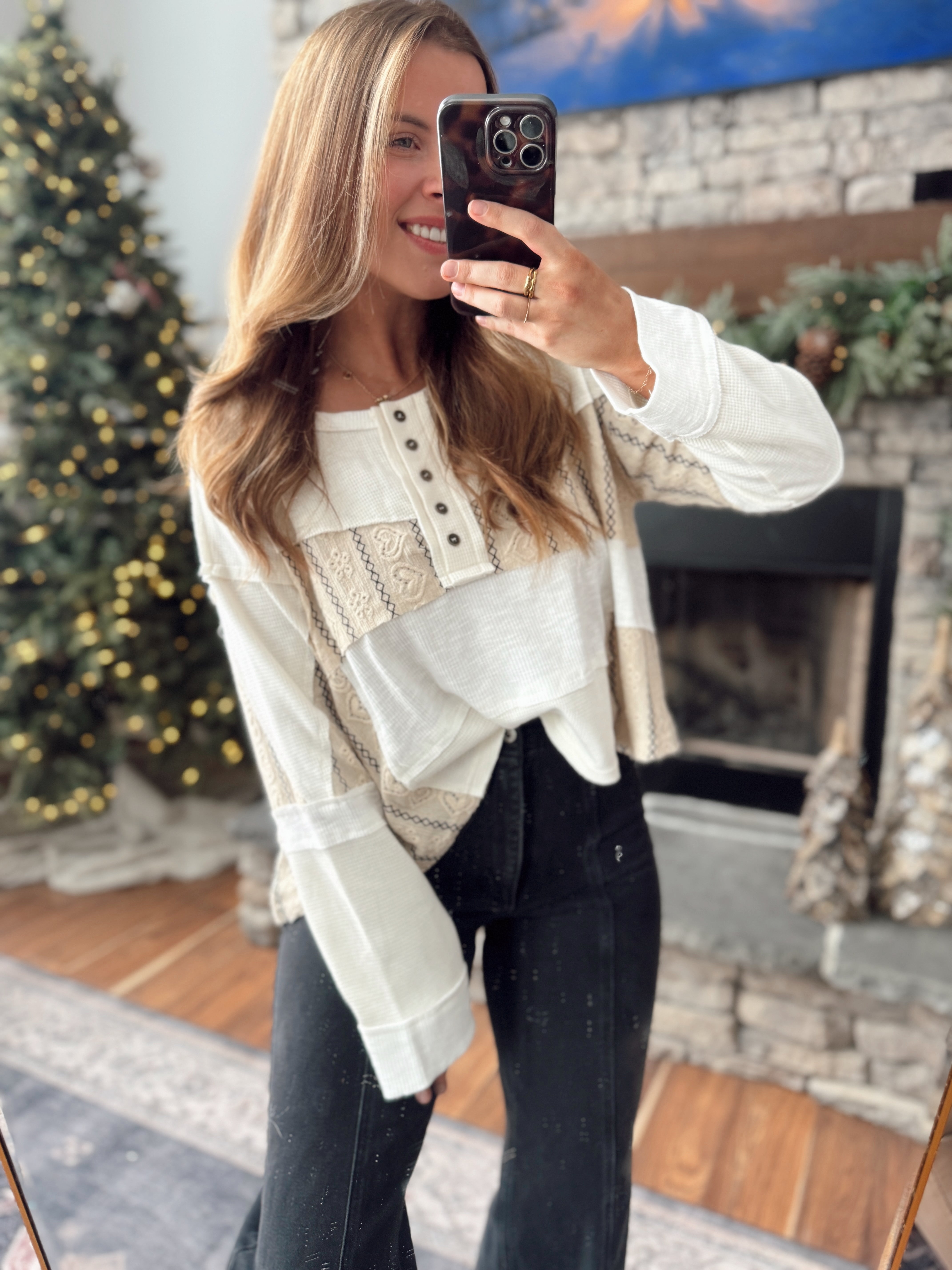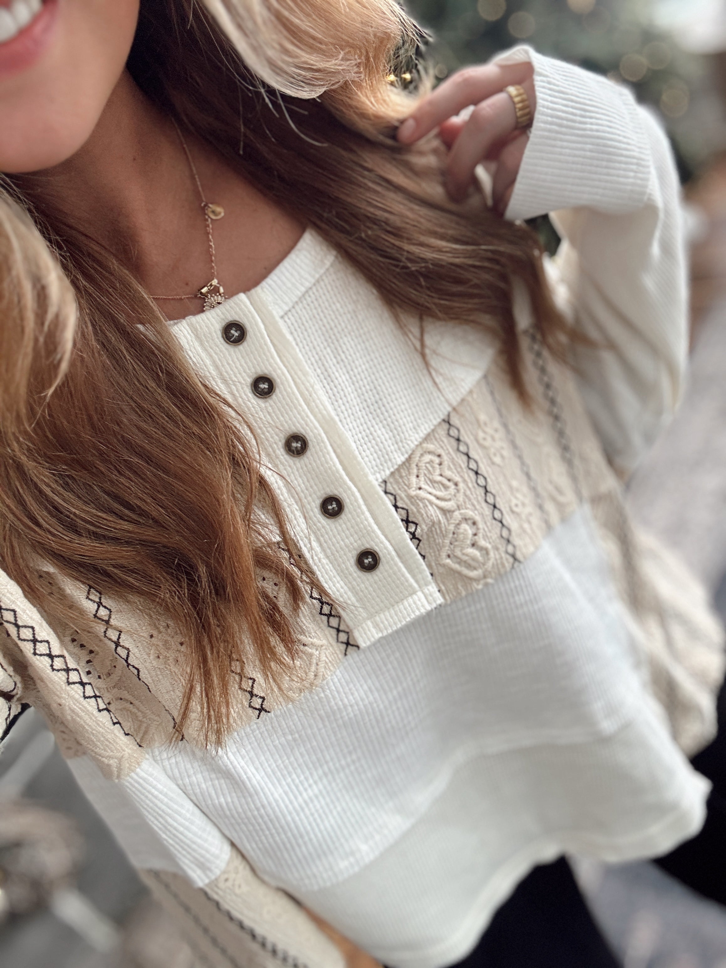 We’re swooning over this one 🫶 The Patchwork Henley Knit mixes all the cozy textures — soft waffle knit, delicate lace panels, and subtle stitched details — for the perfect blend of casual and feminine. The relaxed fit and button-front neckline give it that effortless vibe you’ll reach for again and again.