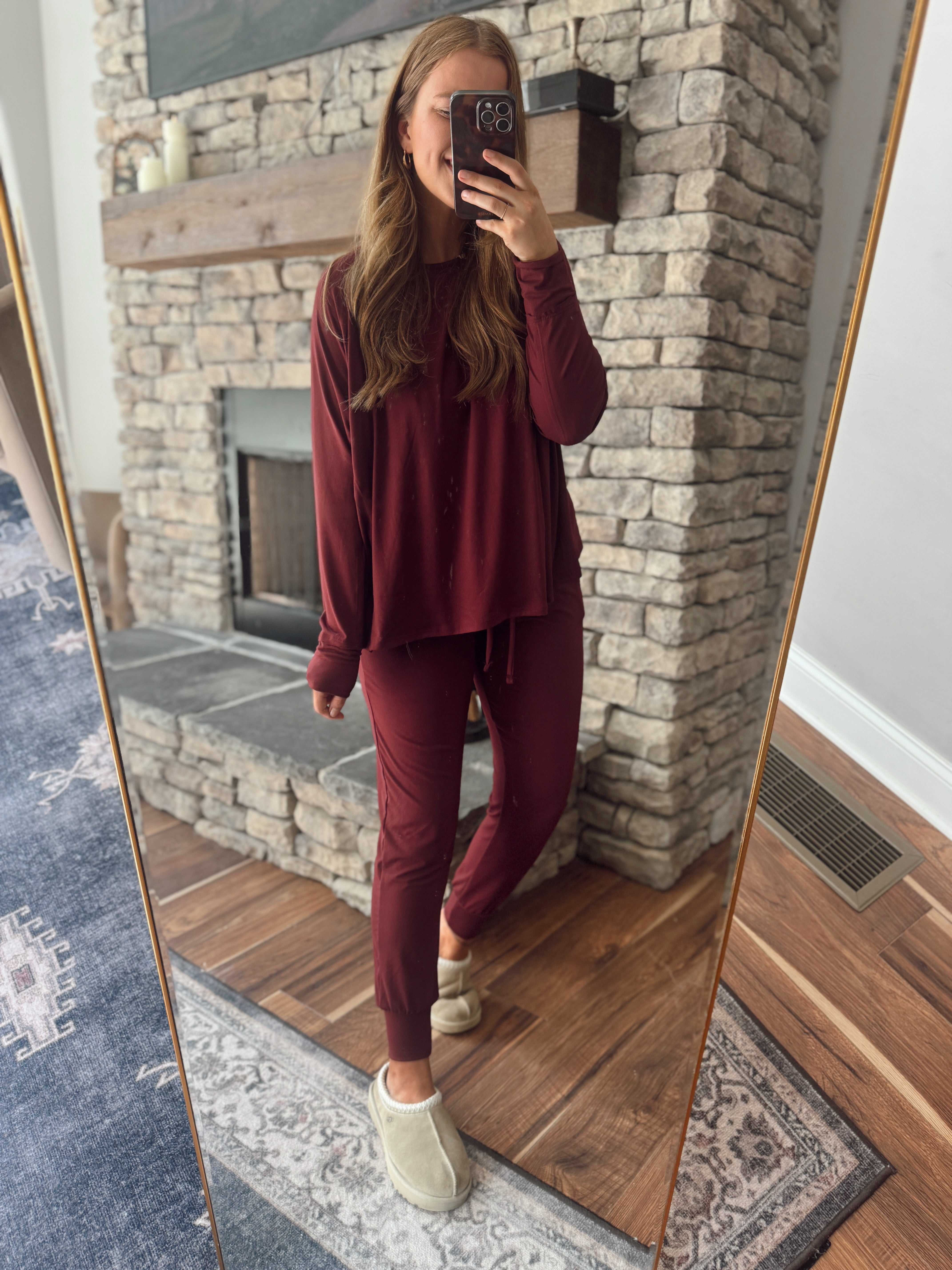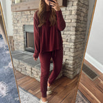 Slip into ultimate comfort with this buttery soft lounge set, designed for effortless style and relaxation. Featuring a flowy long-sleeve top with a relaxed fit and coordinating jogger-style bottoms, this set takes loungewear to a whole new level. The joggers include a comfortable elastic waistband with a drawstring and cuffed ankles for a flattering, easy-to-wear fit.