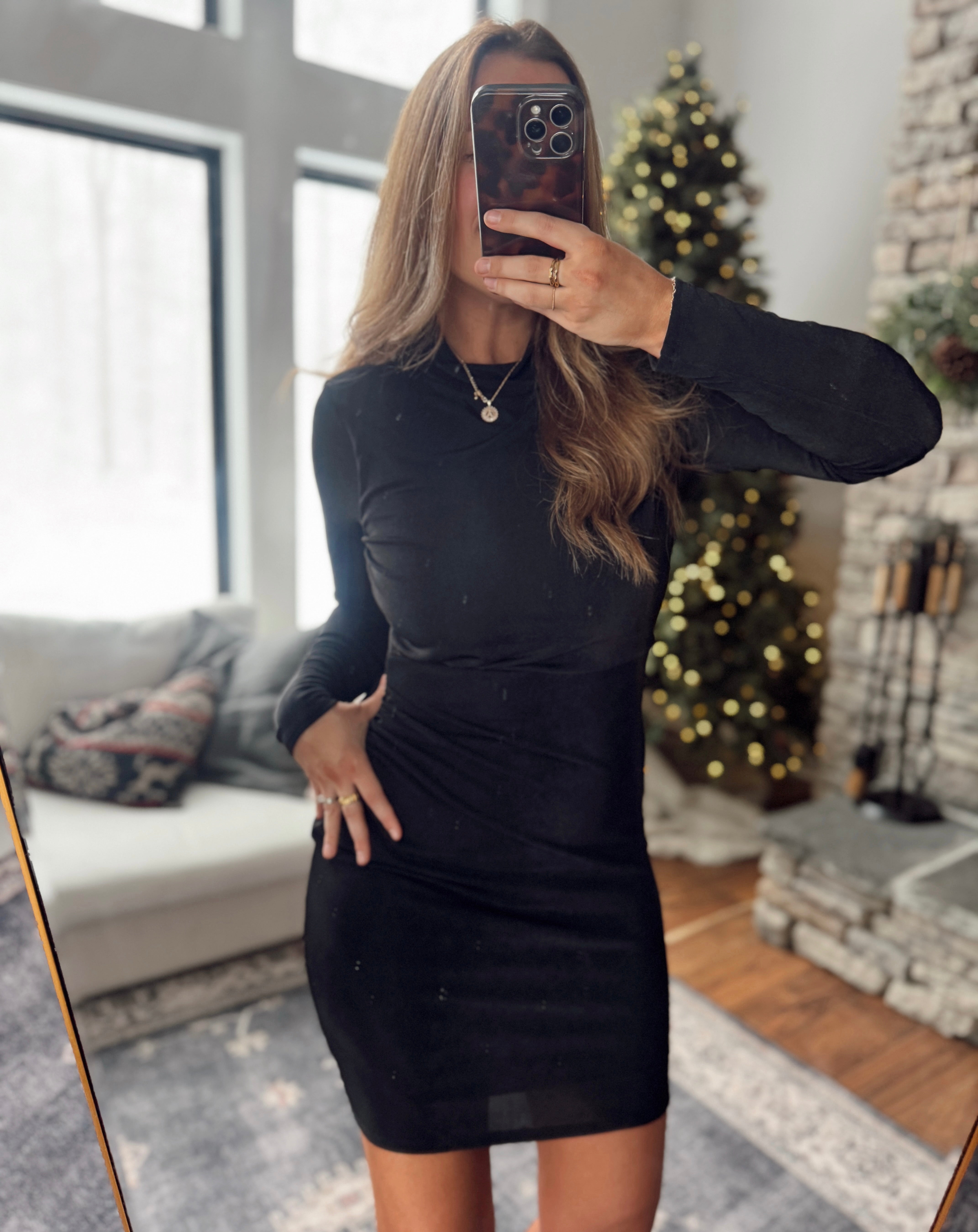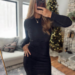 This classic black dress hugs in all the right places with a soft, stretchy fabric that moves with you. The long sleeves and high neckline make it perfect for holiday gatherings, date nights, or layering with a coat for a sleek winter look.