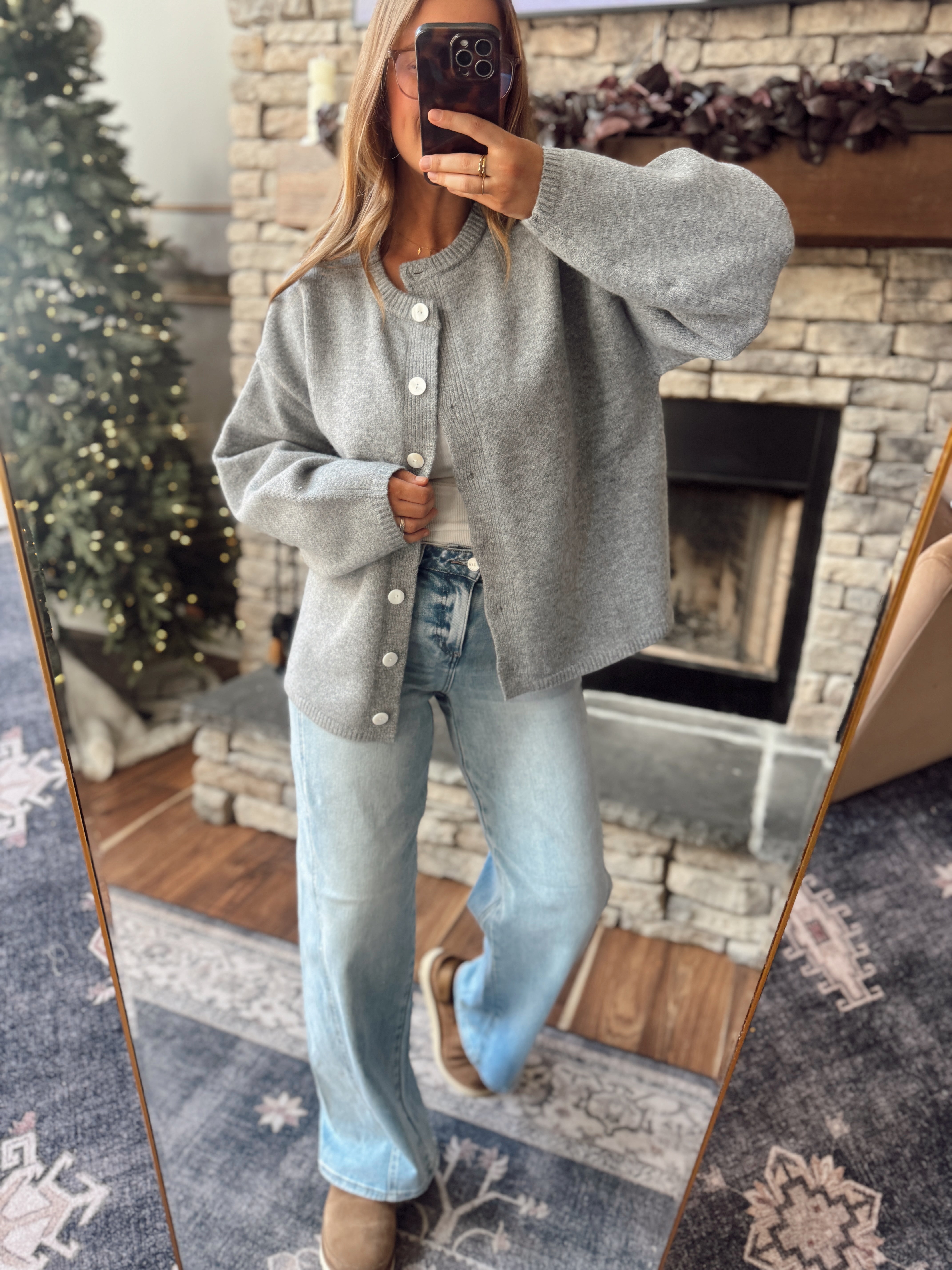 This soft button-up sweater is the definition of timeless. Designed with a relaxed fit and balloon sleeves, it’s the perfect piece to throw on with denim or layer over dresses. The large buttons and soft knit give it that elevated, minimal feel while keeping things cozy.