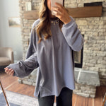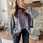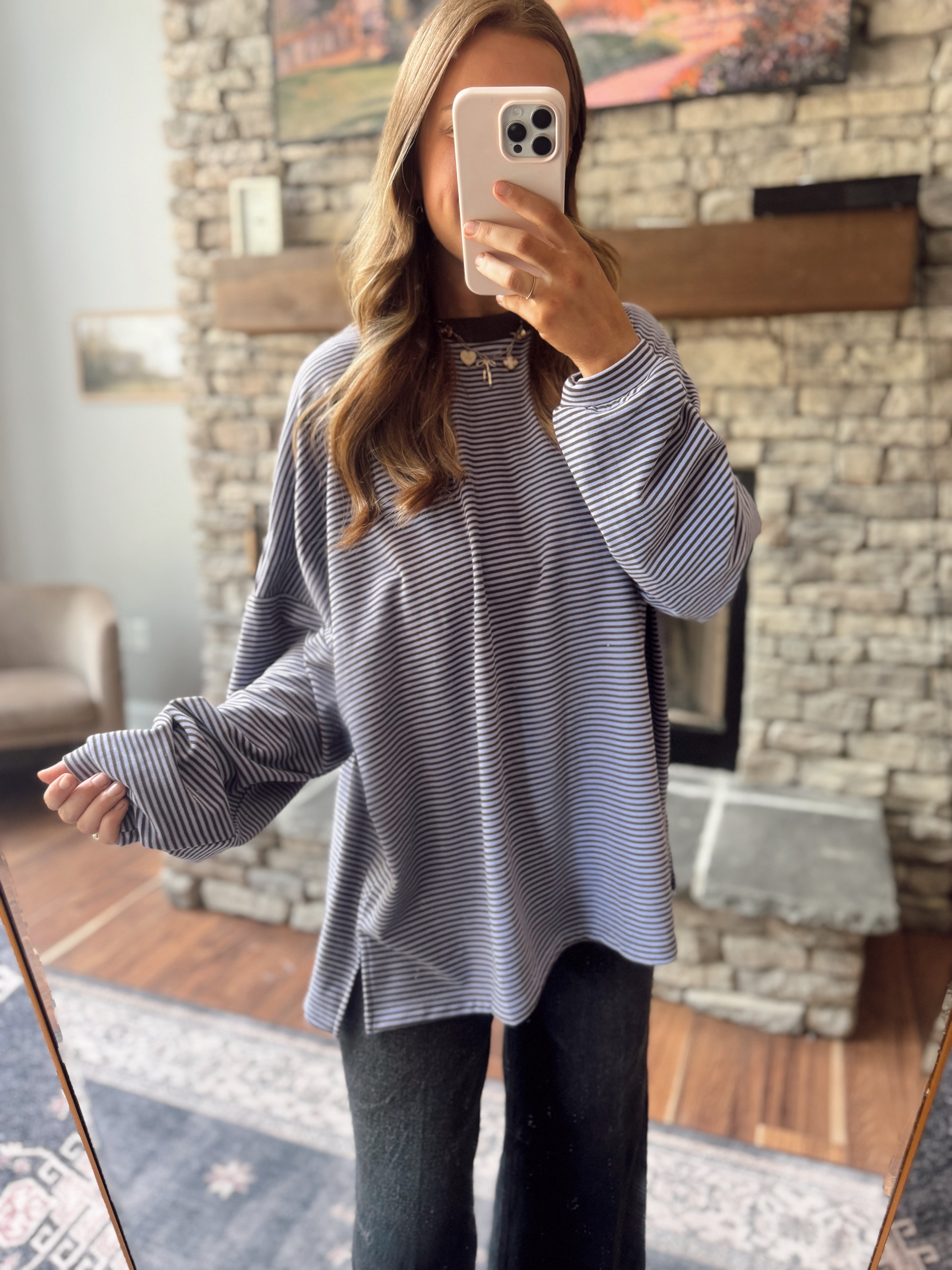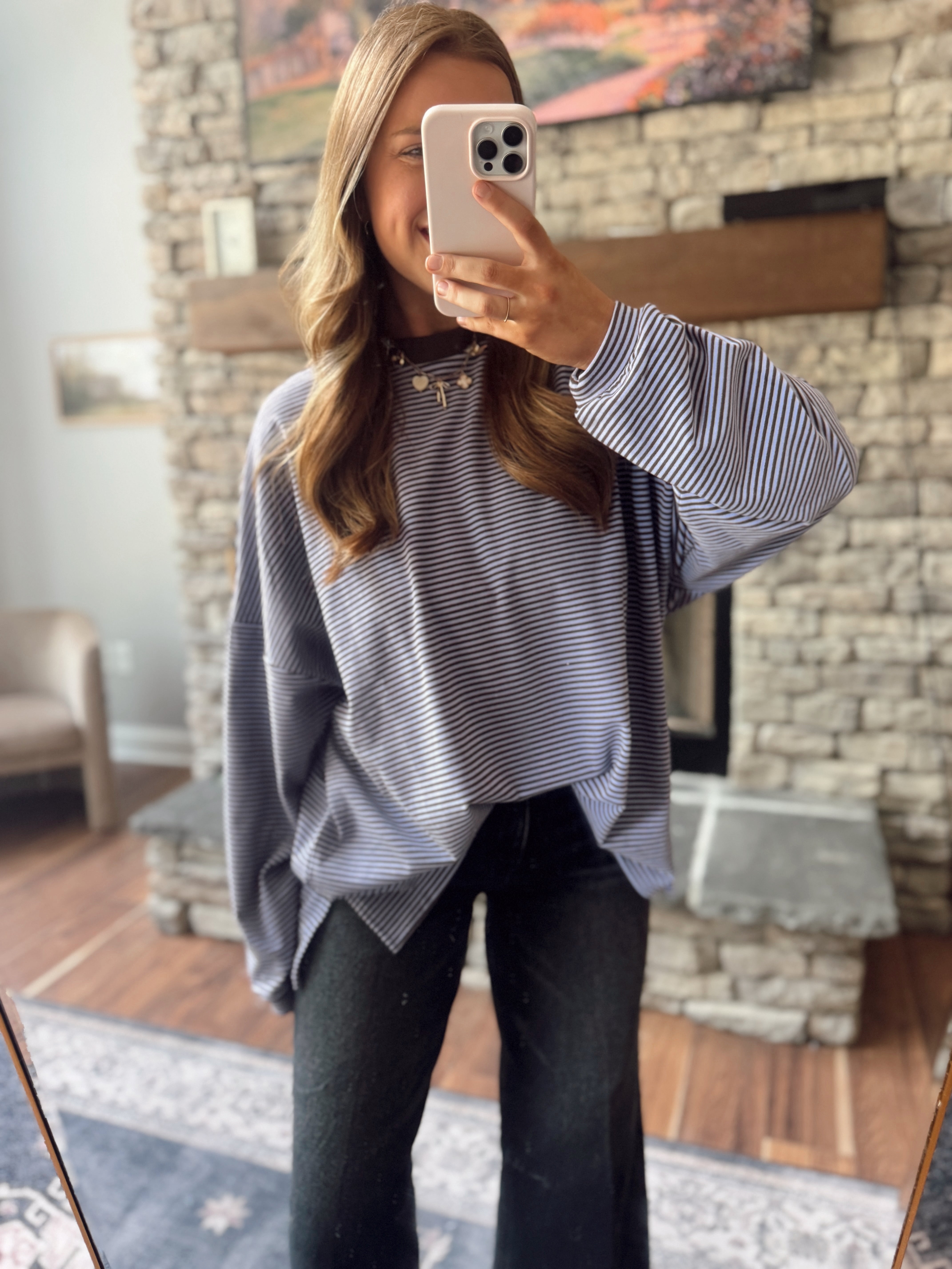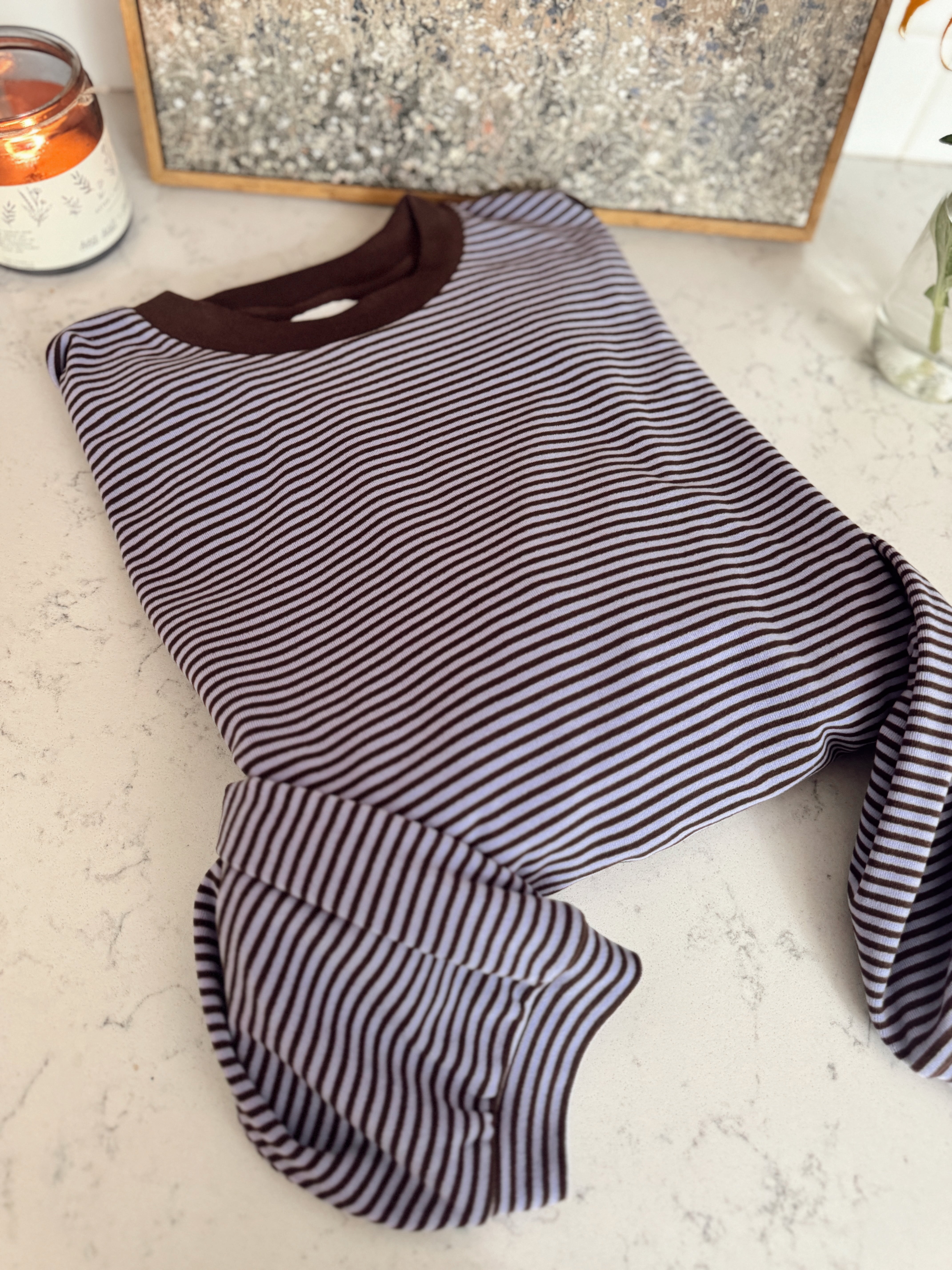 Comfy called, and it’s living in this top. With its oversized fit and dreamy-soft fabric, this lavender + chocolate stripe combo is made for slow starts, coffee runs, and everything in between. The crewneck and drop-shoulder give it that laid-back feel, while the subtle side slit adds a touch of shape.