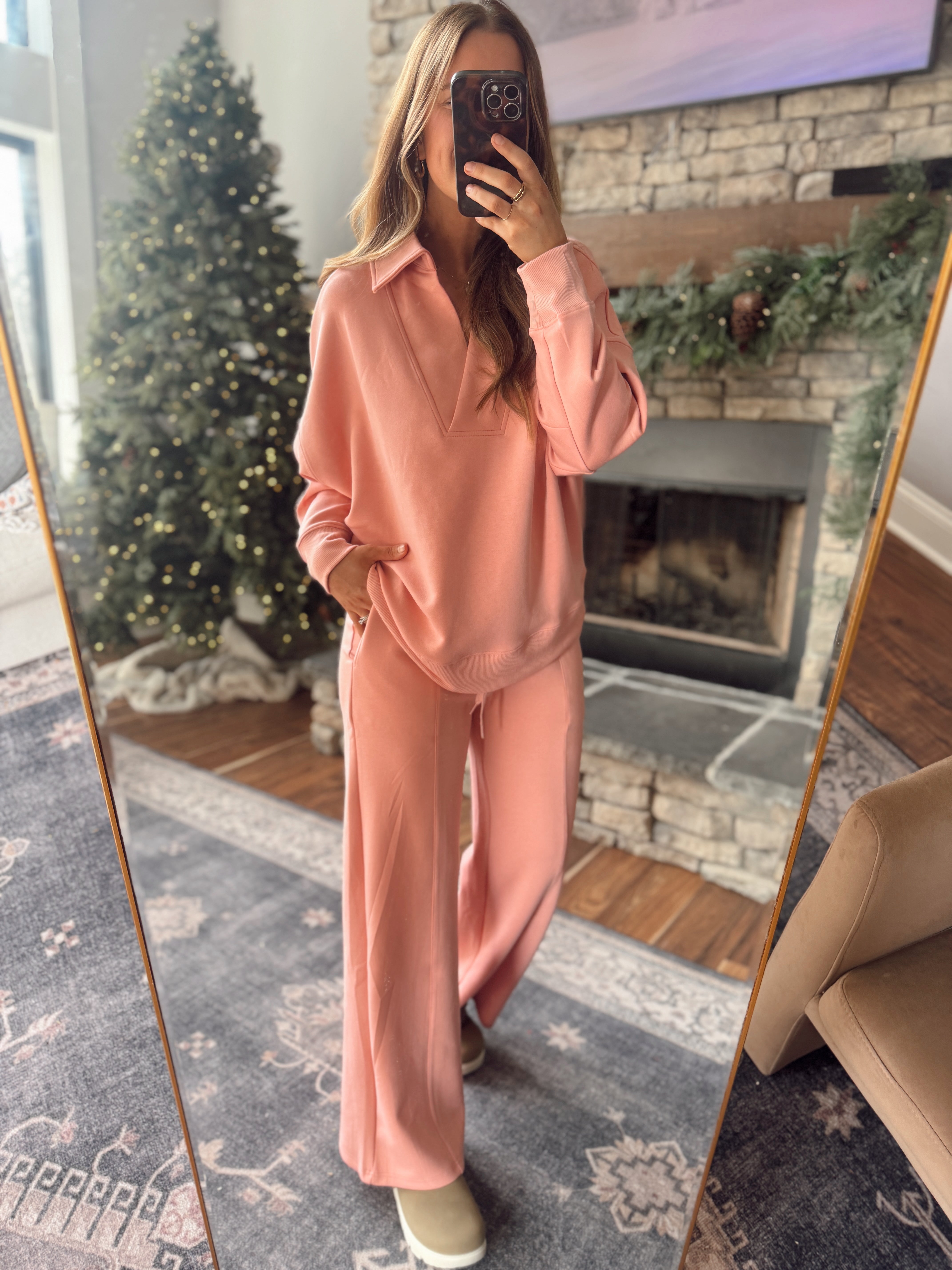 The top features a chic V-collar neckline with a relaxed drape, and the matching wide-leg pants pull everything together for an effortless, elevated look. Perfect for school runs, travel days, errands, or cozy holiday lounging.