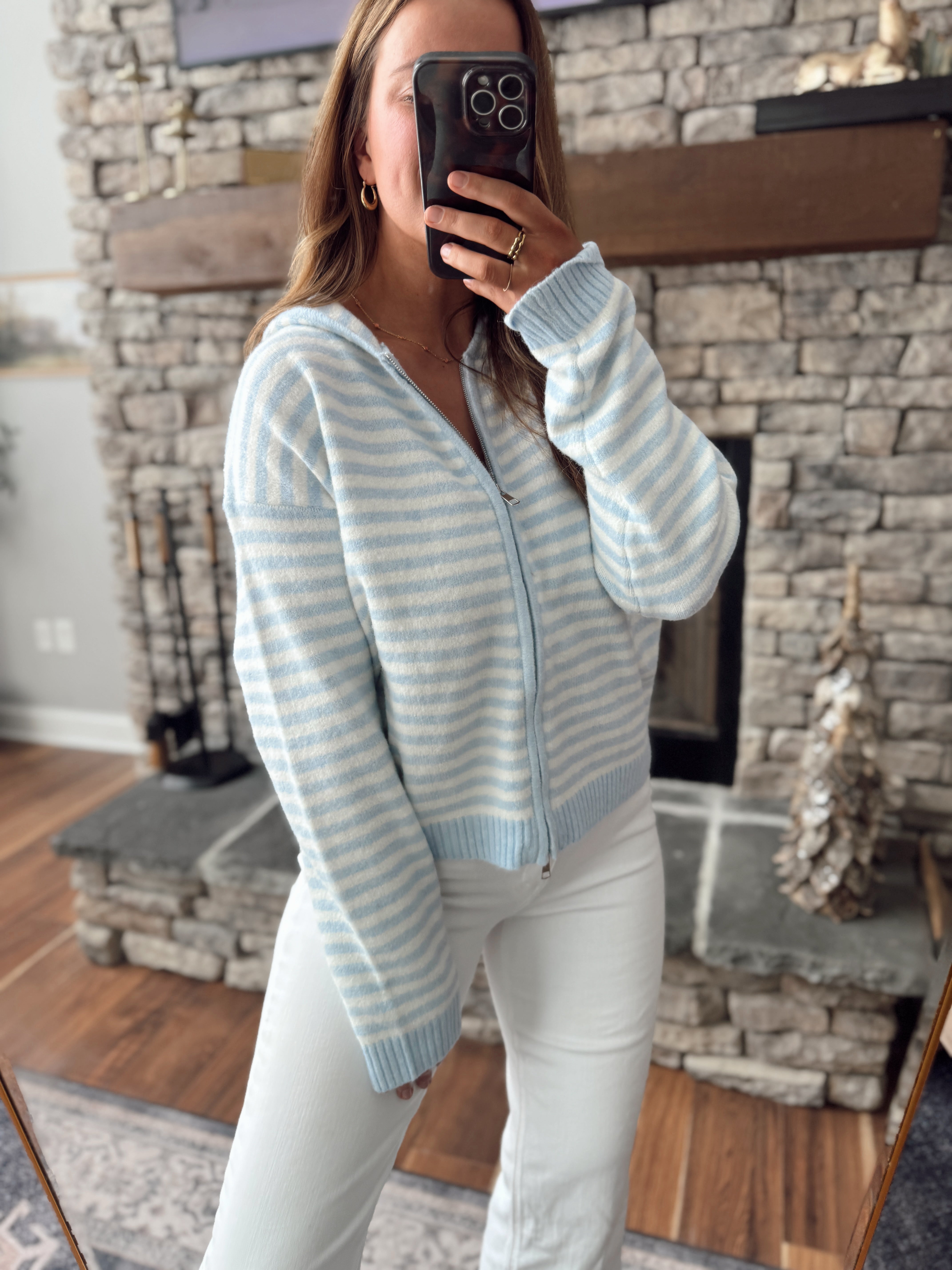 Light, cozy, and effortlessly polished. This relaxed-fit zip-up sweater features a dreamy baby blue and ivory stripe with an ultra-soft knit feel you’ll want to live in. Designed with a full zip front, ribbed cuffs and hem, and an easy everyday length that pairs perfectly with denim.