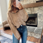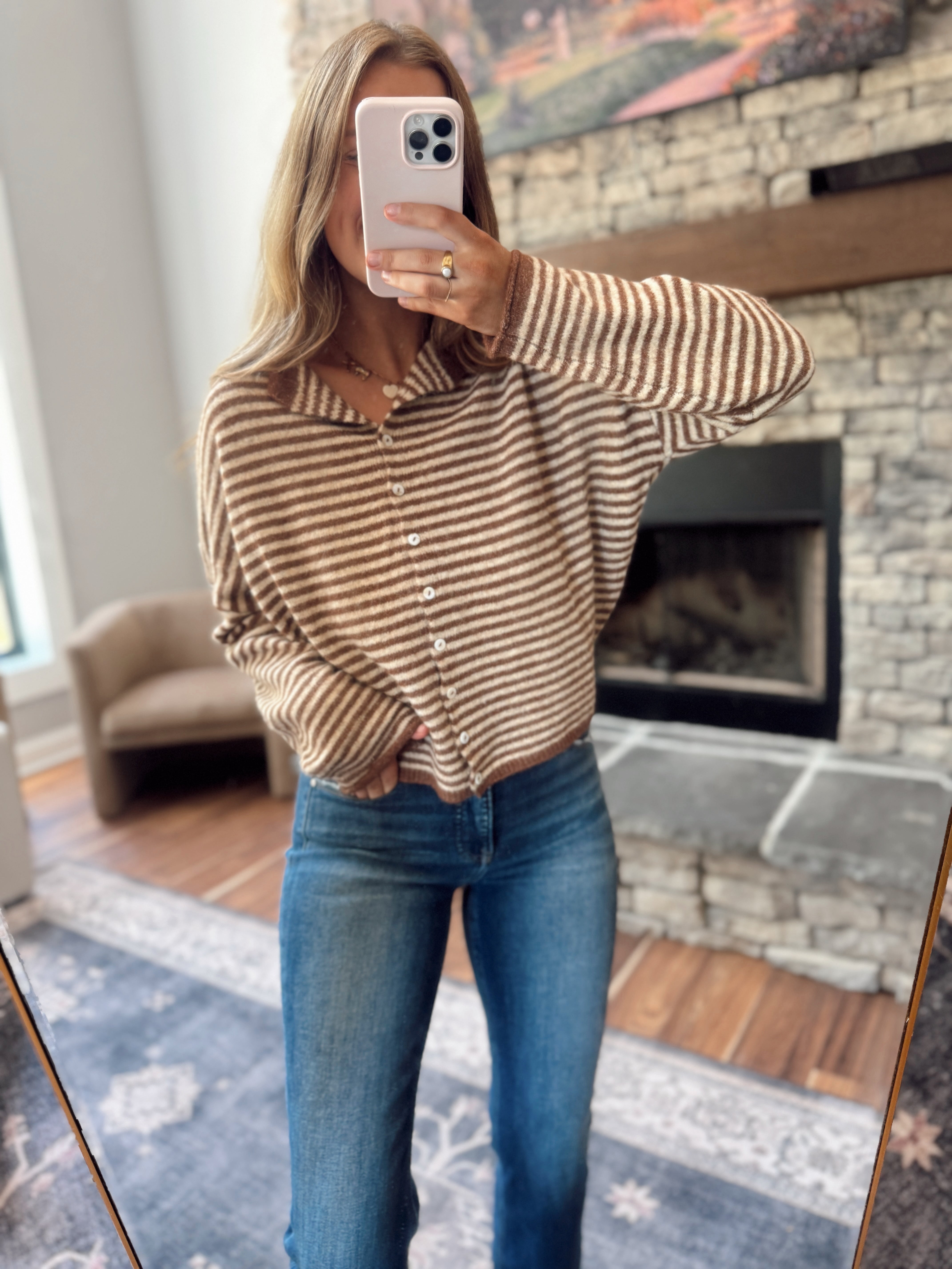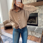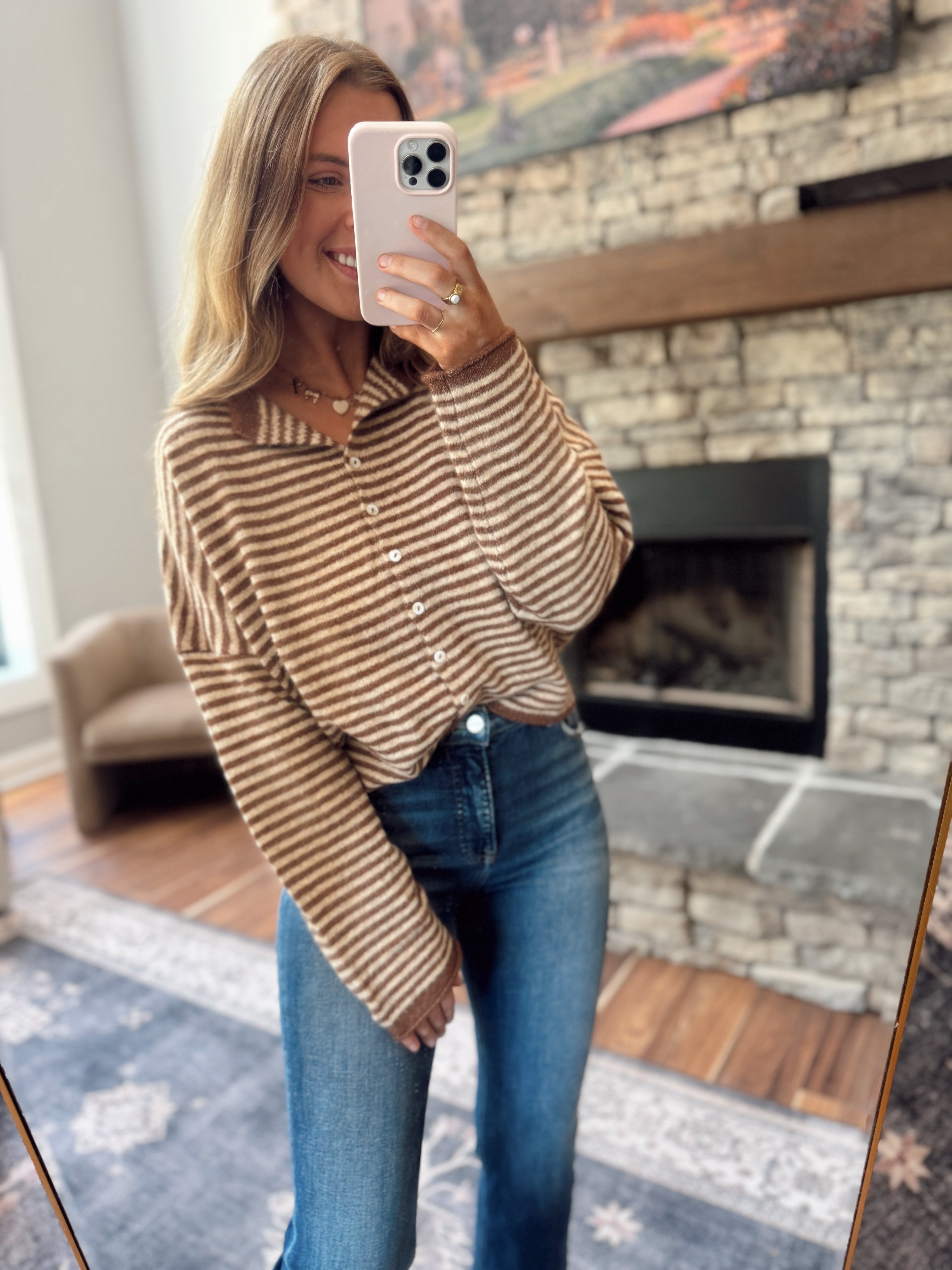 This one’s easy, cozy, and cute without trying too hard. The mini stripes give it that classic look, and the fit is just right for front tucks, layering, or tossing on with your favorite jeans.