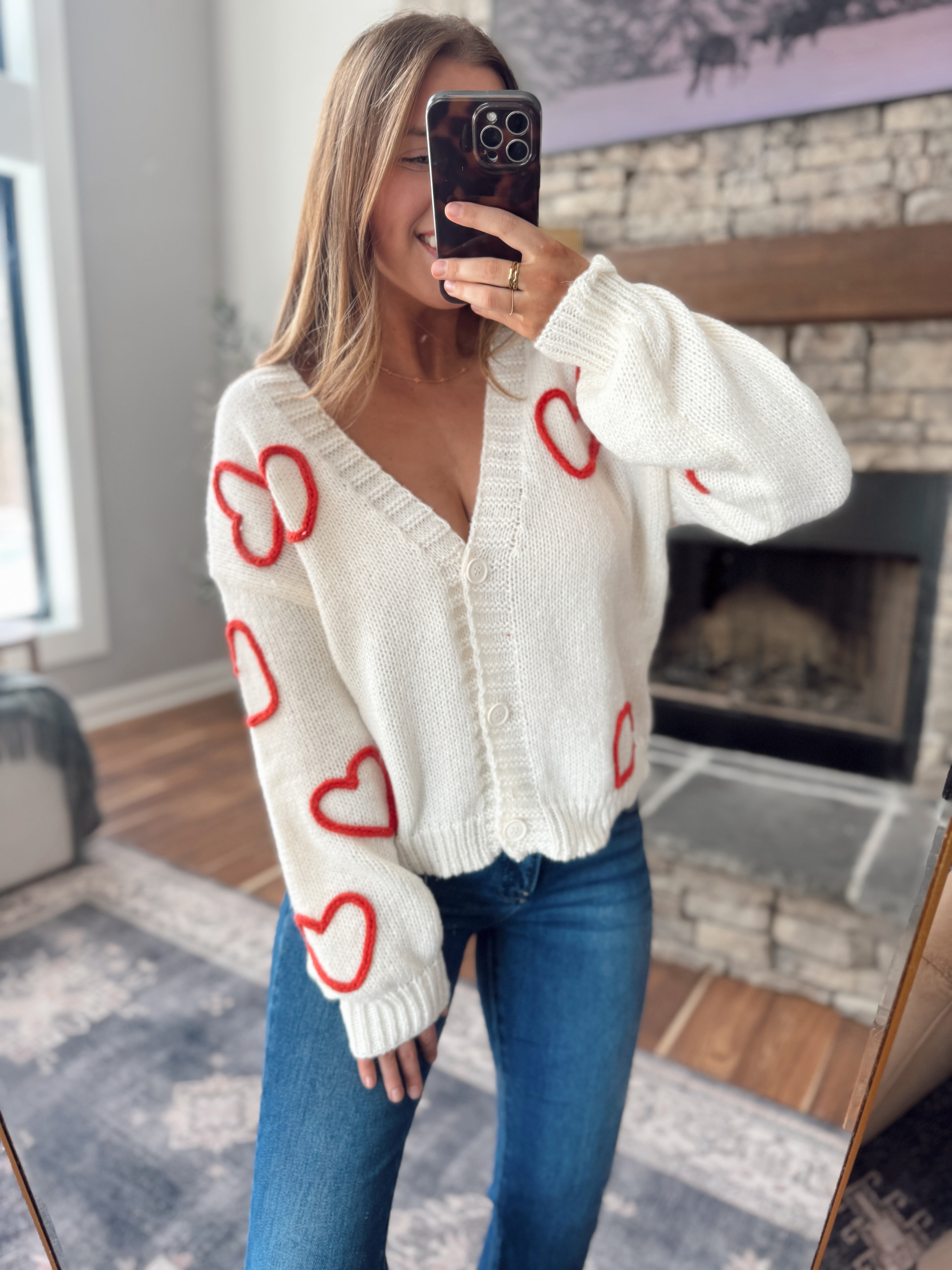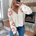 Sweet with a little edge — this ivory knit cardigan features bold red embroidered hearts that make it impossible not to fall in love. Designed with a flattering V-neck, functional buttons, and a relaxed-yet-polished fit, this is the kind of piece customers wear buttoned up OR open.