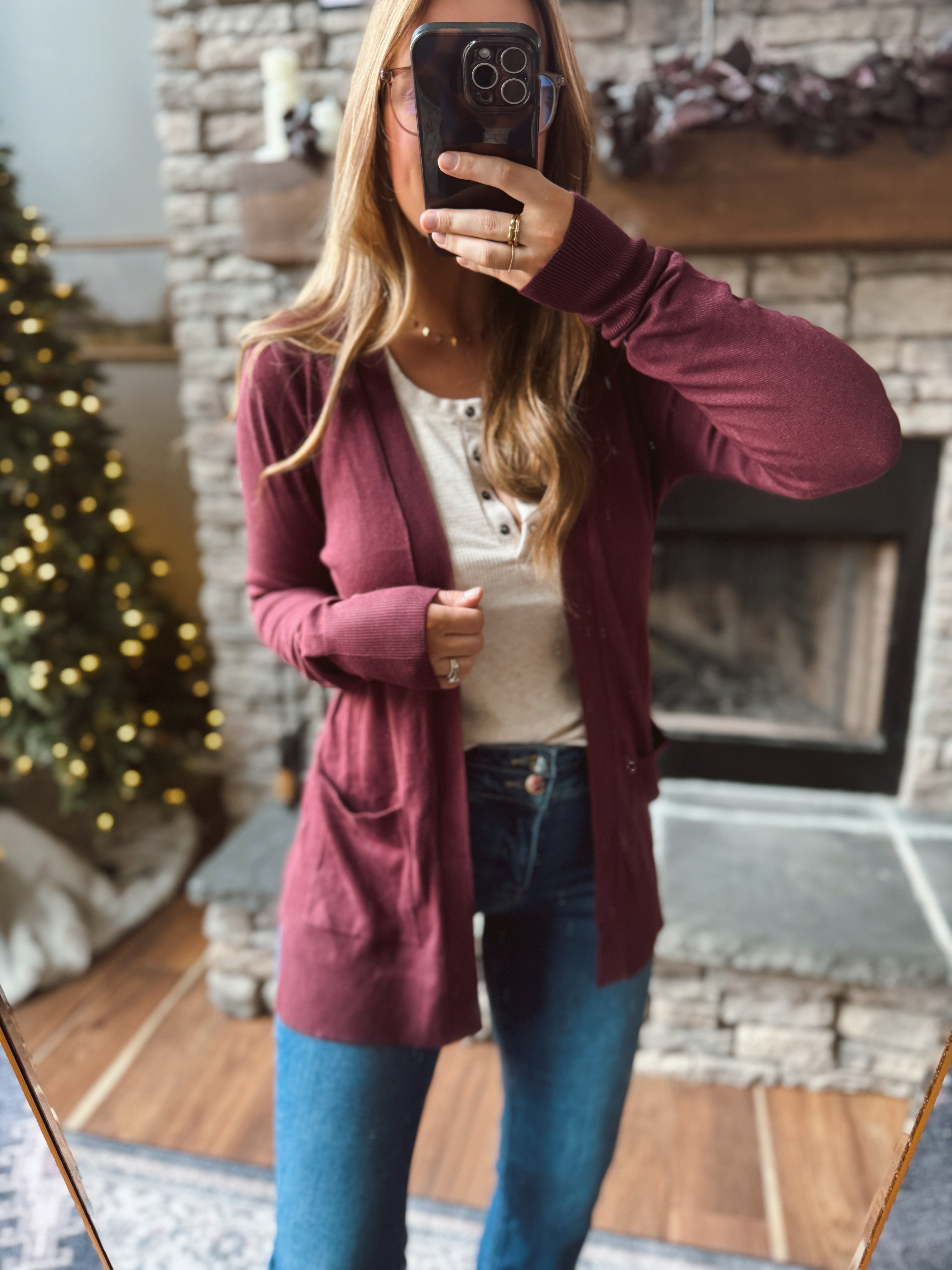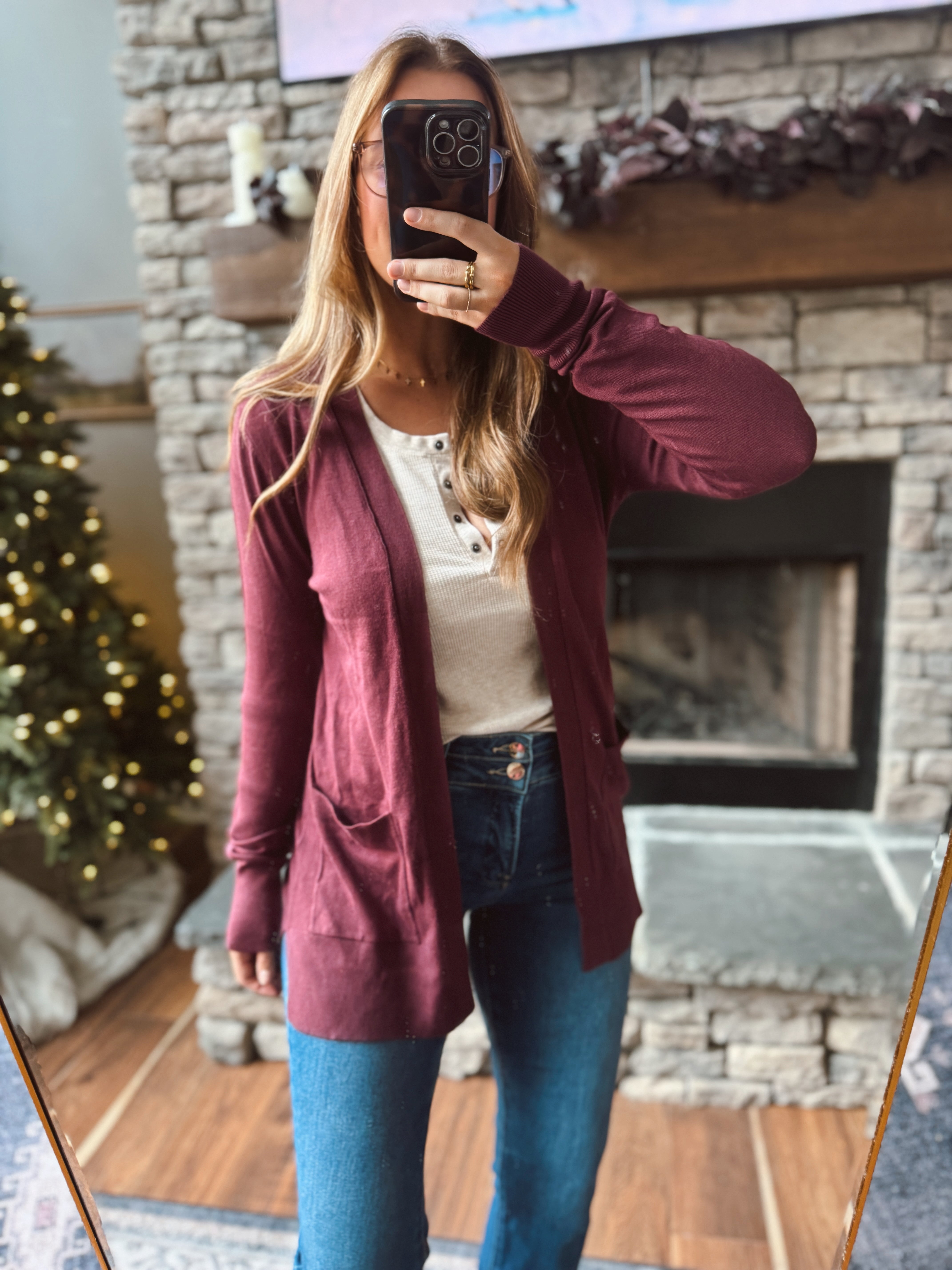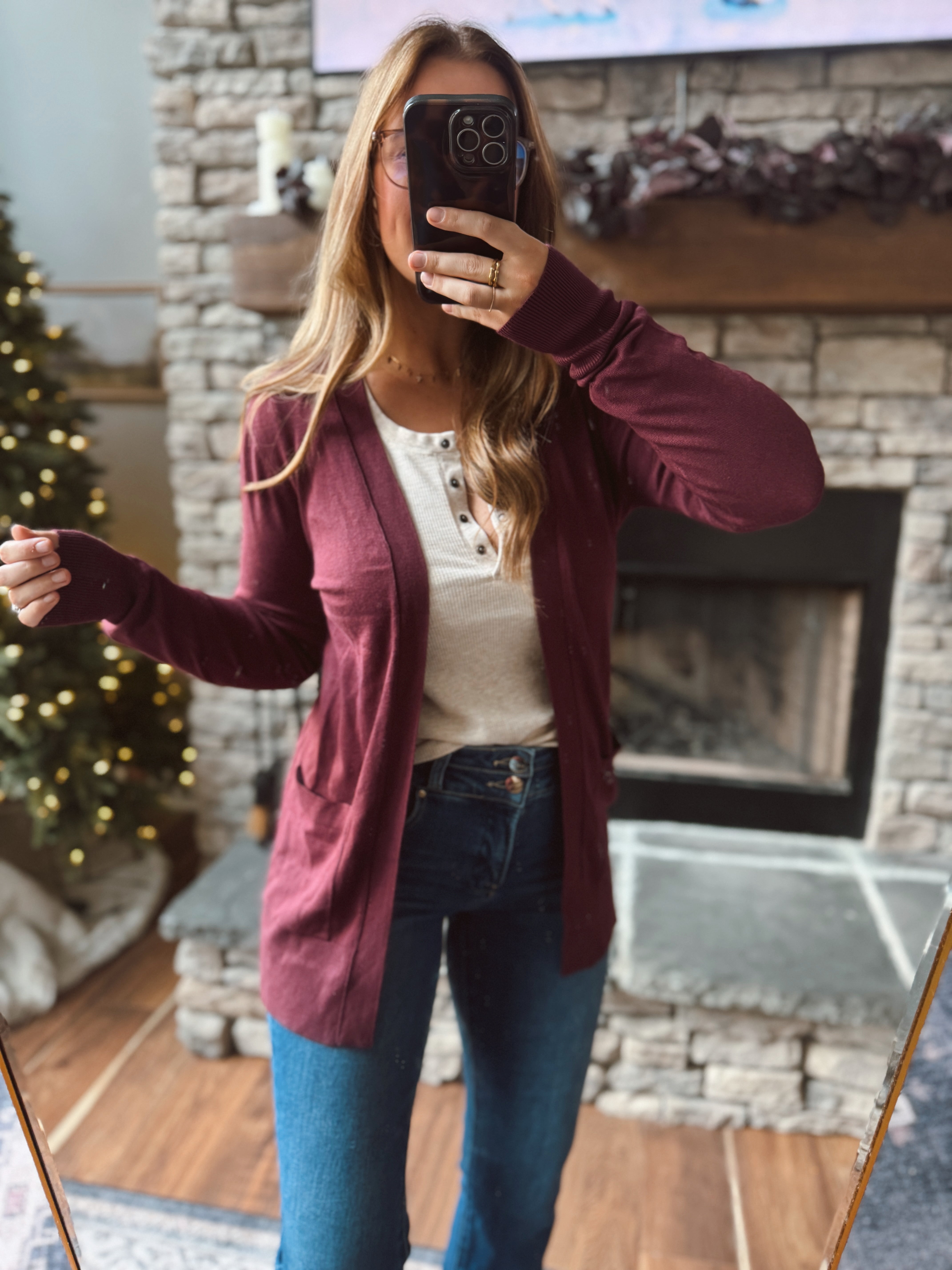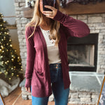 This wine-colored cardigan is that perfect layer you’ll reach for year-round — soft, breathable, and drapey without feeling heavy. Features an open front, side pockets, and a longline silhouette that pairs effortlessly with tees, tanks, or fitted tops. The fabric has a silky, smooth touch that feels amazing on the skin — cozy without the bulk.