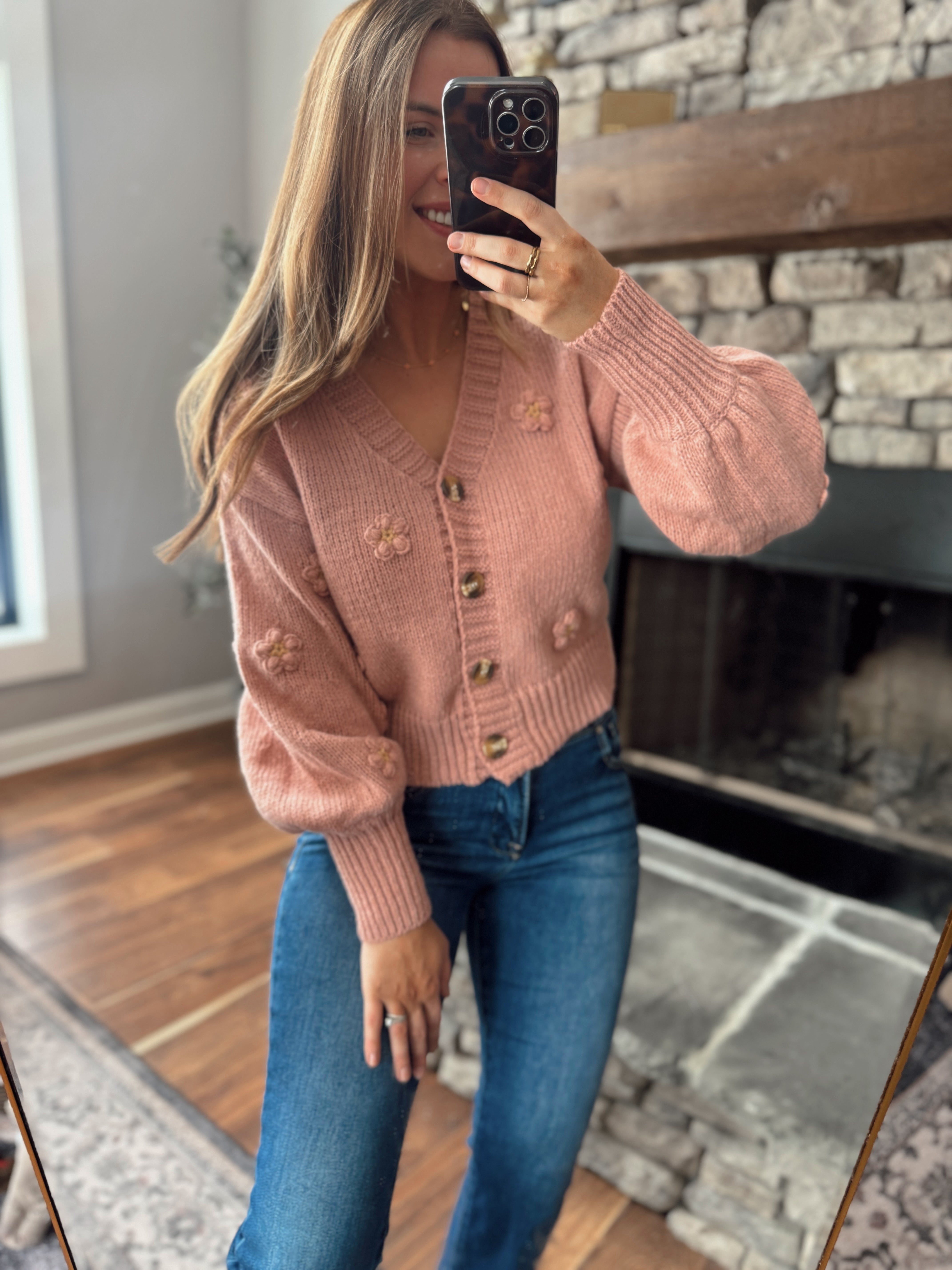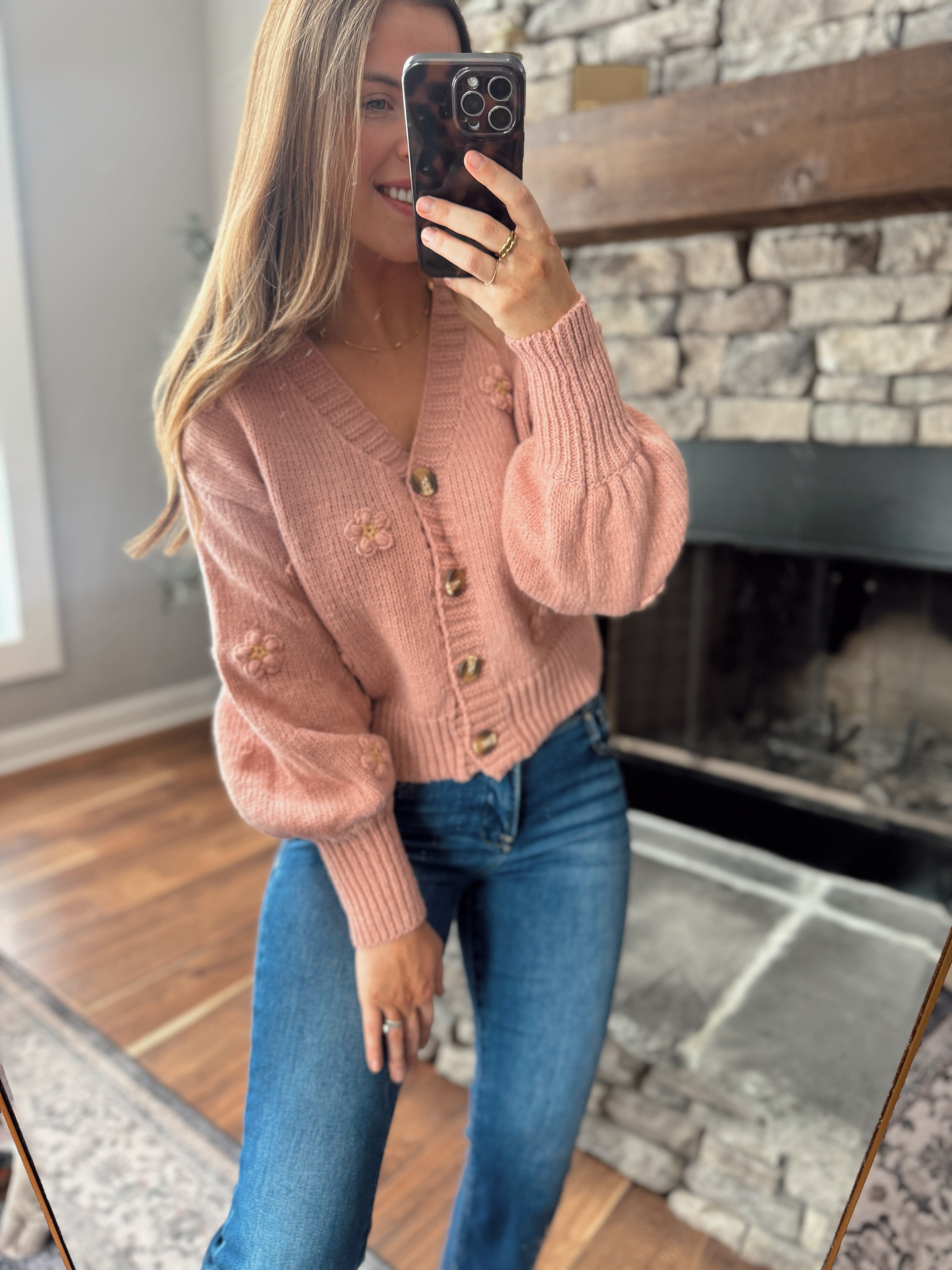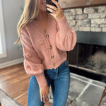 A soft statement piece you’ll fall in love with. This blush knit cardigan features delicate 3D floral appliqué details, a flattering V-neckline, and a cozy yet lightweight feel. Finished with subtle balloon sleeves and a cropped silhouette, it’s perfect worn buttoned up as a top or layered open for easy everyday styling.