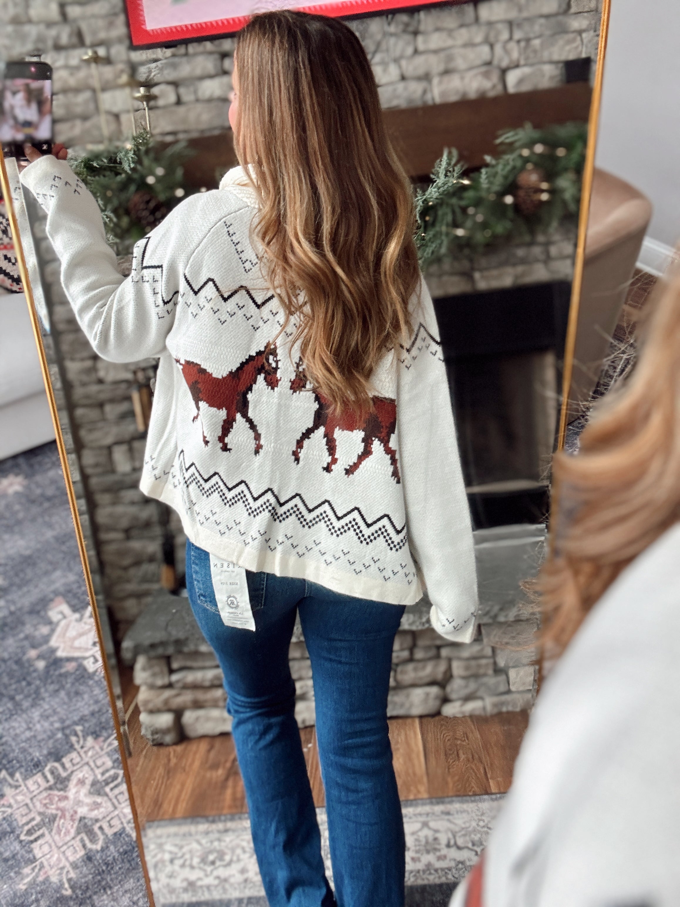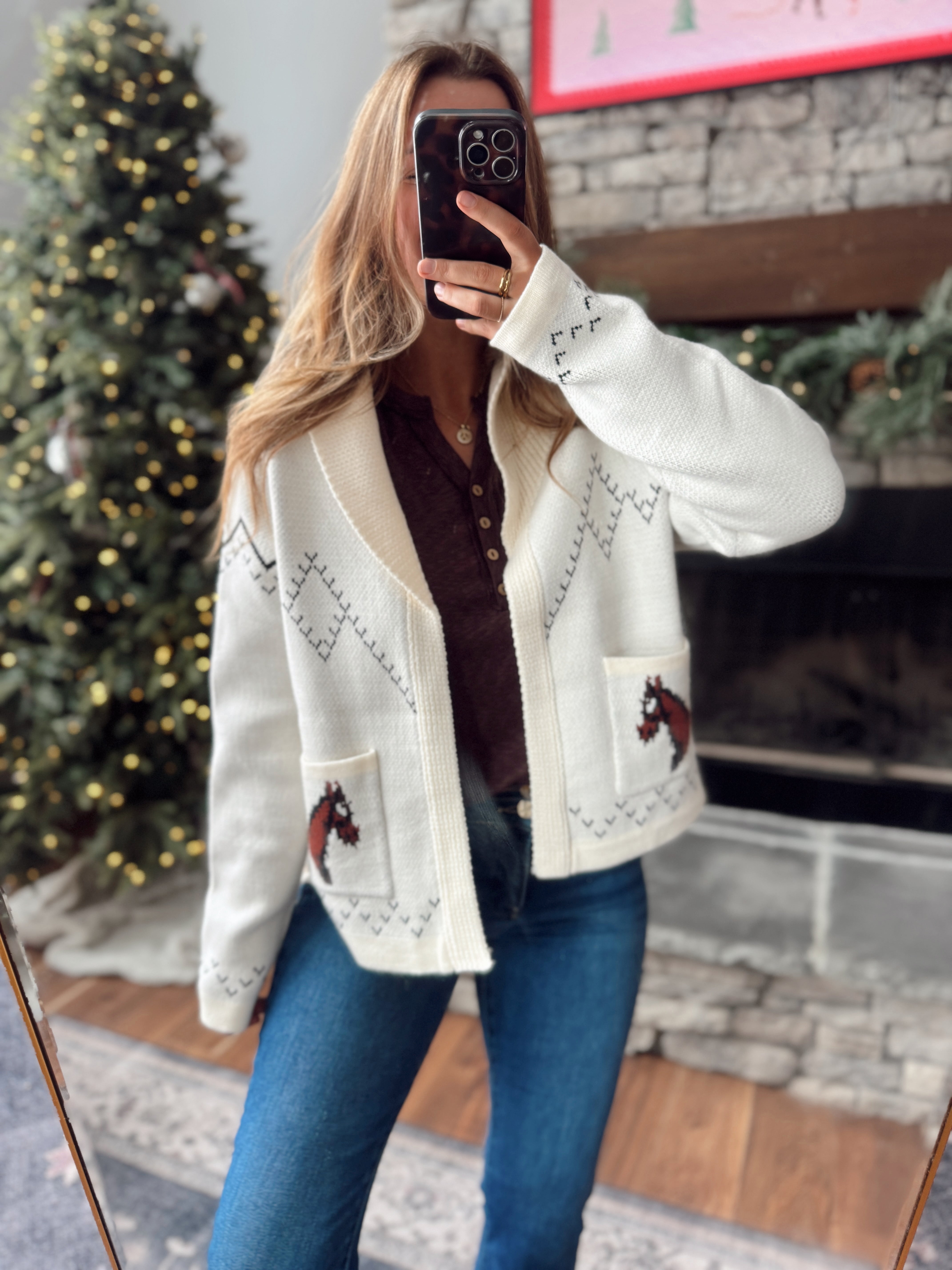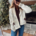 A statement piece with a cozy twist 🤍 This relaxed-fit knit cardigan features an eye-catching horse pattern across the back and pockets for a touch of western charm. The open front and soft, medium-weight knit make it the perfect layering piece for chilly days.