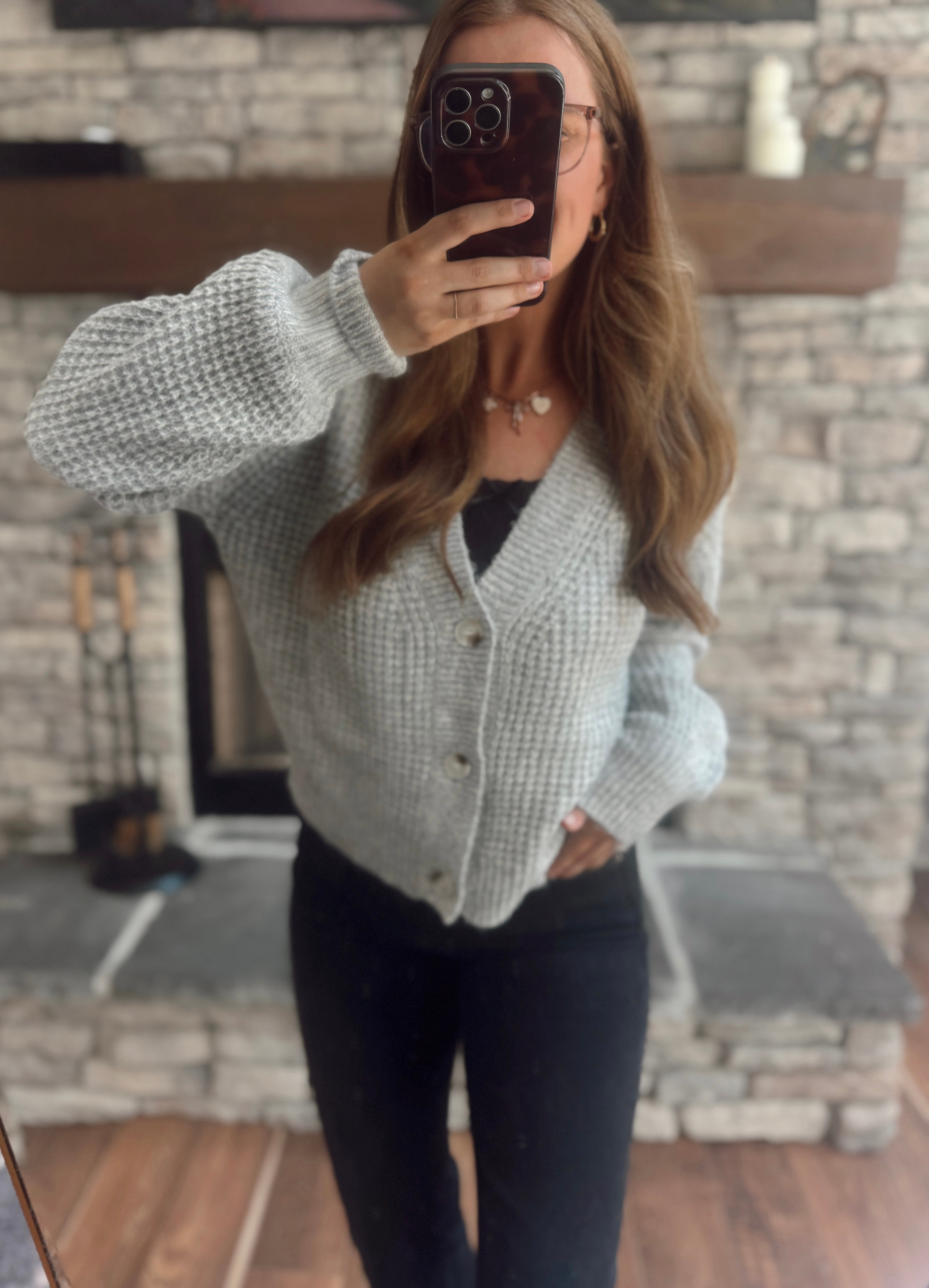 Wrap yourself in softness with this dreamy knit cardigan. Made from a super soft, textured knit, it’s the perfect layering piece for cooler days. Designed with a relaxed fit, button front closure, and a slightly cropped length, it’s easy to style with everything from denim to dresses. Balloon sleeves add the coziest touch.