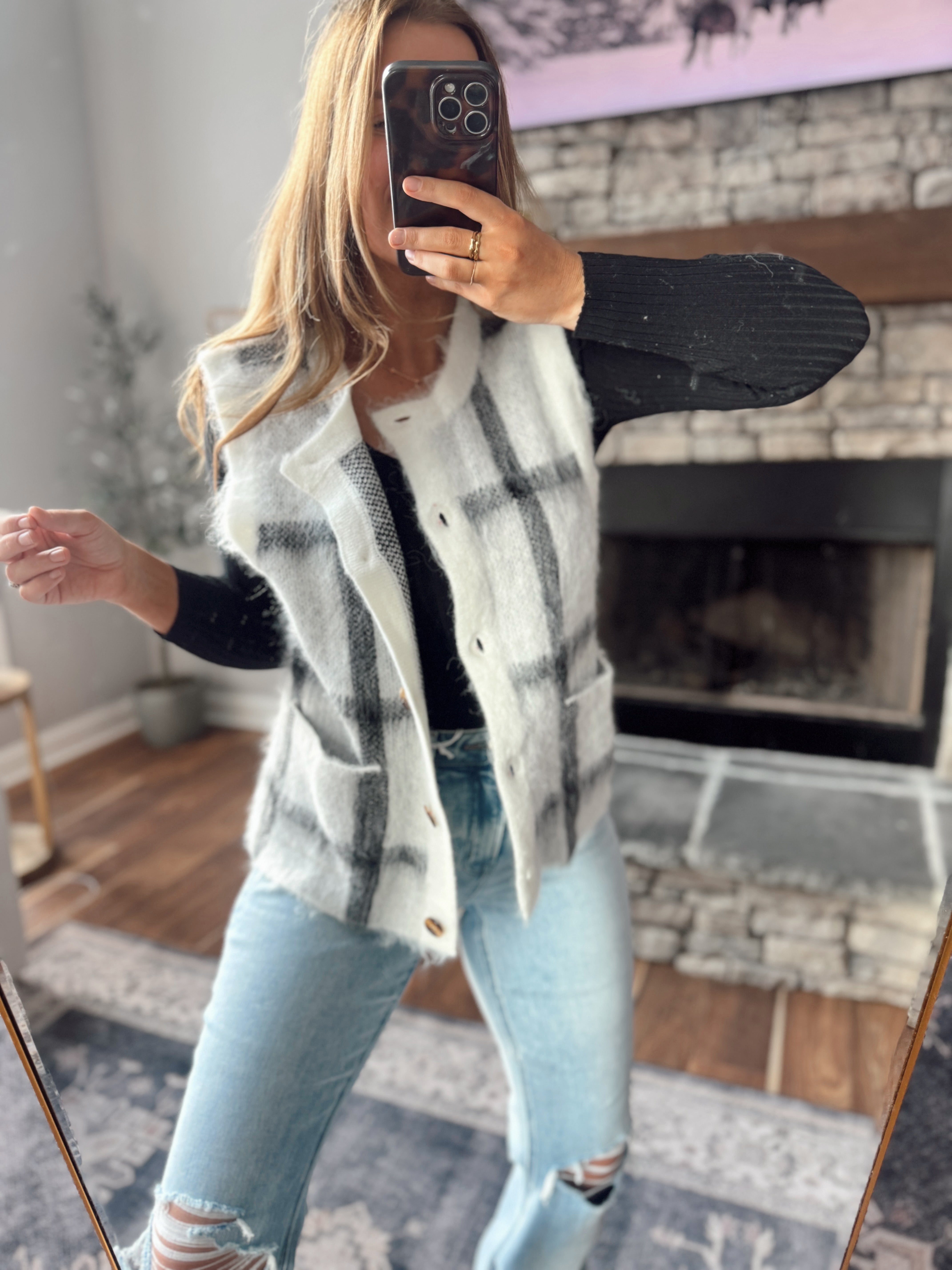 This is that throw-on-and-look-put-together layer you’ll reach for nonstop. Ultra-soft with a cozy brushed feel, this plaid sweater vest adds instant texture and warmth without bulk. Easy to layer over long sleeves, bodysuits, or knits — and cute enough to wear buttoned or open.