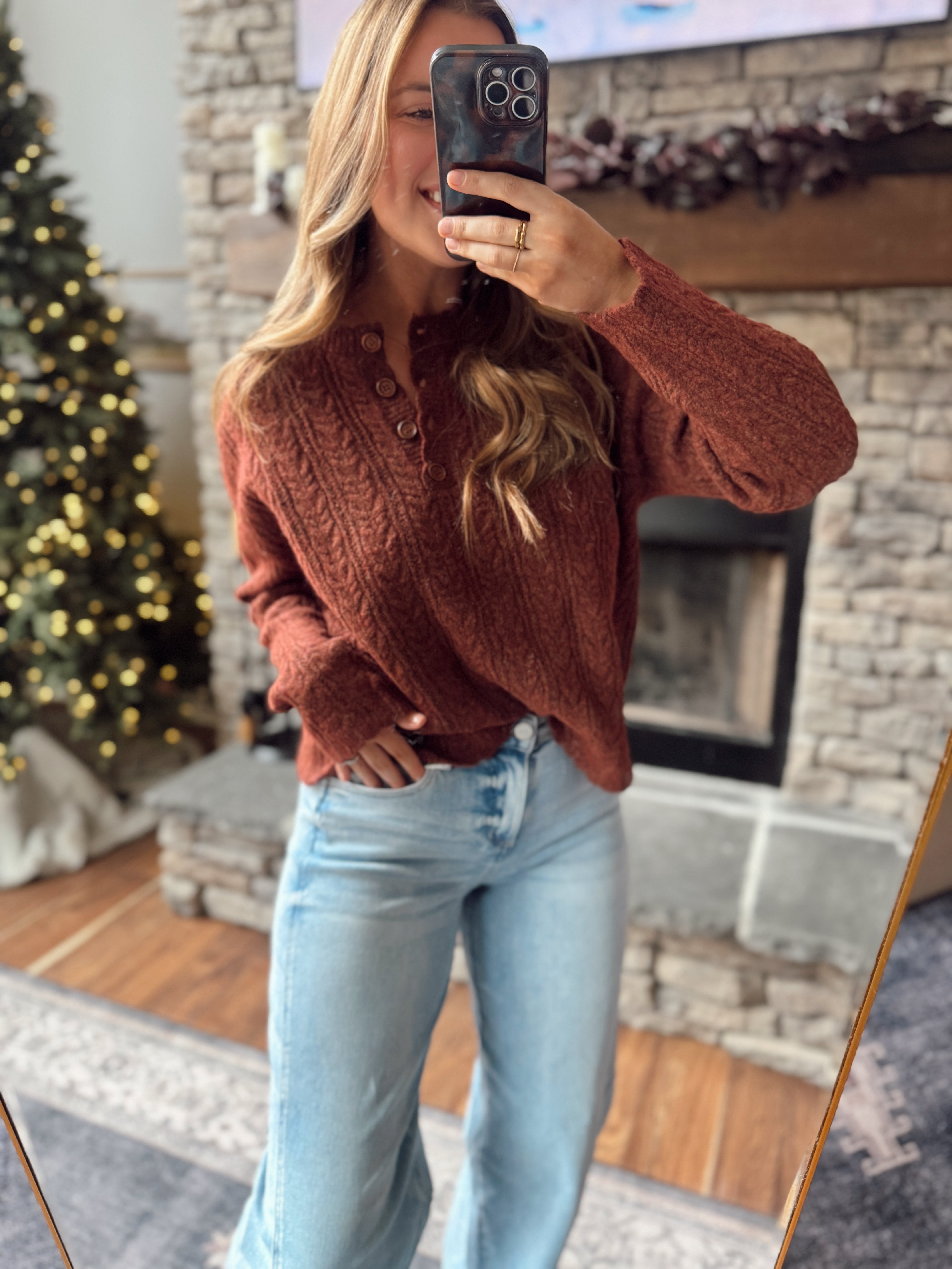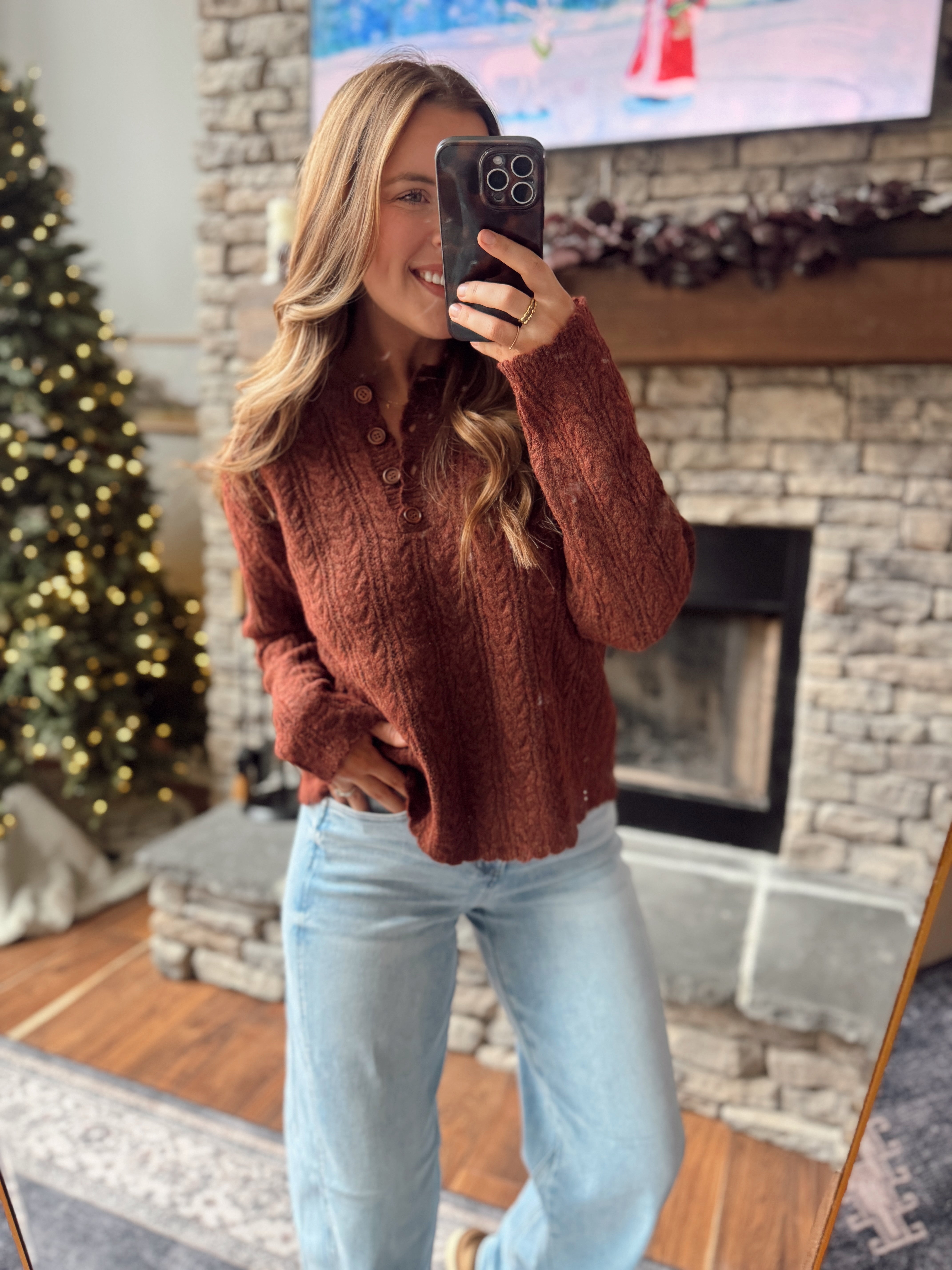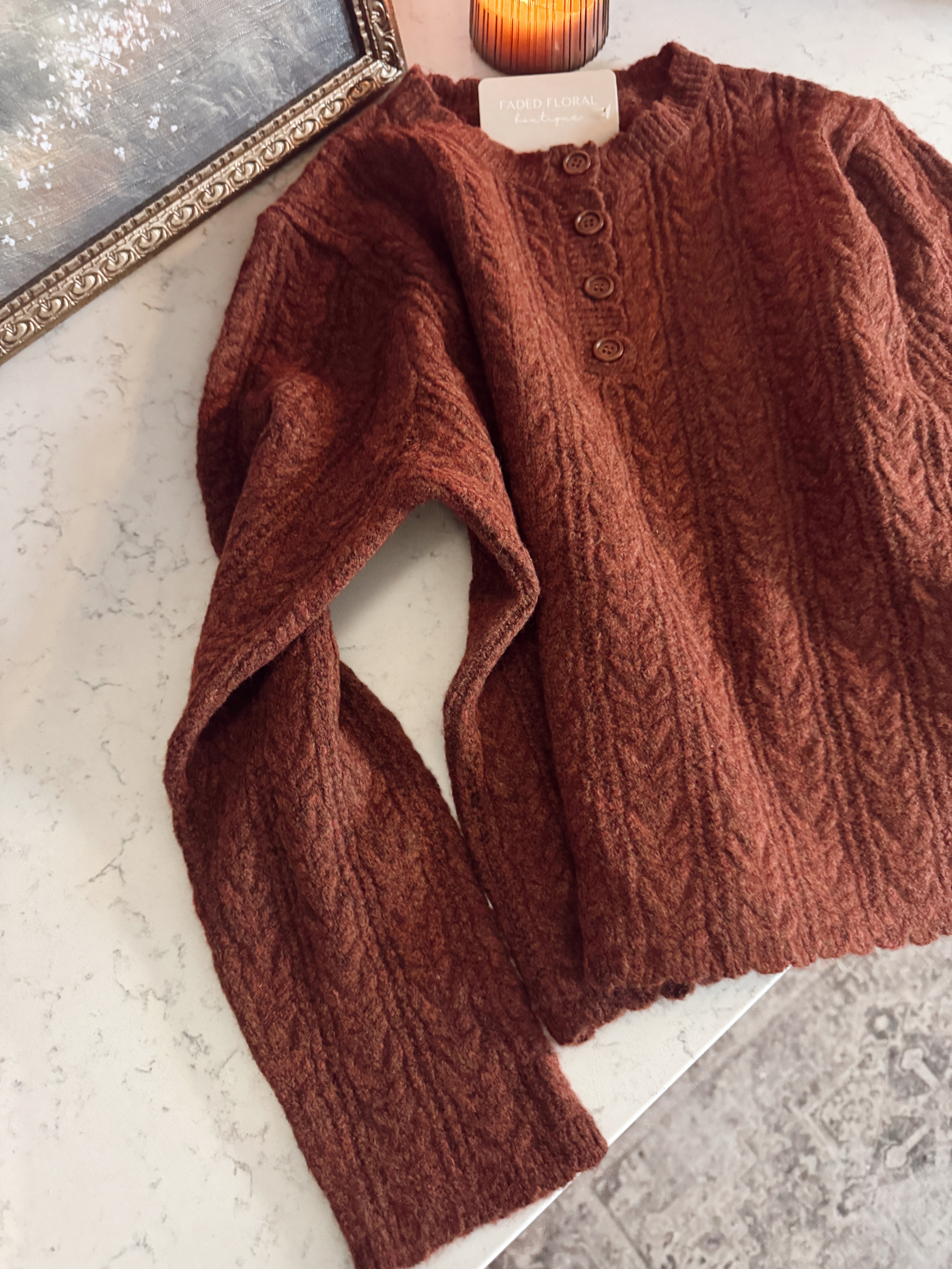 This cable knit sweater brings all the vintage charm — featuring functional wooden buttons, a textured cable design, and the softest medium-weight knit. The relaxed fit pairs perfectly with denim, wide-leg pants, or even a mini skirt and boots for that classic winter look. Cute, comfy, and full of detail you’ll love.