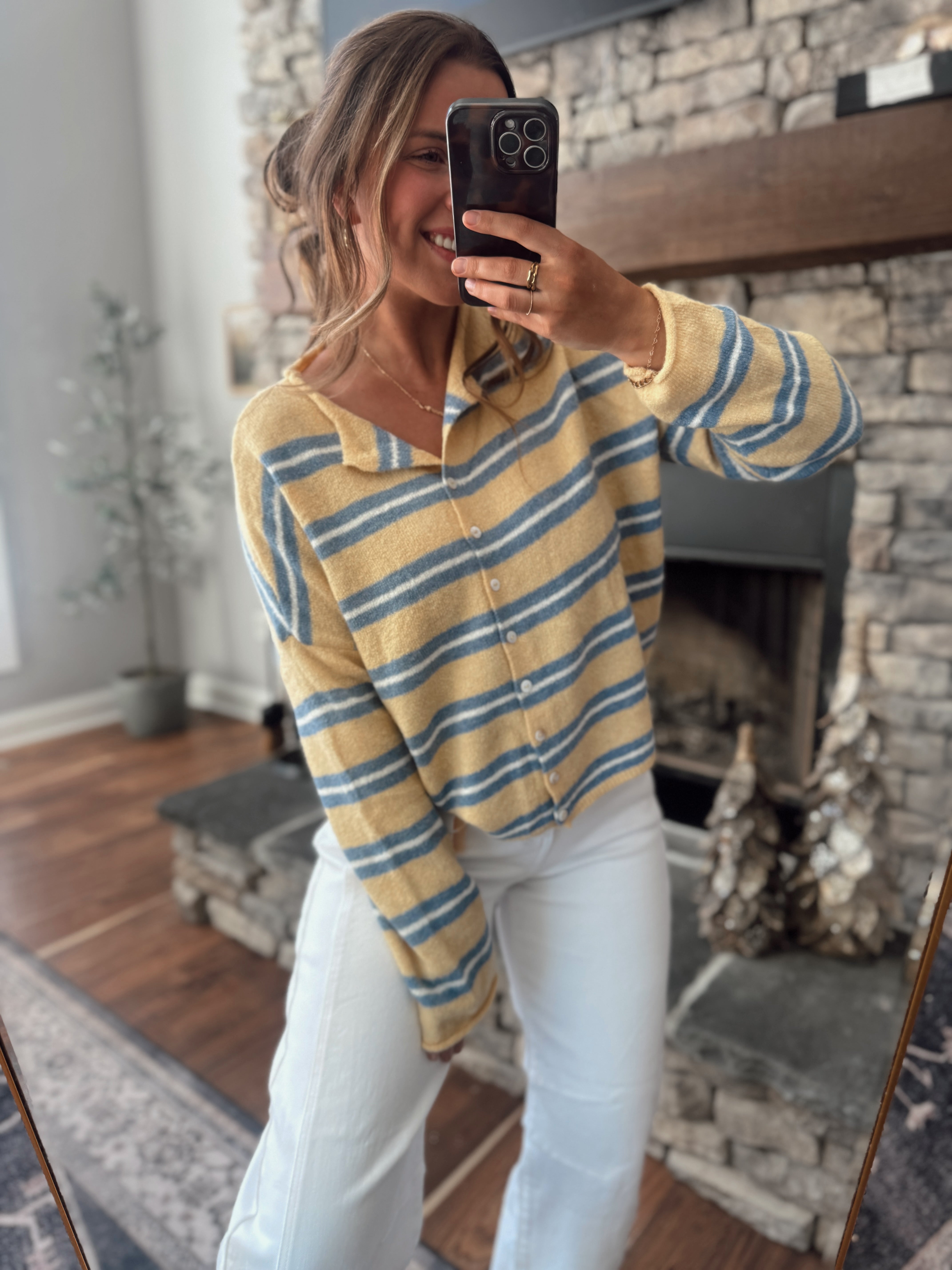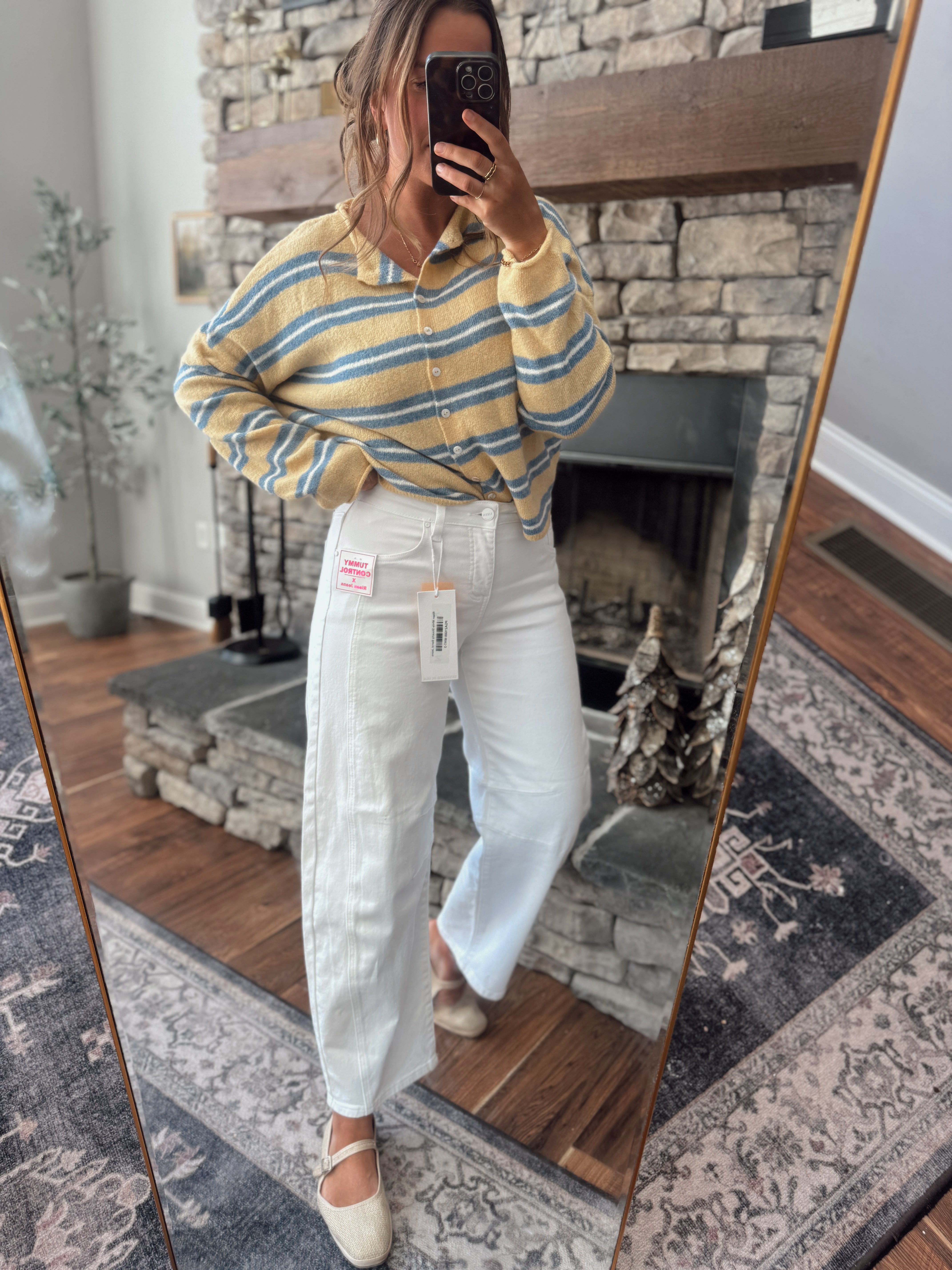 This one’s easy, cozy, and cute without trying too hard. The varsity stripes give it that classic varsity look, and the fit is just right for front tucks, layering, or tossing on with your favorite jeans.