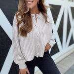 An effortless layer you’ll keep reaching for. This chunky knit cardigan has the perfect slouchy fit with oversized buttons and balloon-style sleeves for that extra cozy vibe. Whether you’re styling it buttoned-up as a top or layering it over your basics, it’s the throw-on-and-go piece that works every time.