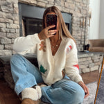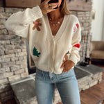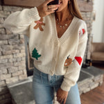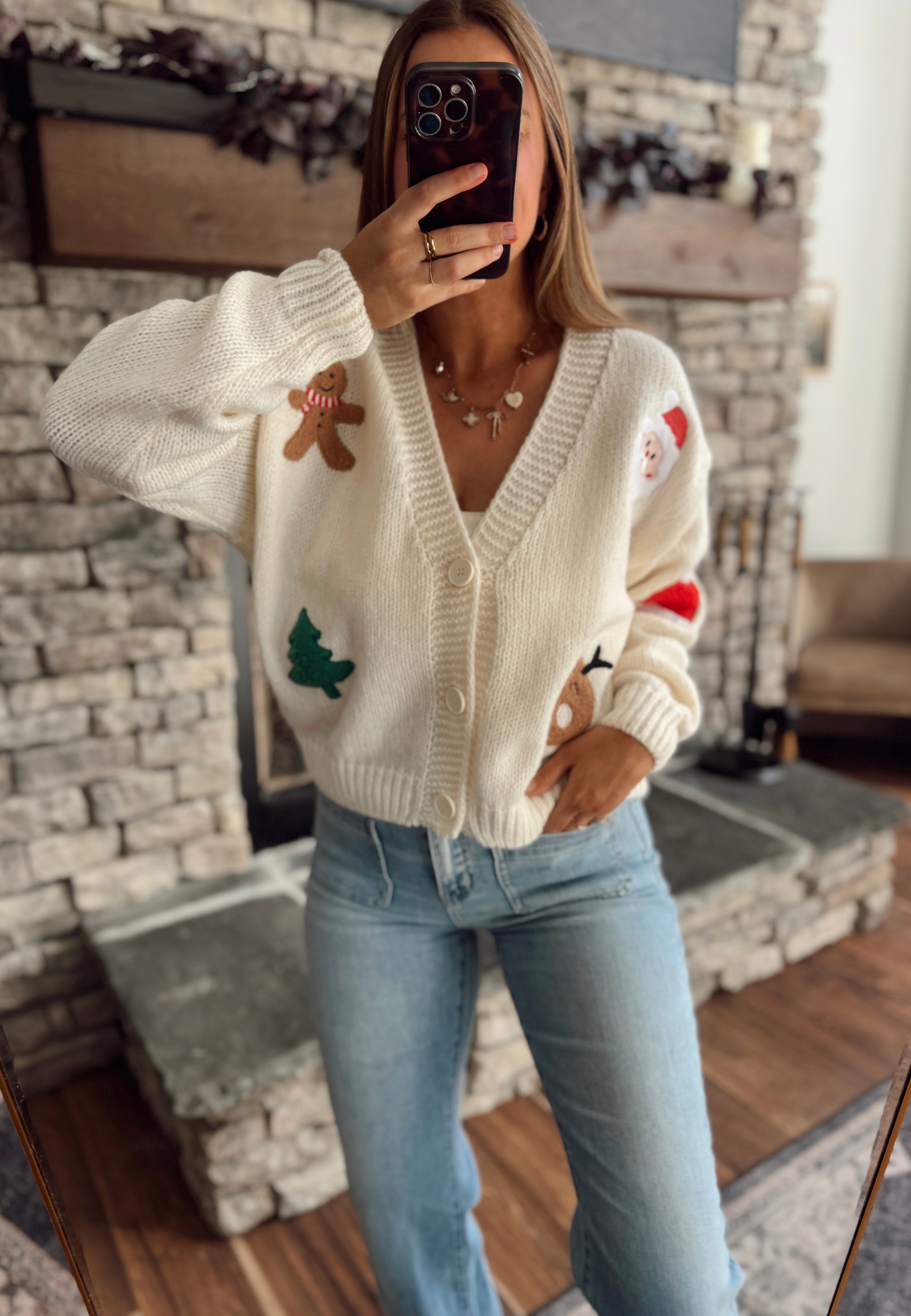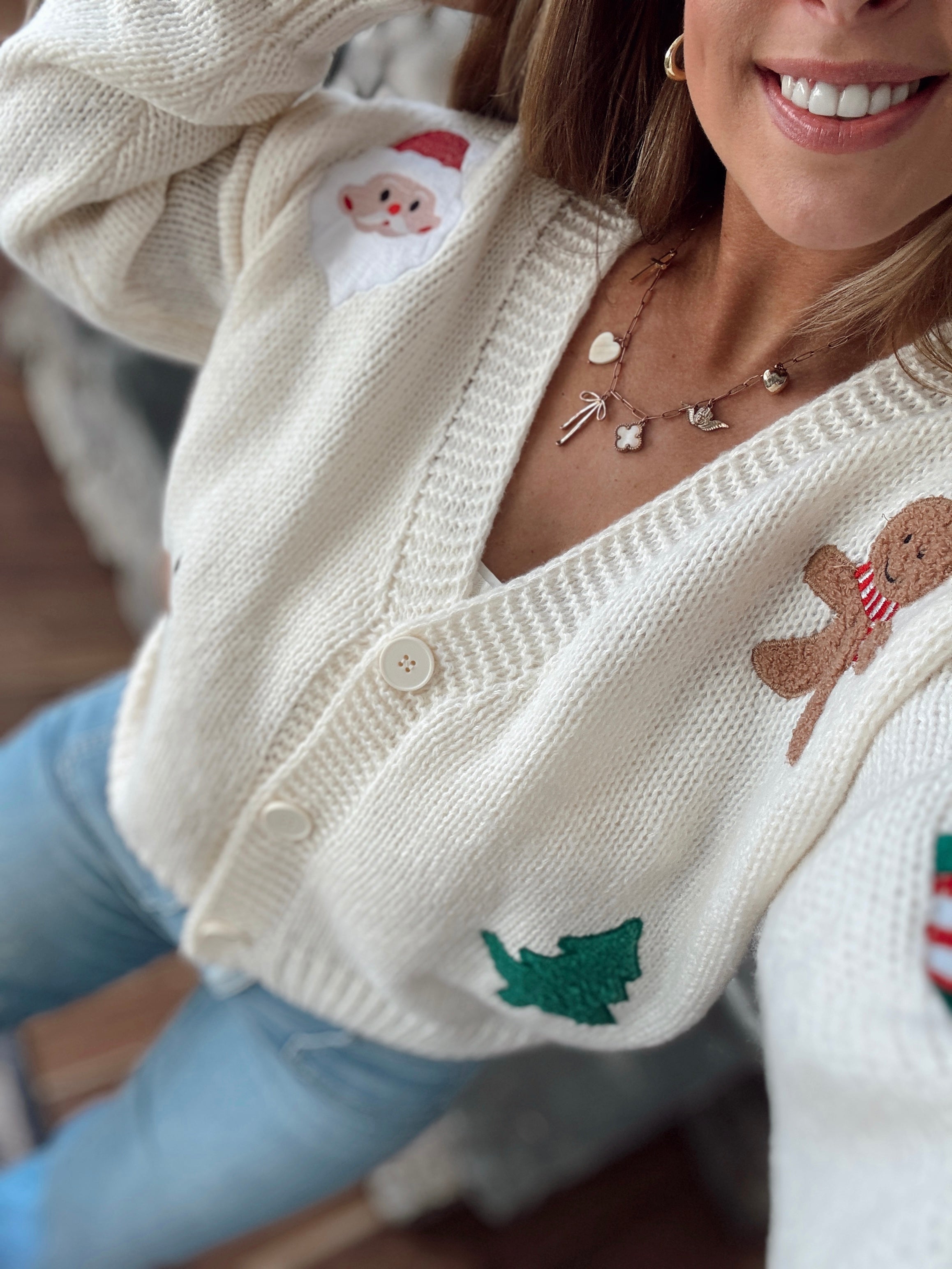 This one’s serving all the festive feels. Featuring playful Christmas patches — Santa, gingerbread man, trees, and more — this soft knit cardigan is the perfect cozy layer for the season.