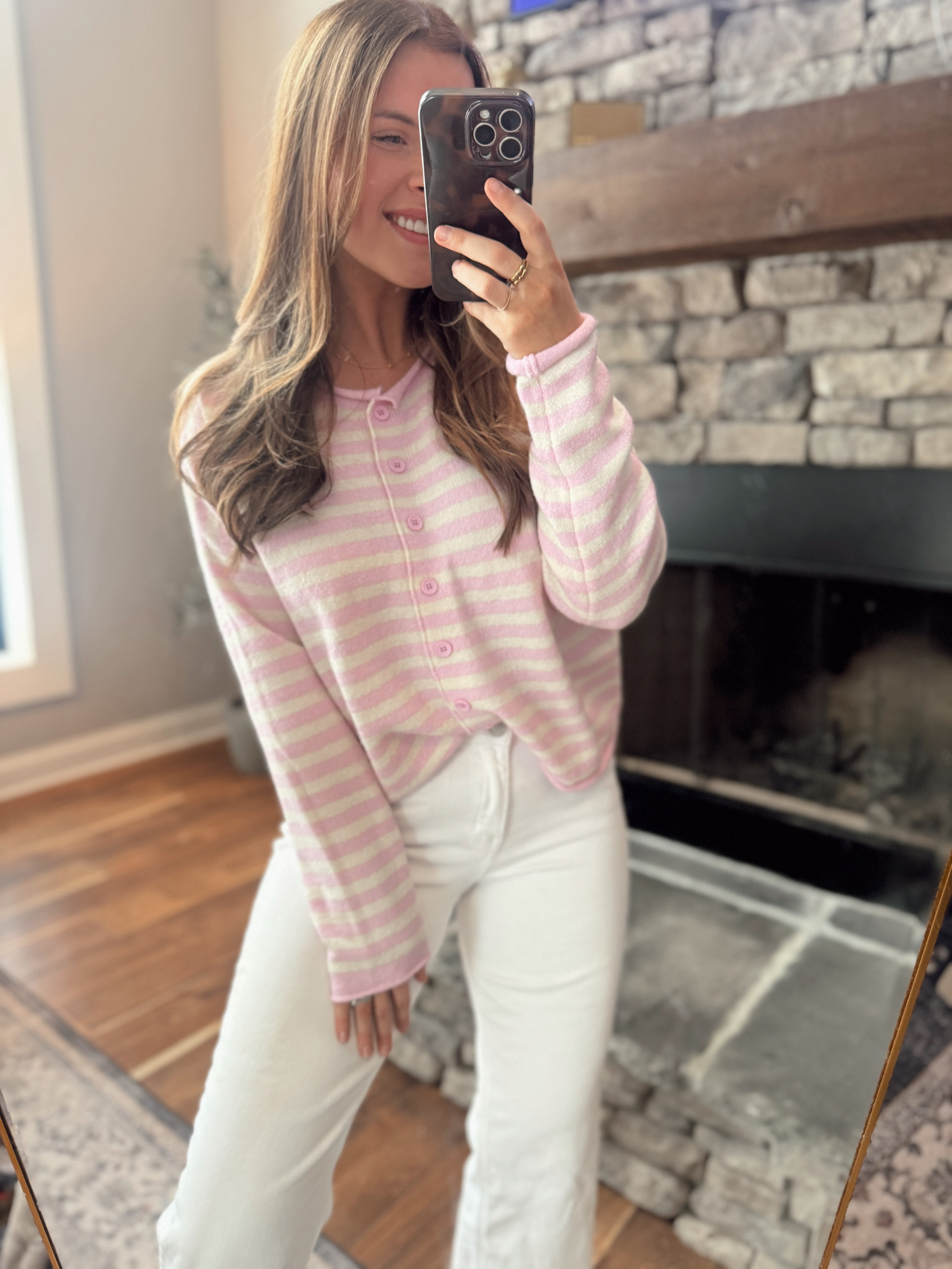 Sweet, soft, and effortlessly wearable—this lavender pink striped knit cardigan is a spring staple. Designed with a cozy lightweight knit, a classic crew neckline, and functional button front, it’s perfect worn buttoned up as a top or layered open for an easy everyday look. The subtle stripe pattern keeps it playful while still feeling polished.