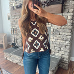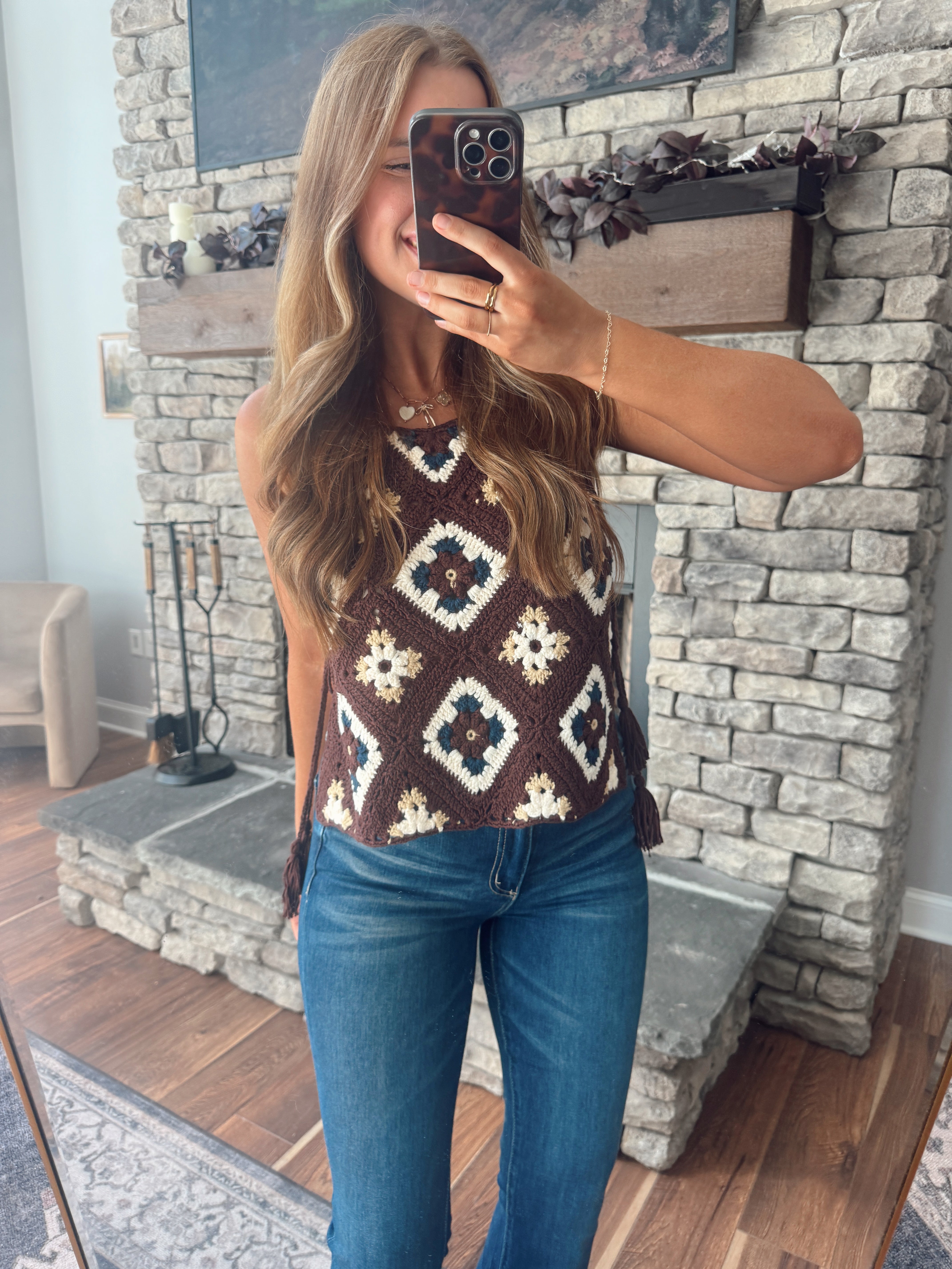 This top is giving boho perfection 🌼 The soft crochet knit features a retro-inspired diamond floral pattern in rich fall tones. Open tassel-tie sides add a playful touch (and the cutest fit), making it an easy statement piece for layering or wearing solo.