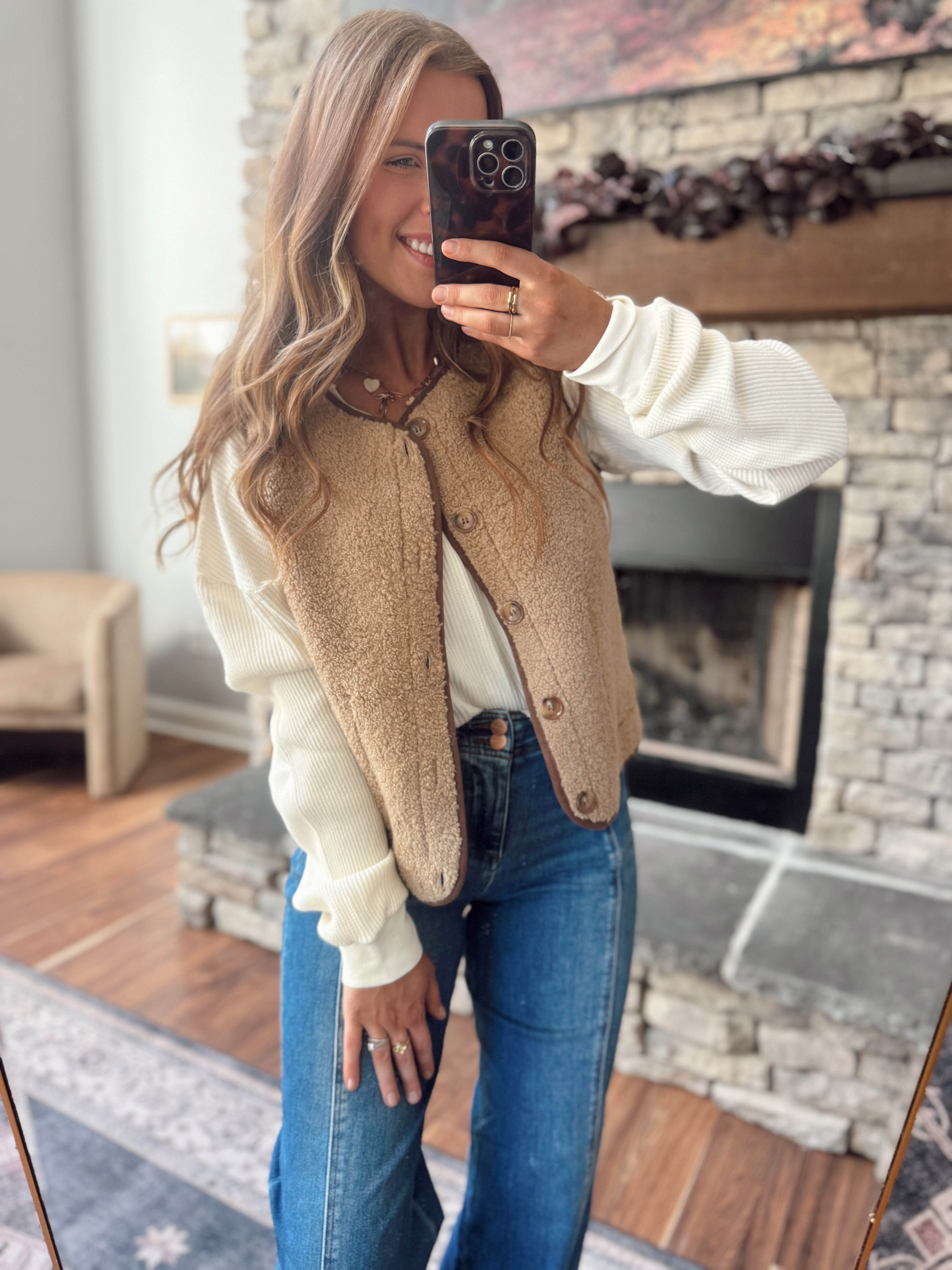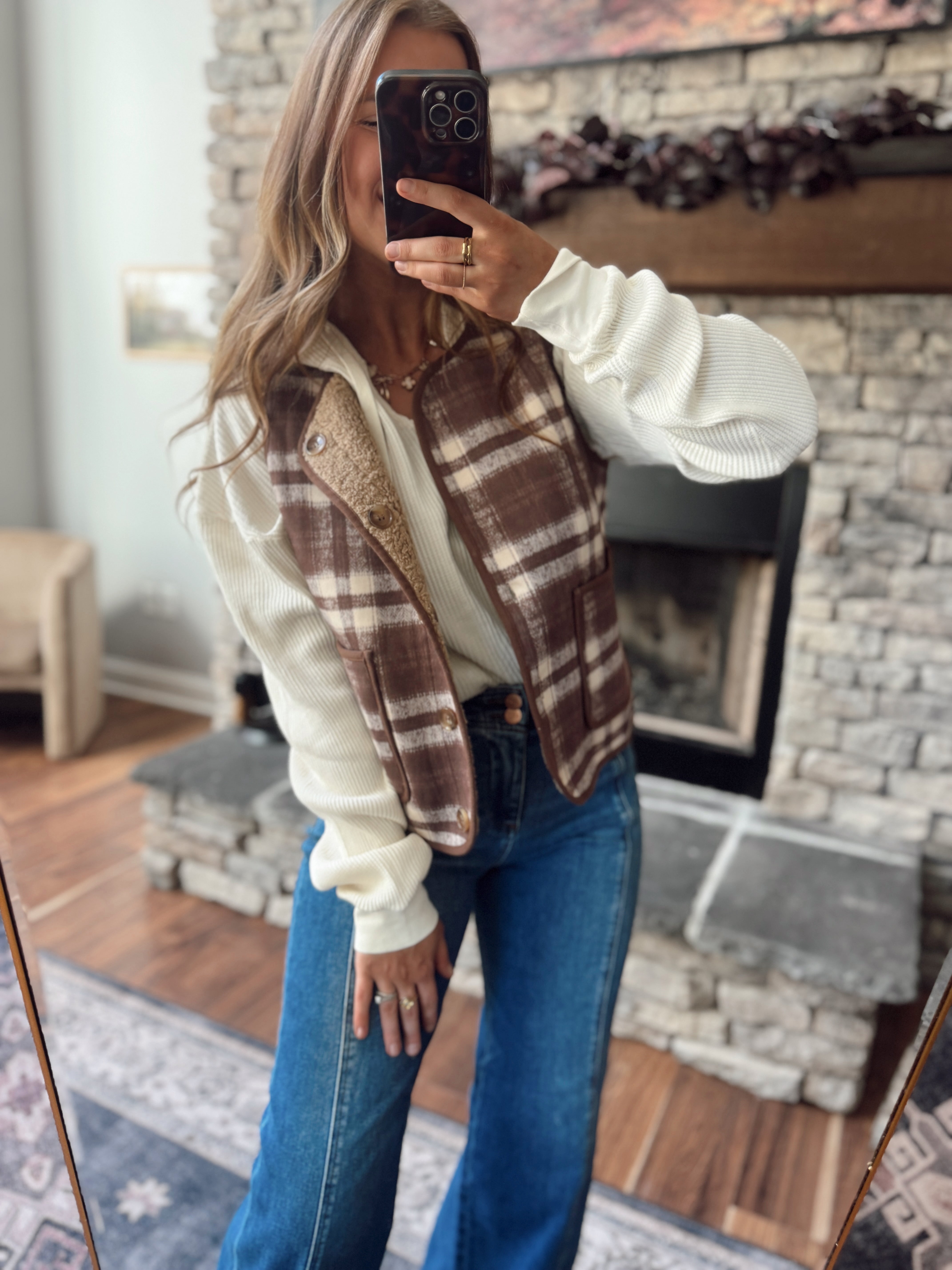 Double the cozy, double the charm. This reversible sherpa vest is the ultimate fall layering piece — soft, warm, and effortlessly cute. One side features a classic plaid pattern for a rustic, outdoorsy vibe, while the other is a solid sherpa that gives all the warm-hug feels. Style it over a long sleeve or flannel for that perfectly put-together look.
