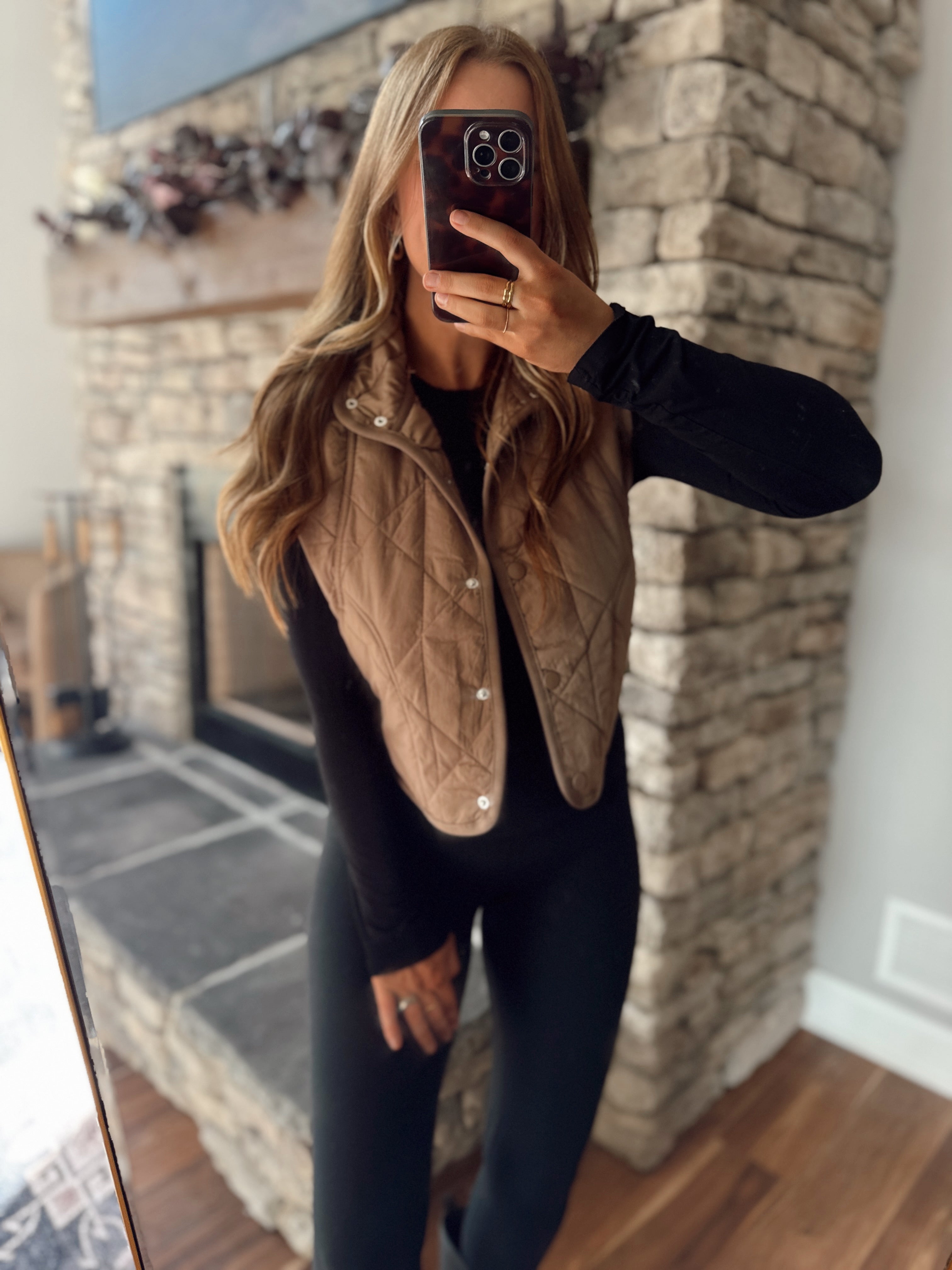 Elevate your layering game with this lightweight quilted vest — the perfect mix of cozy and chic. Featuring a snap-button front, soft padding, and a timeless diamond-stitched design, it adds instant polish to any look. Style it over a basic long sleeve, hoodie, or flannel for effortless fall layering.