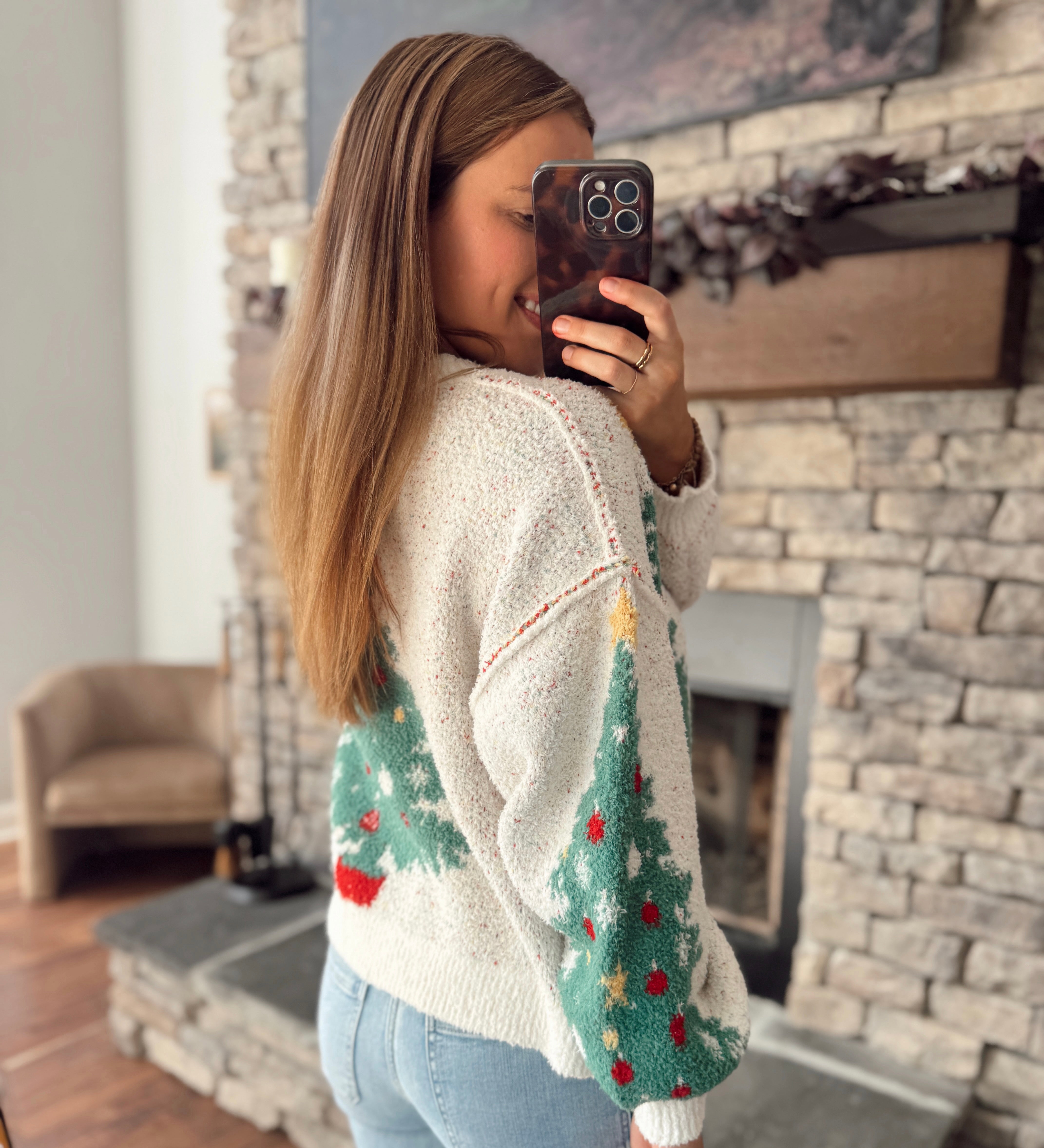 Bring all the festive vibes with this soft and snuggly knit cardigan. The holiday tree detail on the sleeves and back adds the perfect pop of Christmas cheer without going over the top.