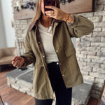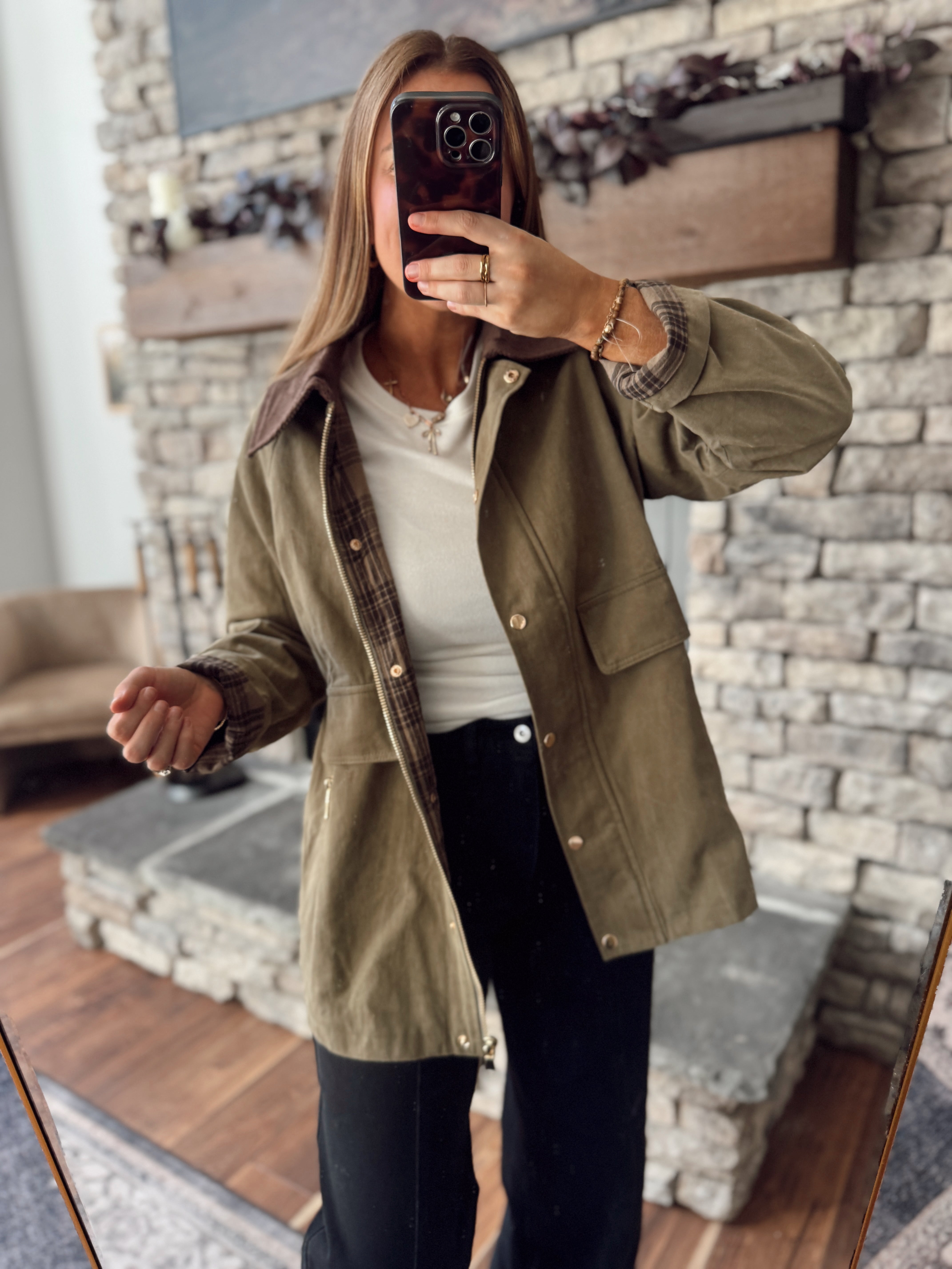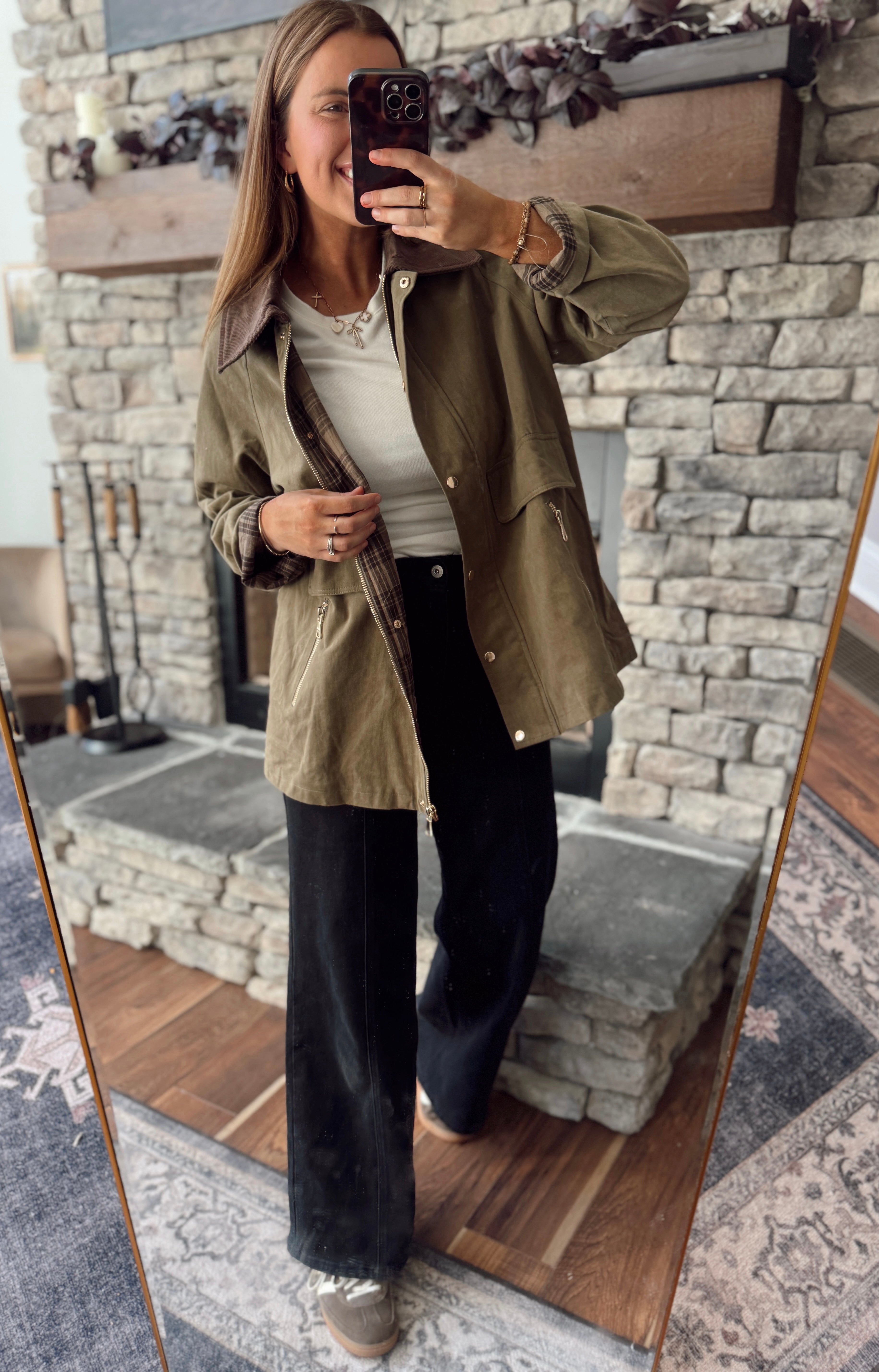 A classic with a twist. This olive utility jacket is made for layering and easy fall styling. It features a cozy plaid inner lining, functional front pockets, zip and snap closure, and the perfect structured yet relaxed fit. The contrast corduroy collar gives it that timeless, outdoorsy vibe while still feeling polished.