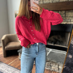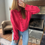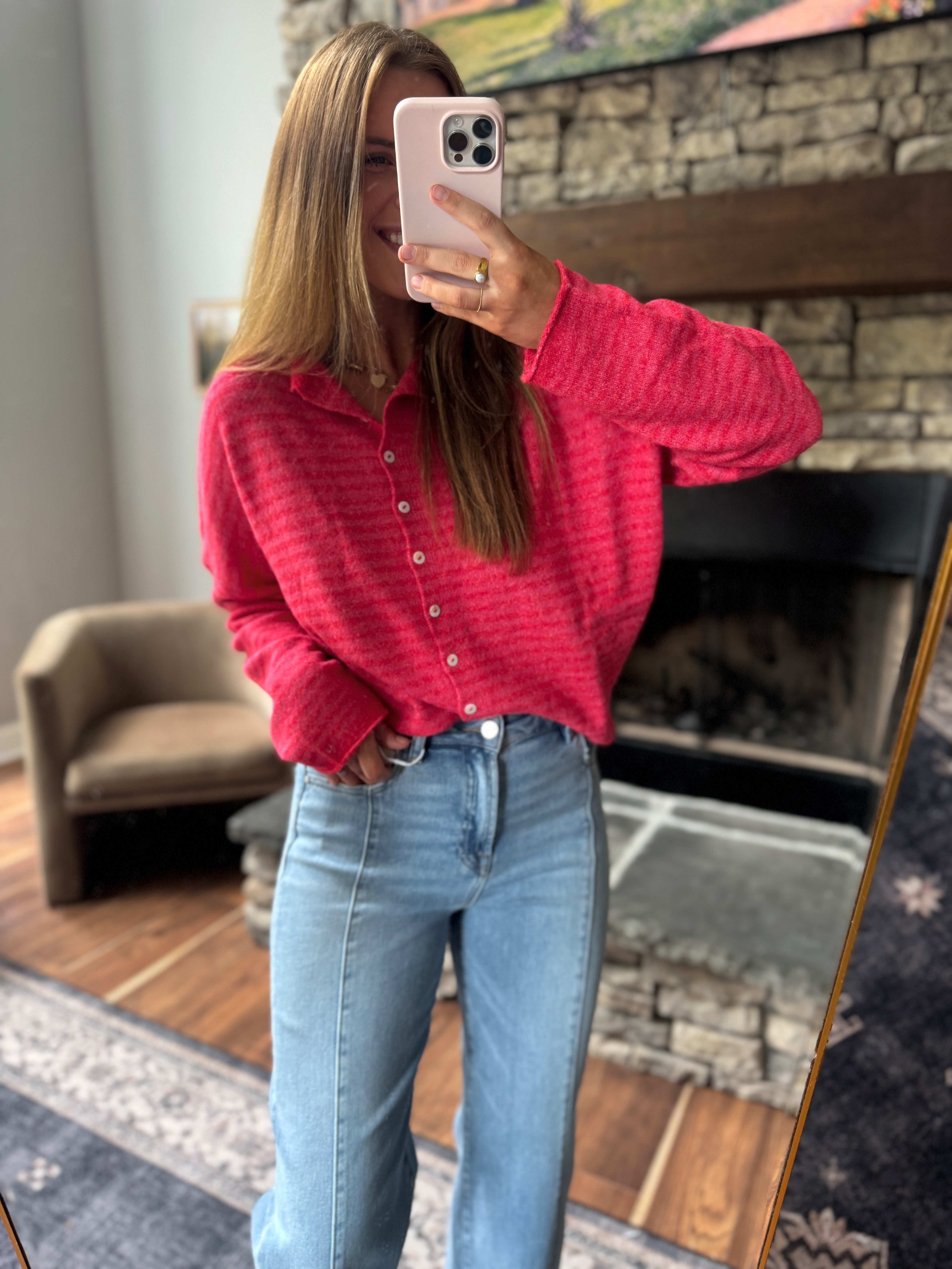 This one’s easy, cozy, and cute without trying too hard. The mini stripes give it that classic look, and the fit is just right for front tucks, layering, or tossing on with your favorite jeans.