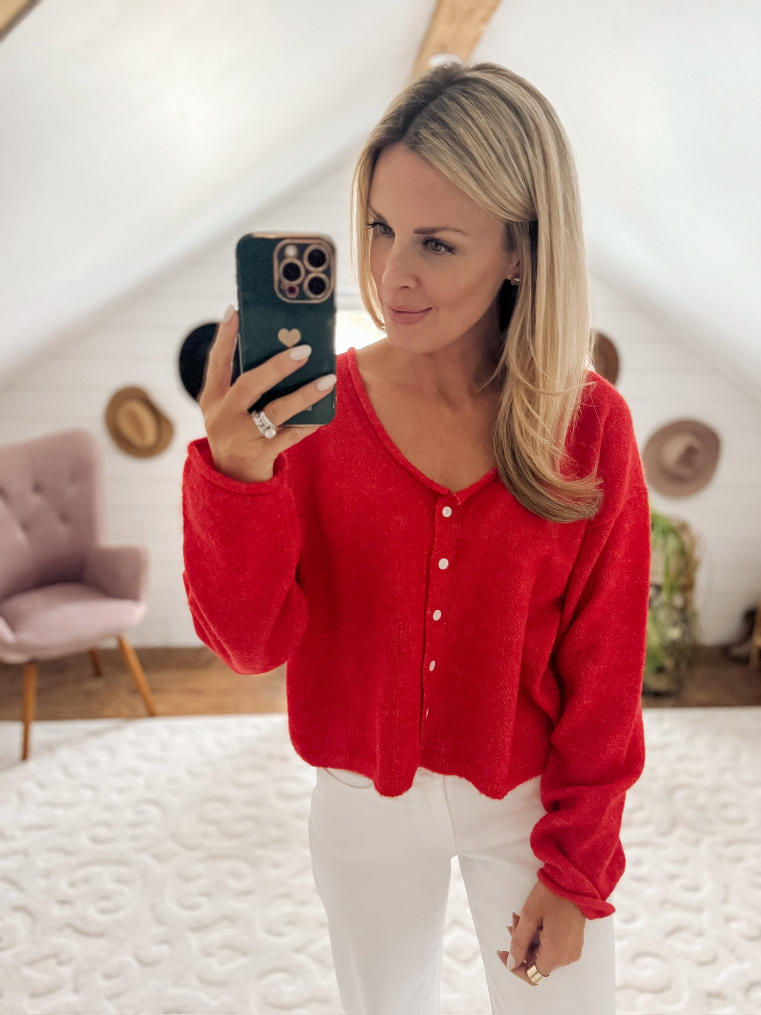 Snuggle up in style with our Red Rolled V Neck Cardigan. Its chic rolled neckline adds a touch of flair, making it perfect for layering or wearing solo. This cozy cardi is your go-to for effortless warmth and a laid-back vibe.
