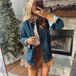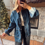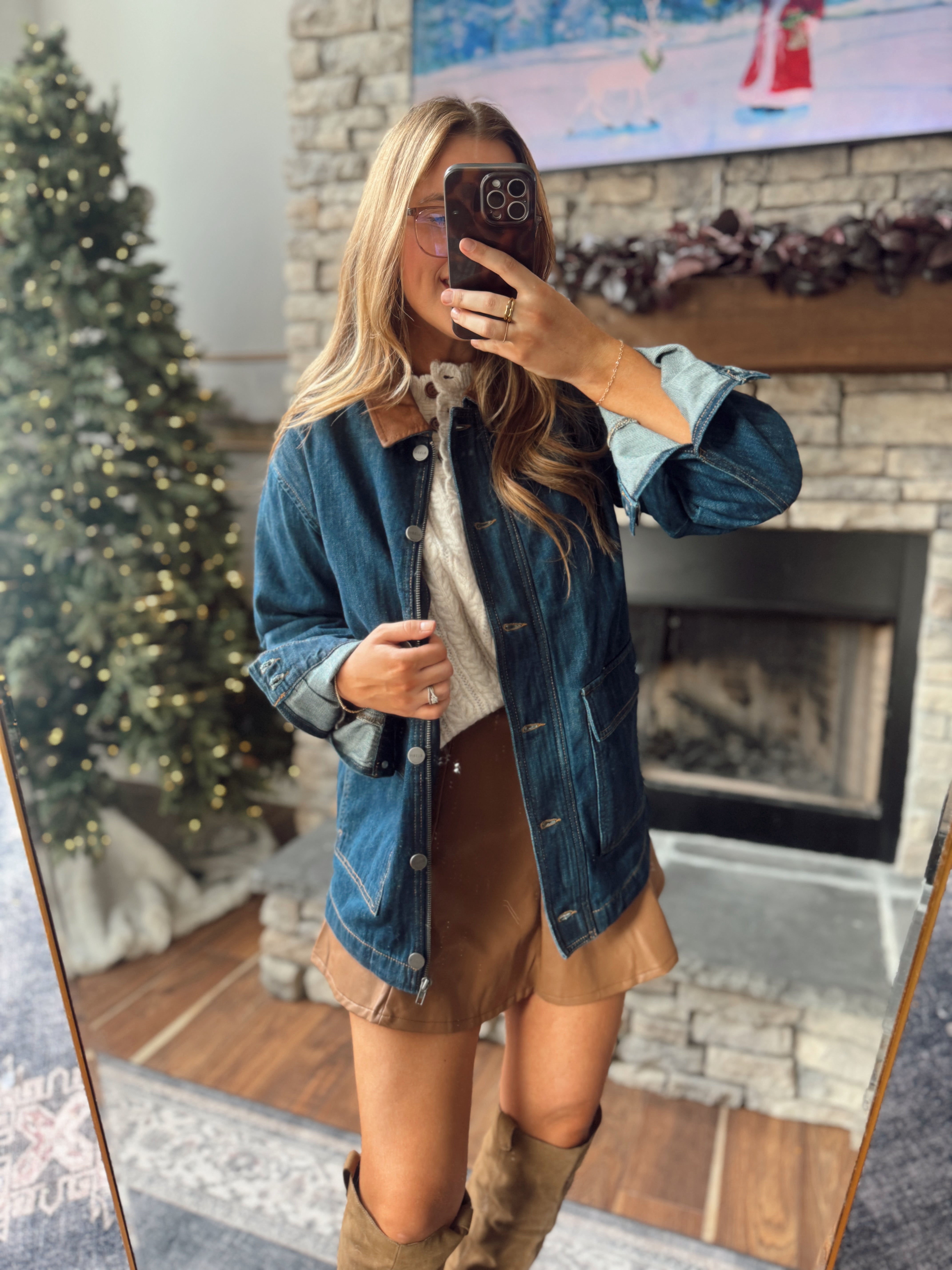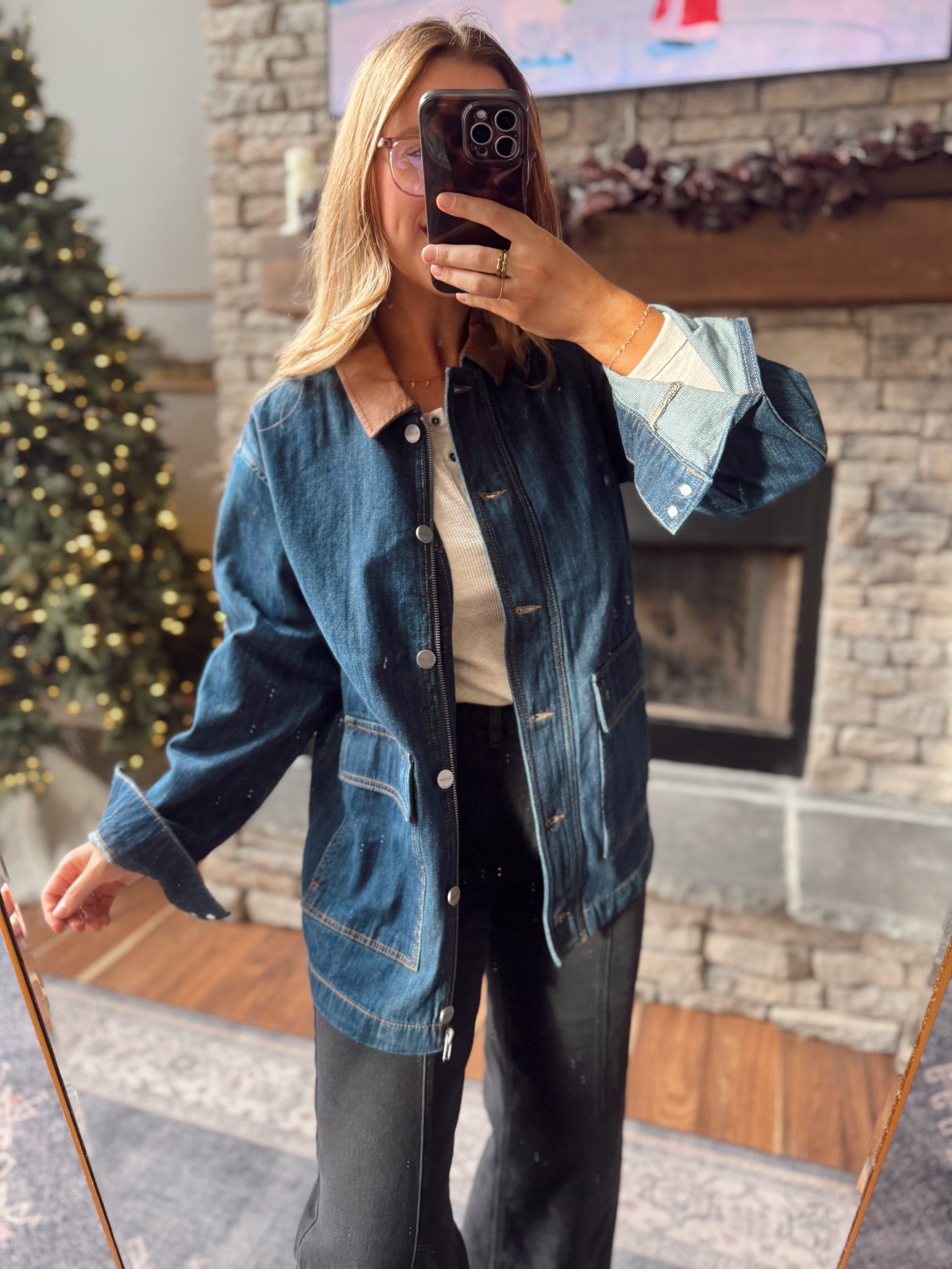 A timeless twist on a classic. This denim utility jacket features a rich medium wash, soft structure, and a faux suede contrast collar that instantly elevates your look. The slightly oversized fit and utility-style pockets make it practical yet polished — perfect for layering through every season.