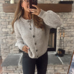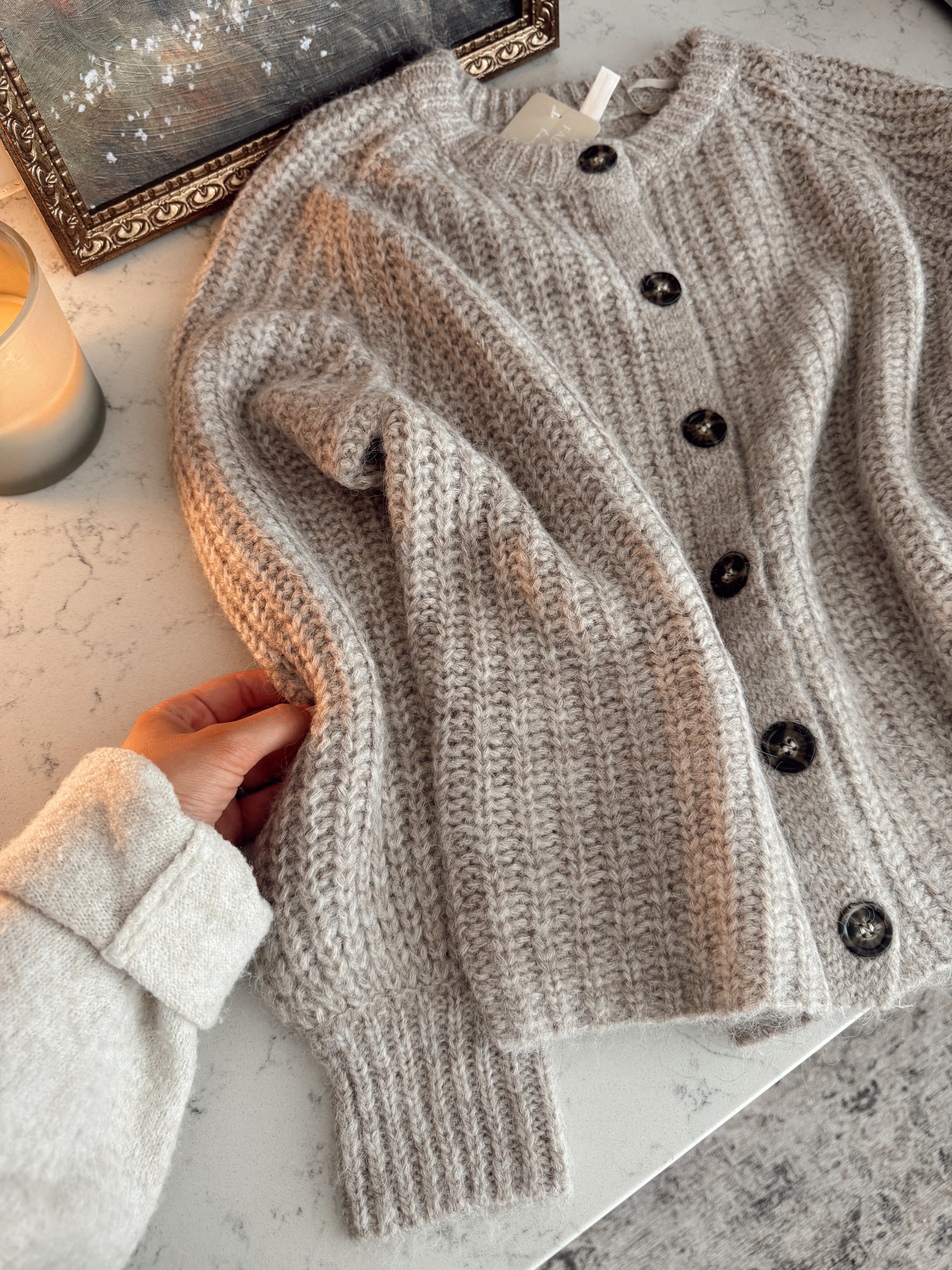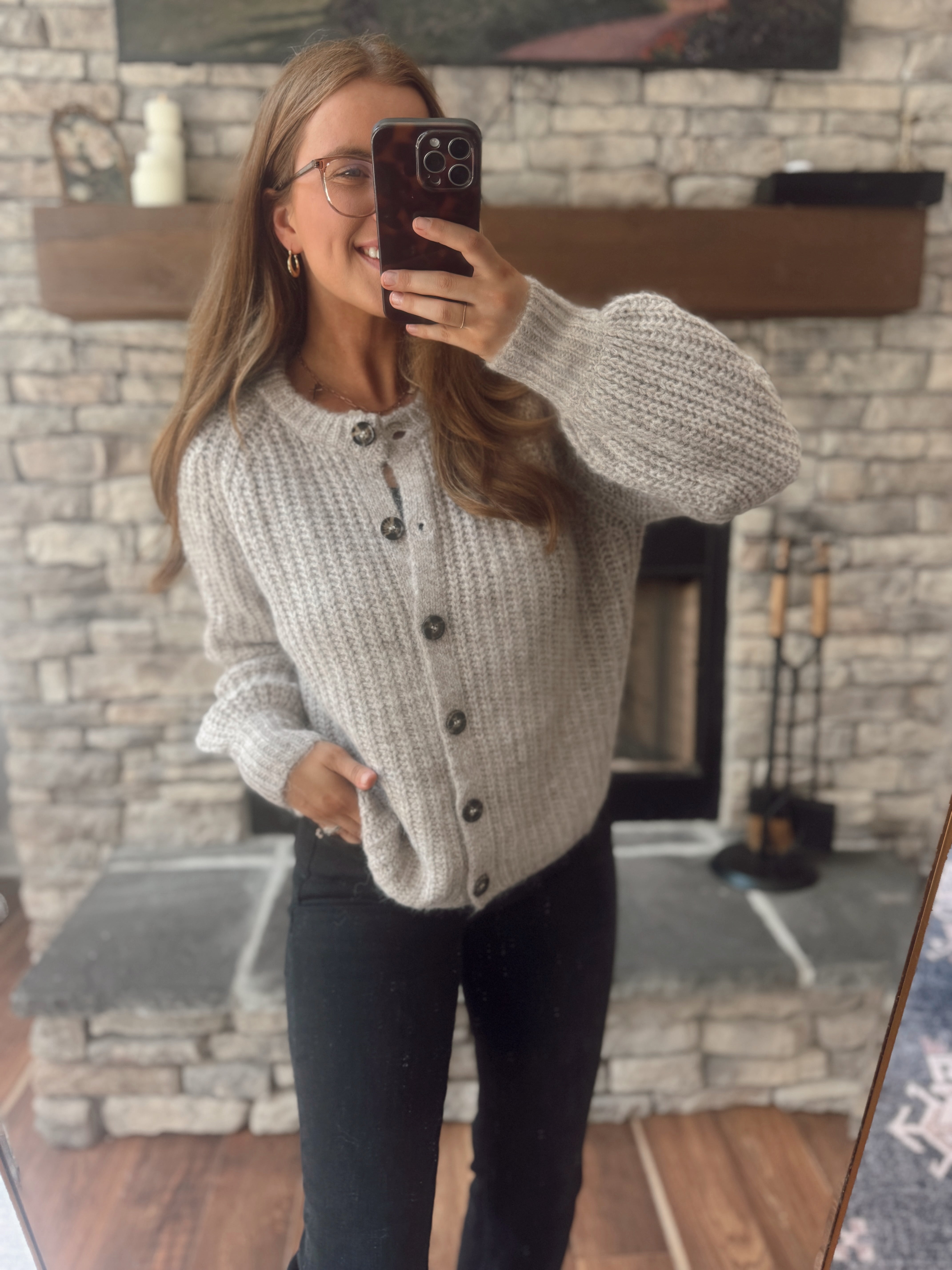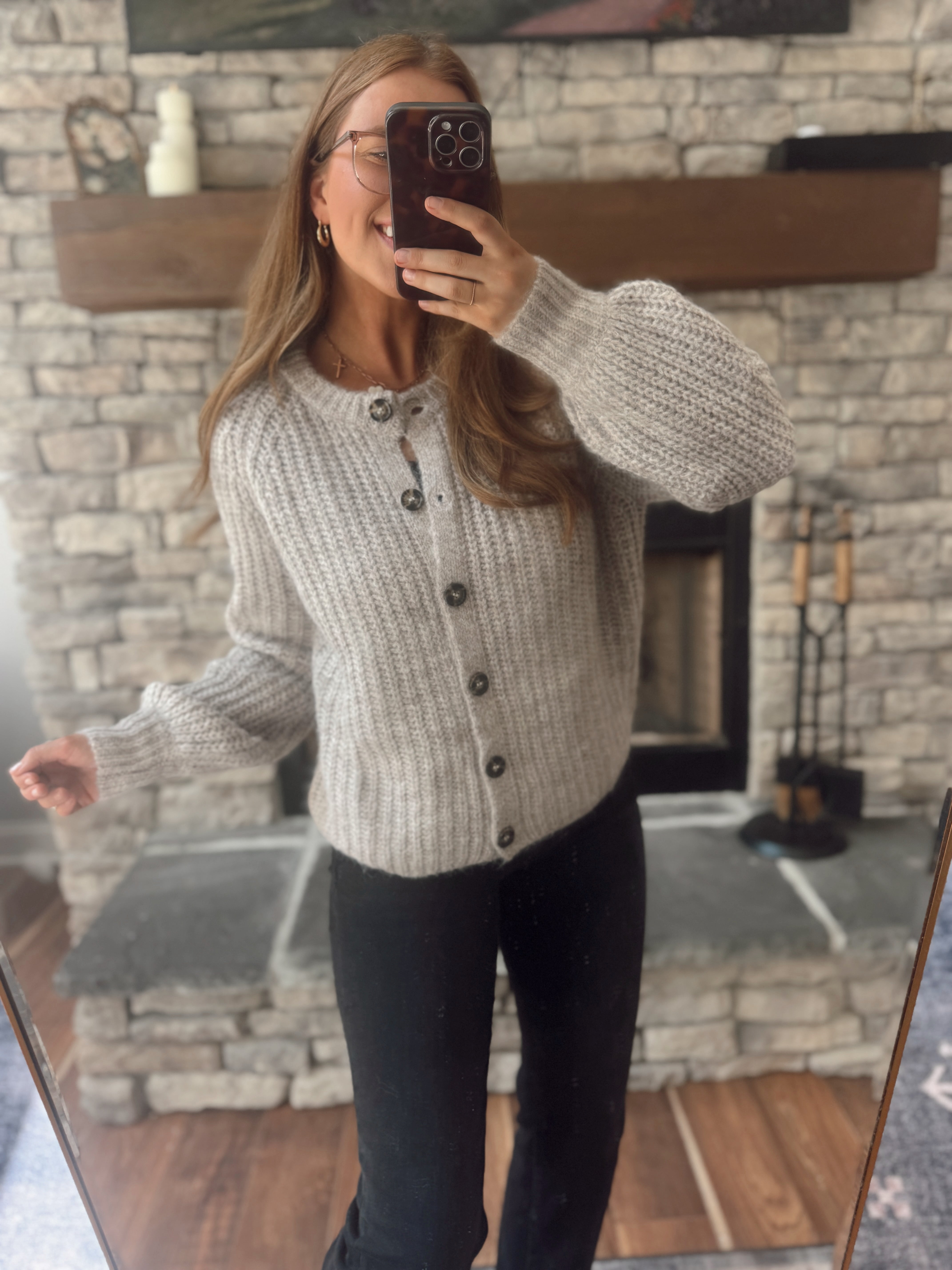 This pretty shell cardigan is pure magic. The chunky knit keeps it cozy while the bold buttons add just the right amount of charm. Balloon sleeves + a relaxed fit = effortless style you’ll keep reaching for. Dress it up with denim or layer it over your favorite basics — either way, you’ll feel like the main character.