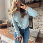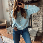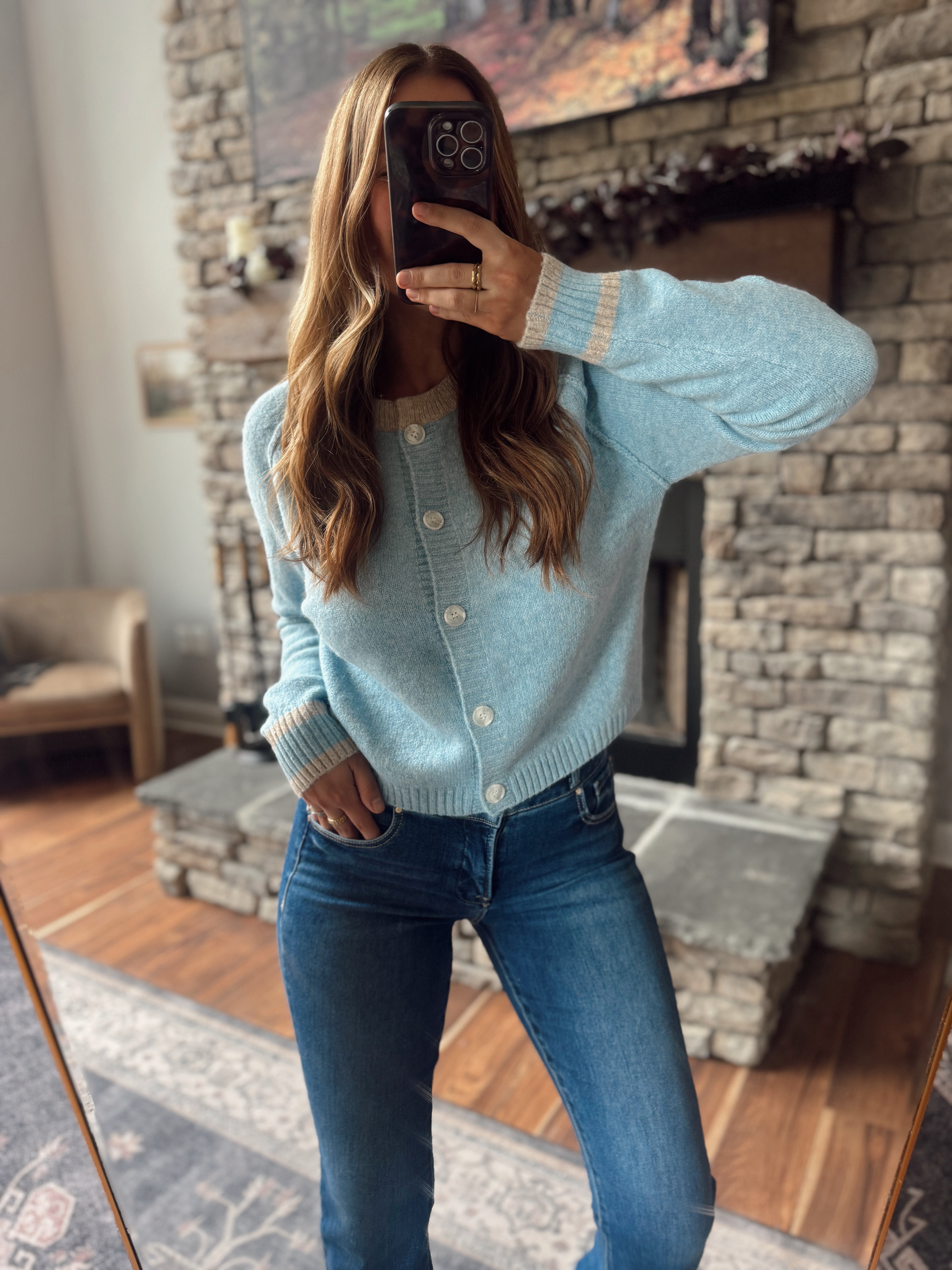 Soft, sweet, and timeless — this powder blue cardigan adds the perfect pop of cozy color to your winter wardrobe. The contrast cream trim gives it a subtle vintage touch while the fit keeps it effortlessly modern.