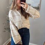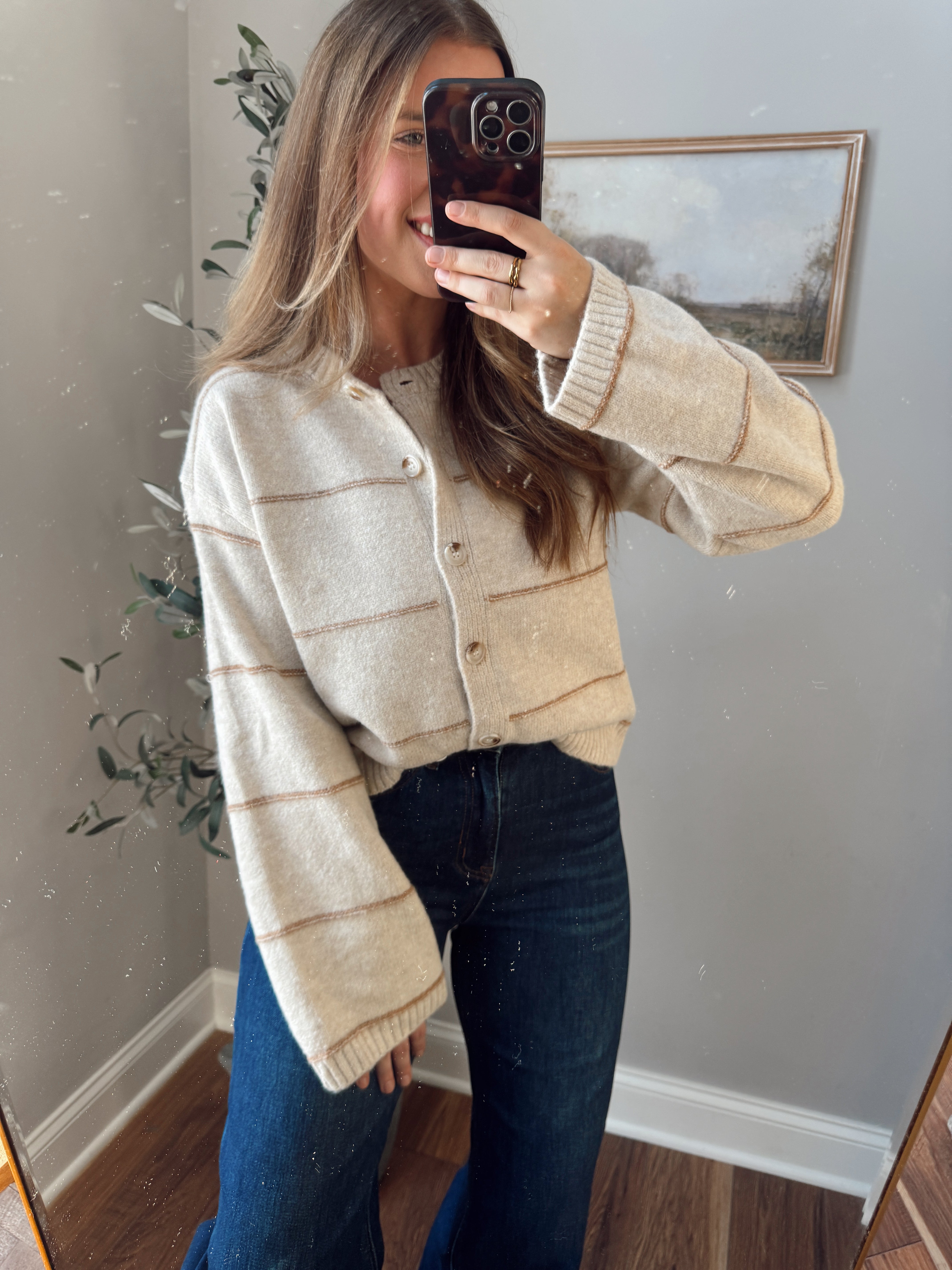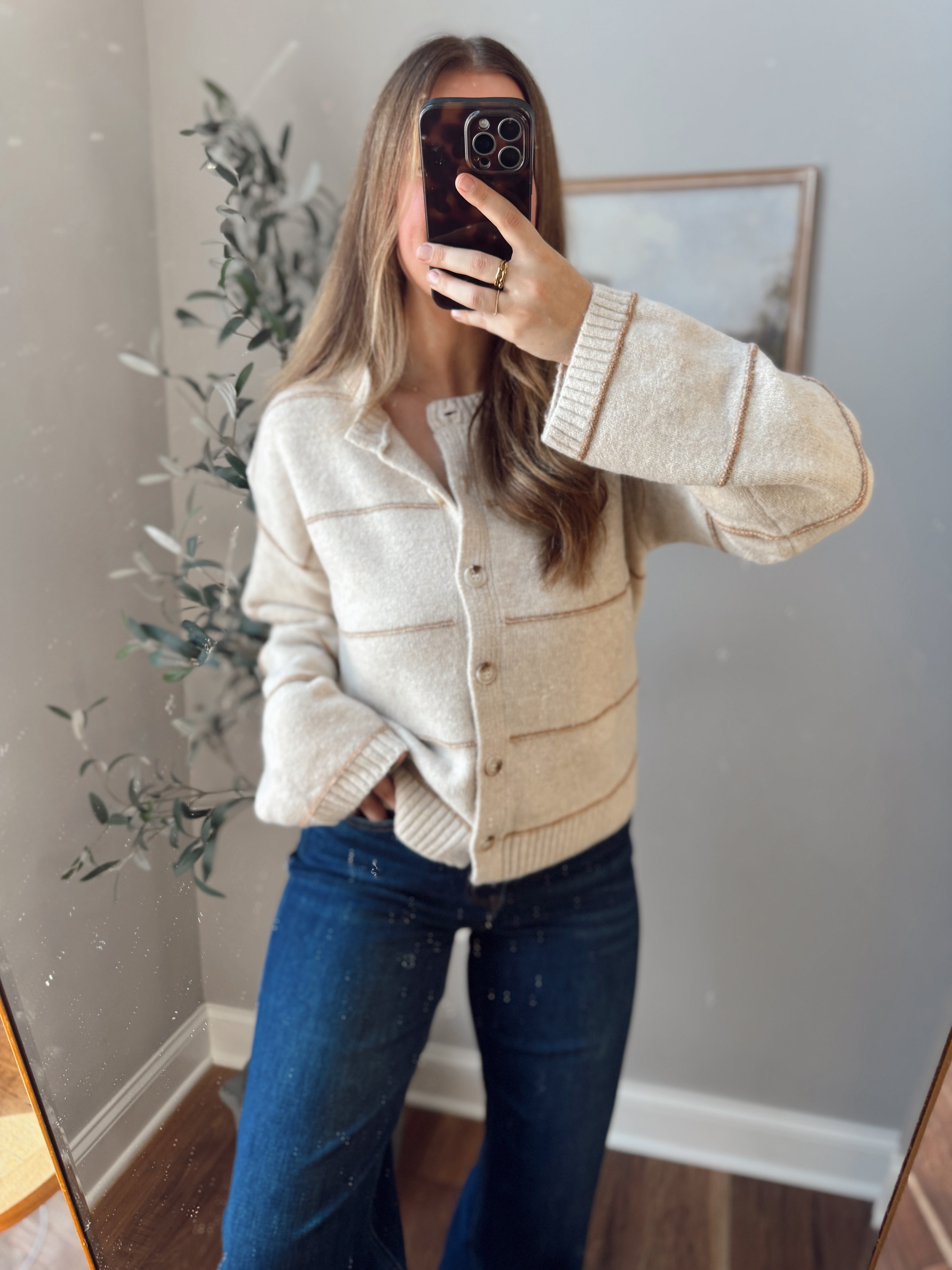 A timeless, easy layering piece you’ll wear on repeat. This cardigan features a soft, cozy knit with subtle neutral striping for a polished, elevated look. Designed with a relaxed fit, functional button-front, and ribbed trim for the perfect balance of comfort and structure.