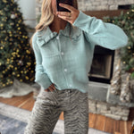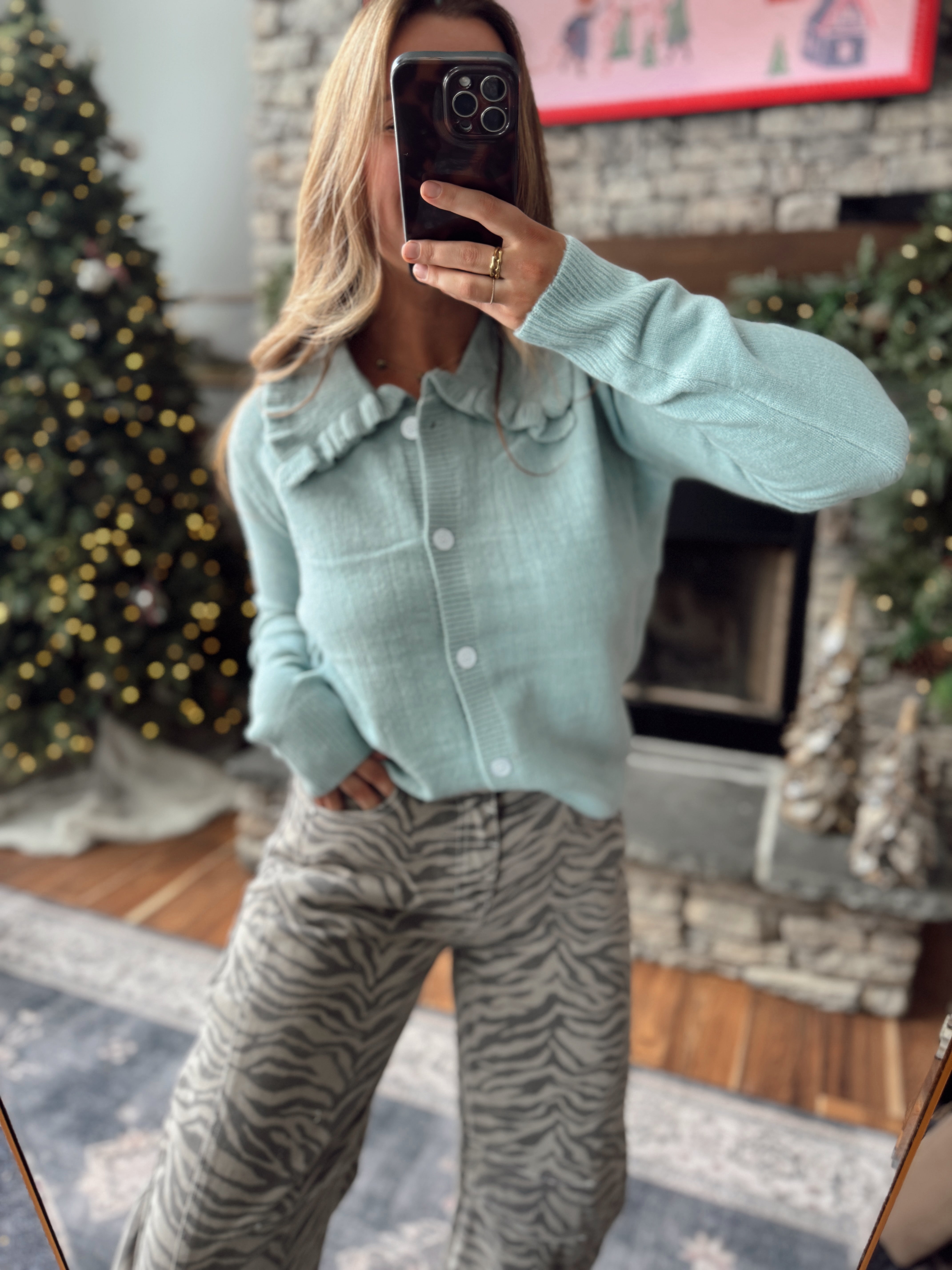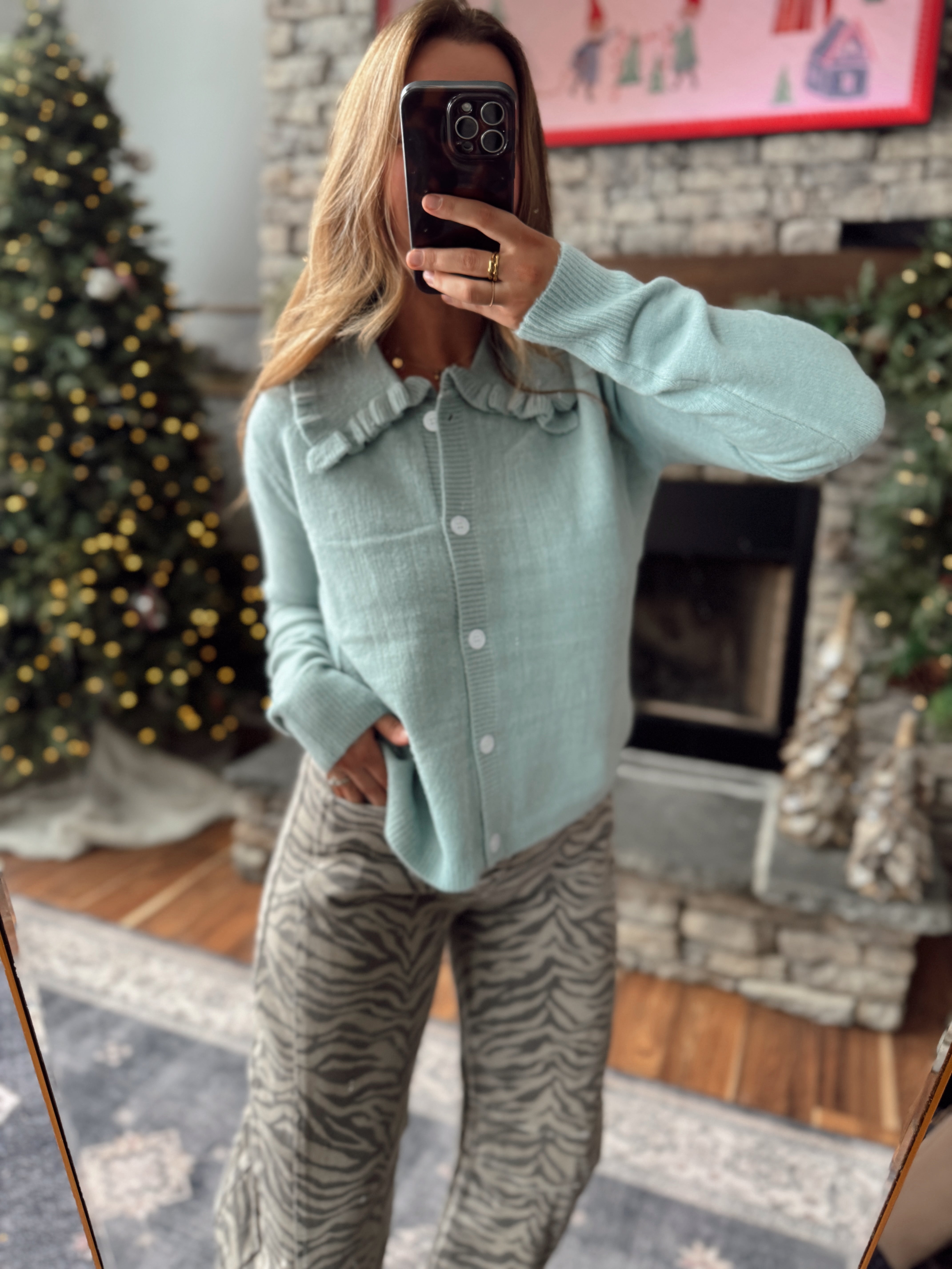 Sweet, soft, and oh-so-feminine 💚 This mint button-front cardigan features the prettiest ruffle collar detail and a cozy knit texture that feels as good as it looks. Easy to dress up or down — pair it with denim, trousers, or your favorite printed bottoms for a fresh, put-together vibe.