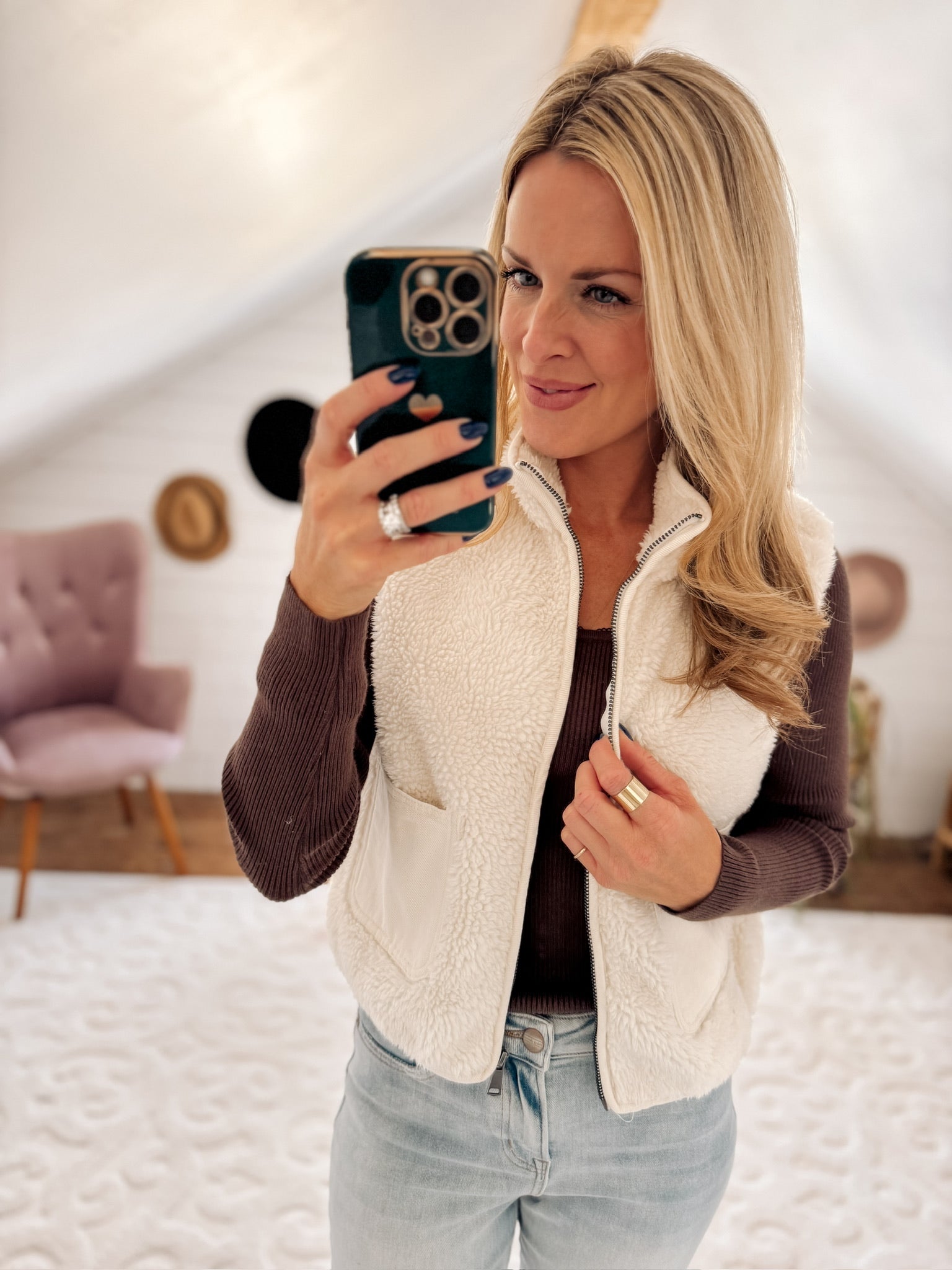 Ecru Zip Up Fleece Vest with Denim Pockets IN STORE