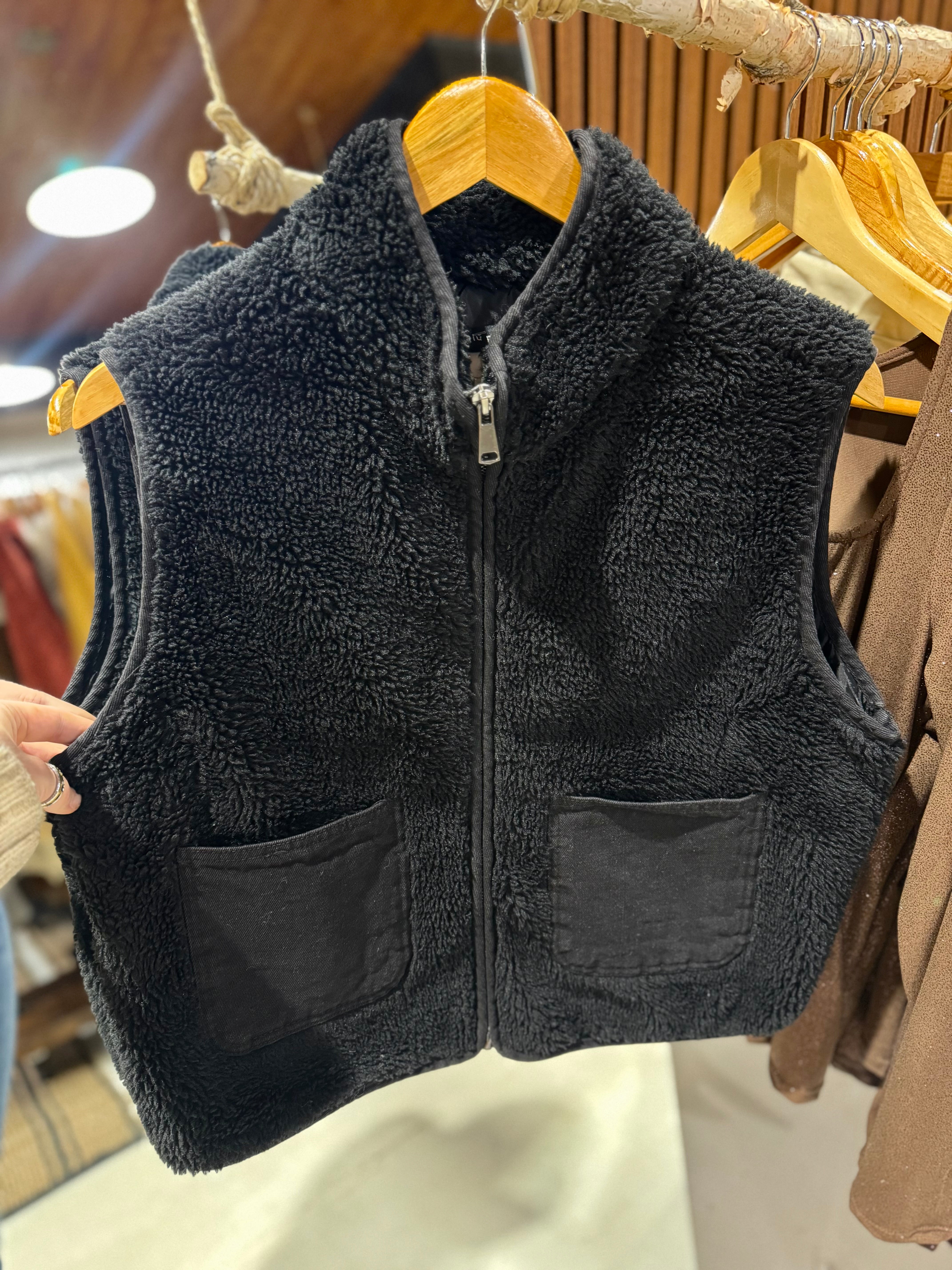 Black Zip Up Fleece Vest with Denim Pockets IN STORE