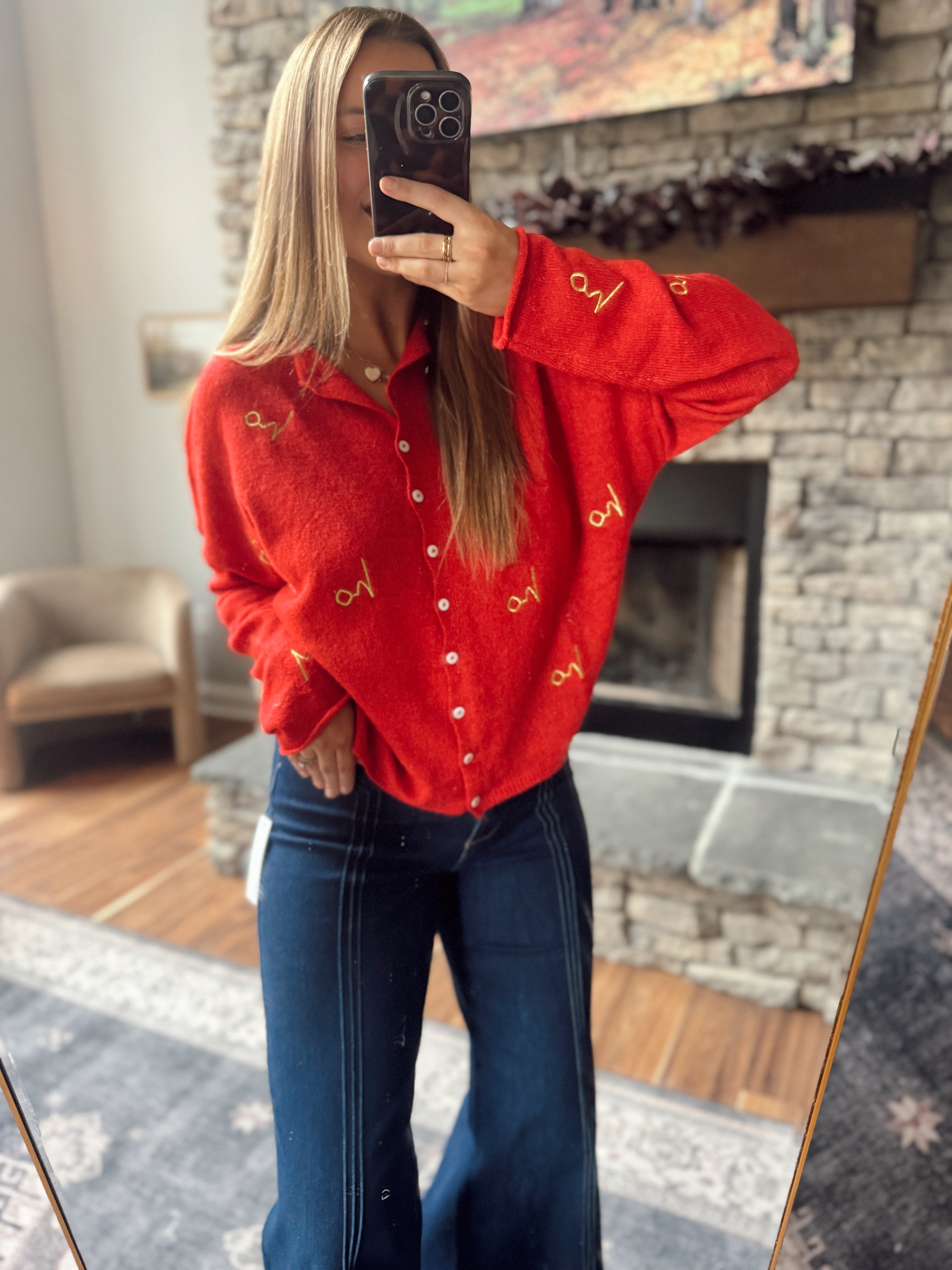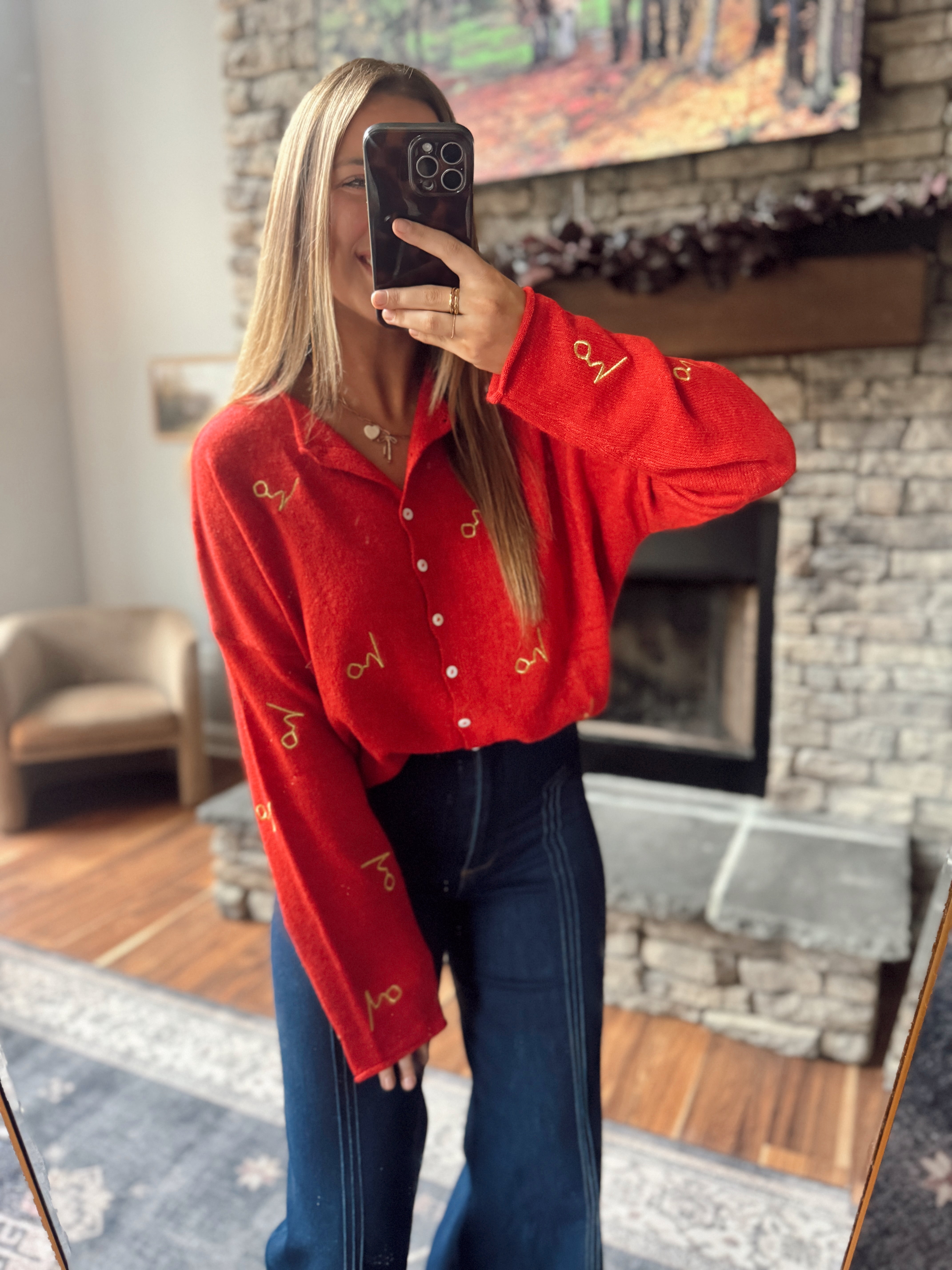 Red Holiday Embroidered Piper Knit Cardigan