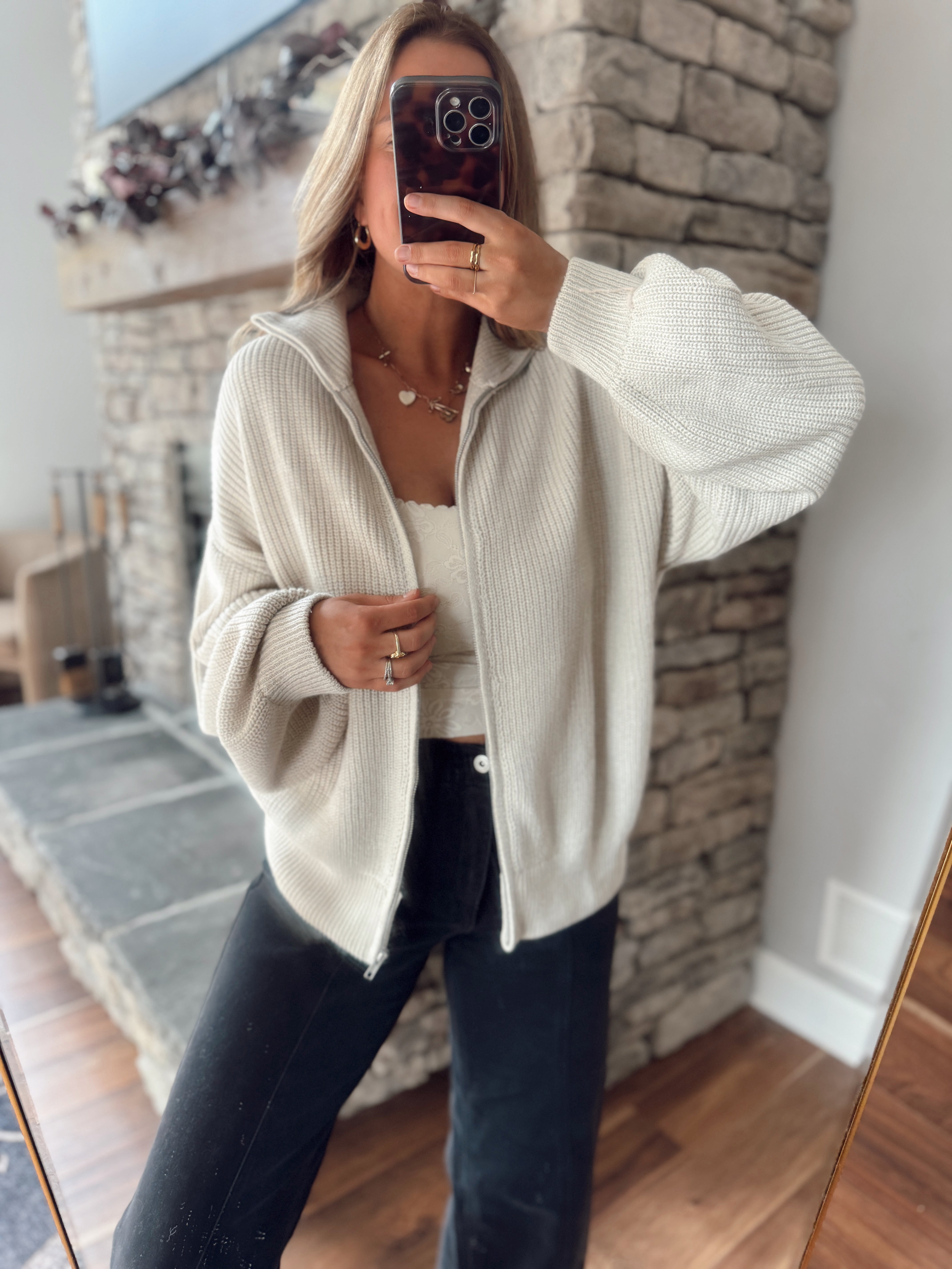 Taupe Oversized Zip Up Cardigan
