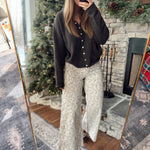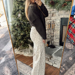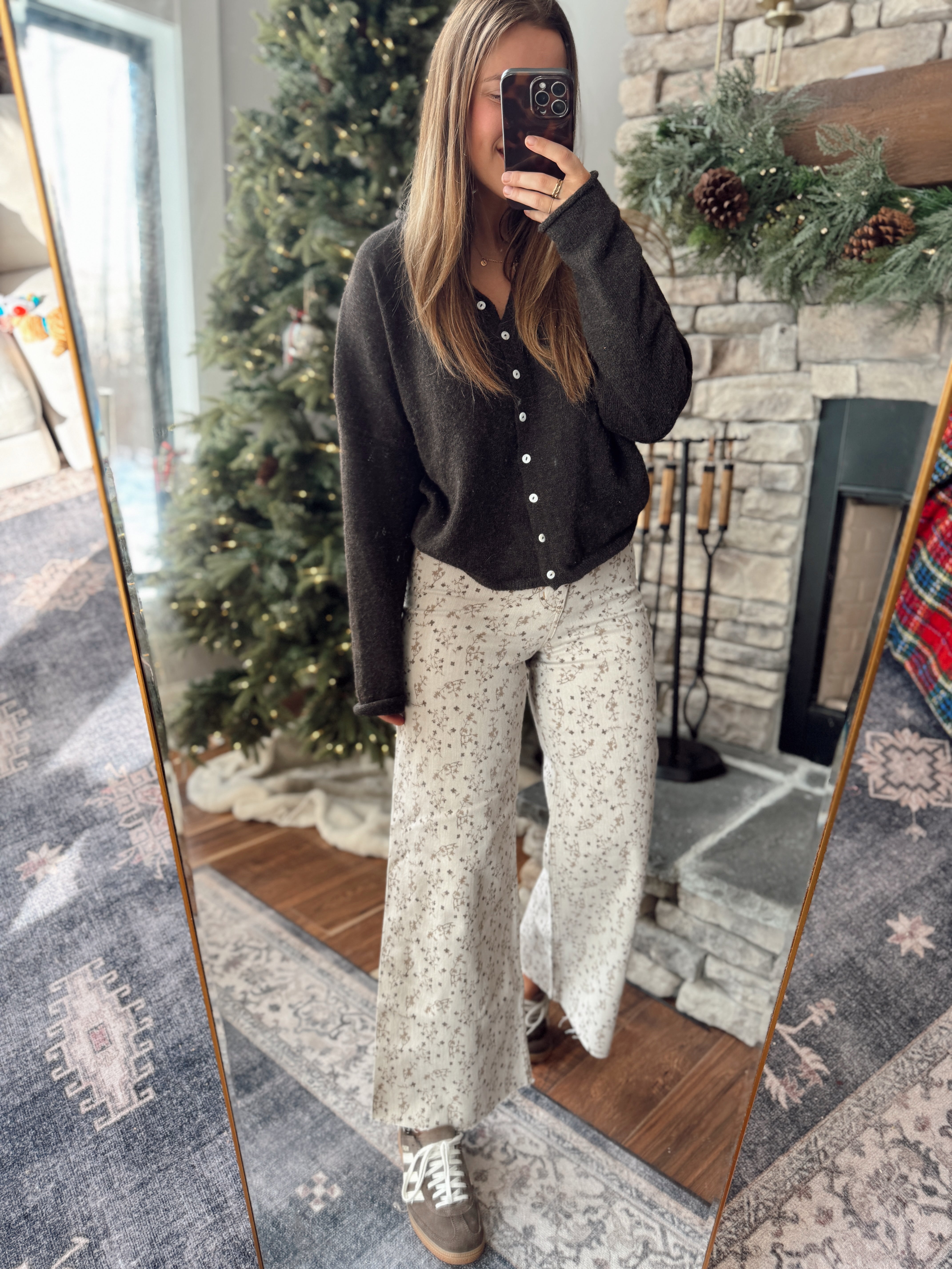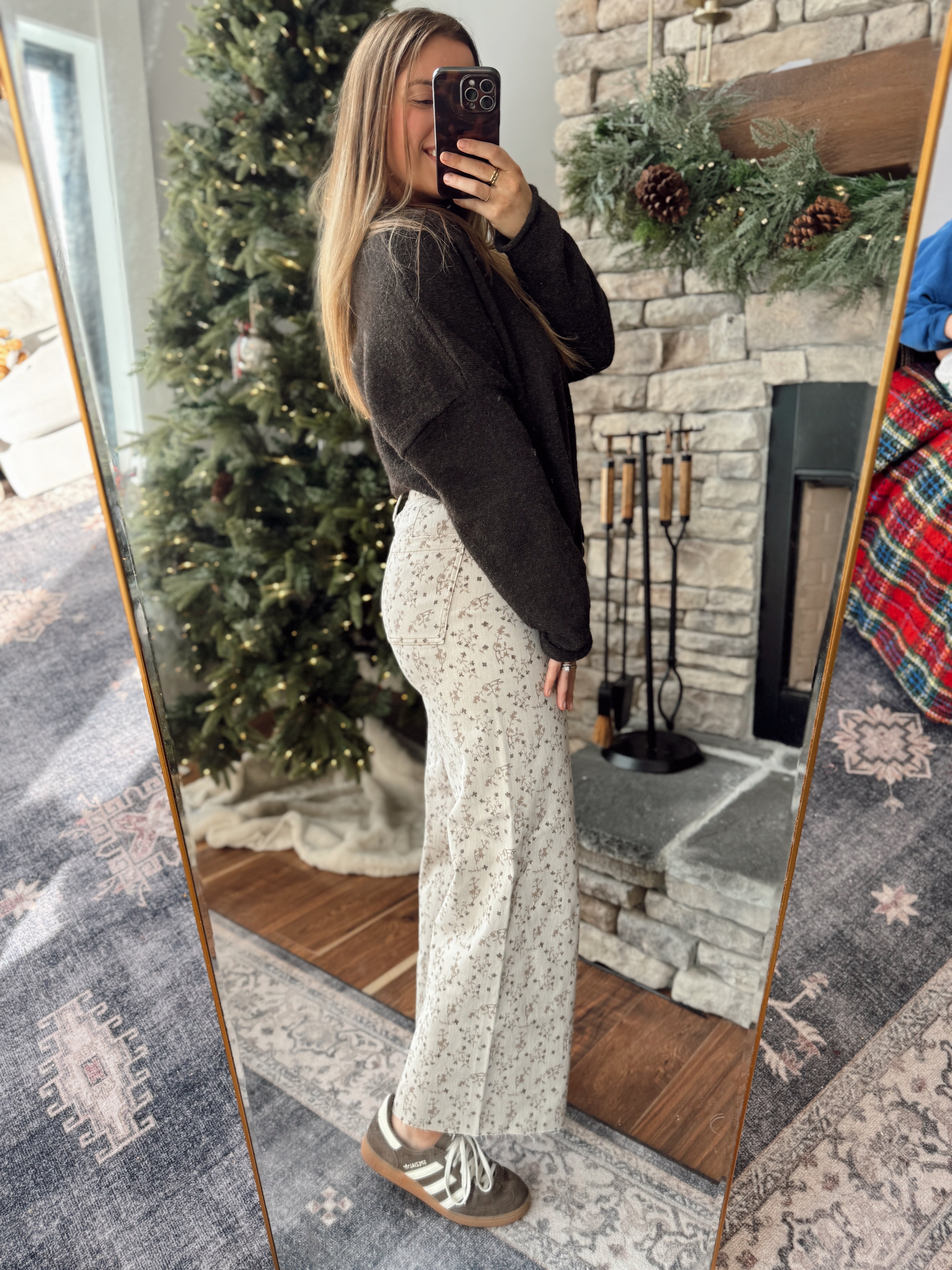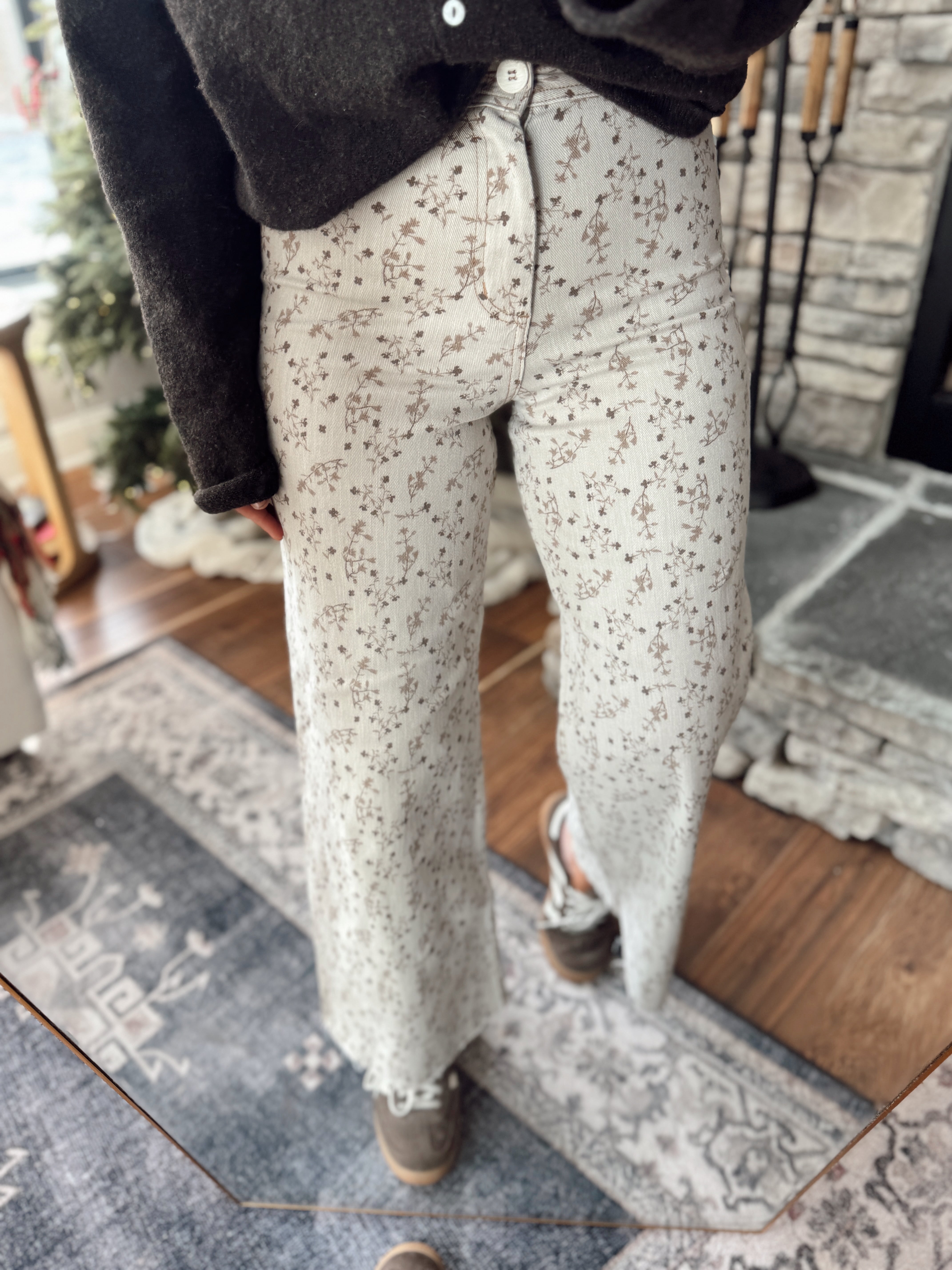 These vintage-inspired wide leg jeans are everything. A soft neutral base with a dainty floral print gives them that dreamy, feminine touch while keeping them totally wearable year-round. The structured denim fit with a relaxed leg makes them flattering and comfy all at once.