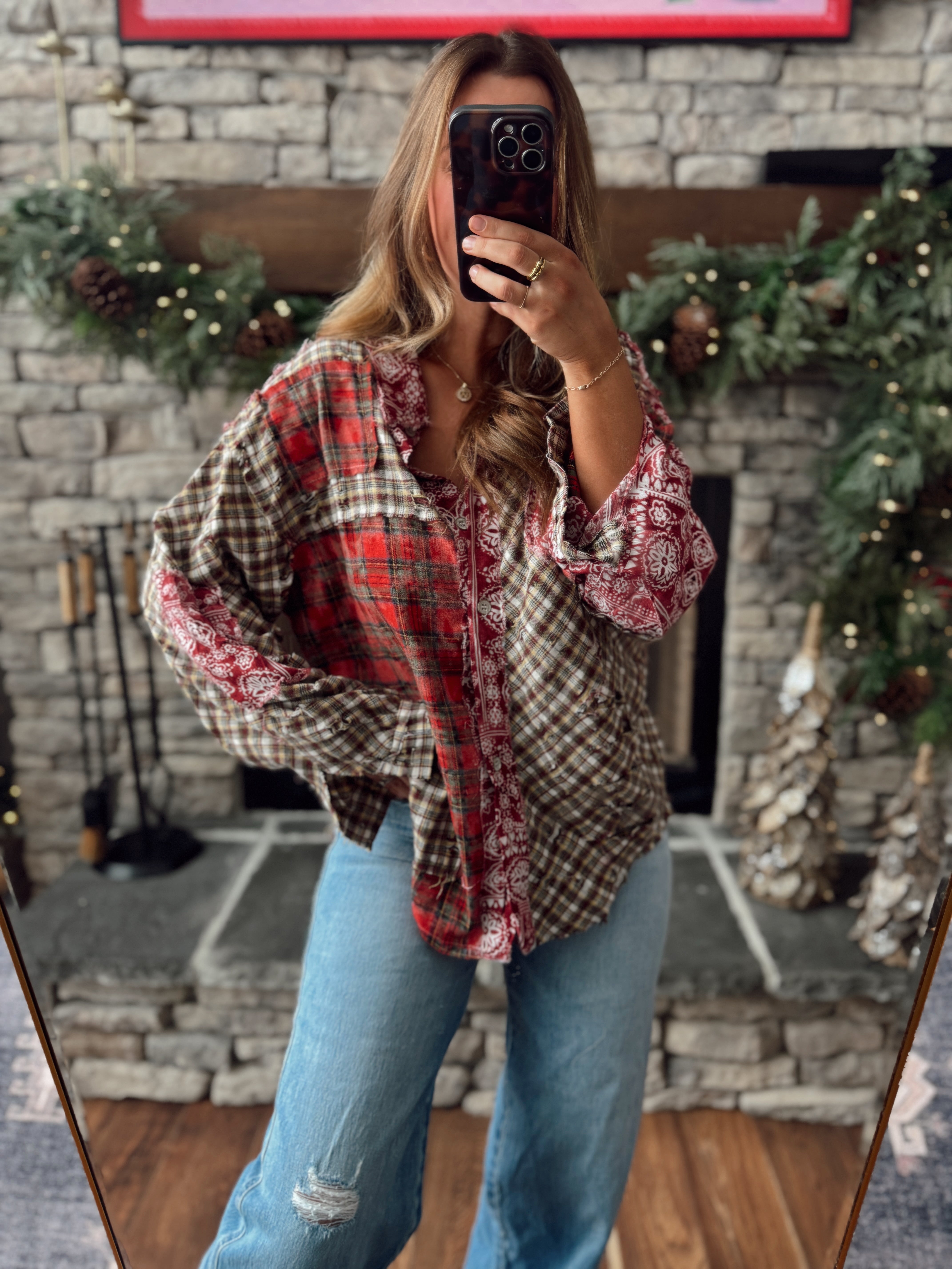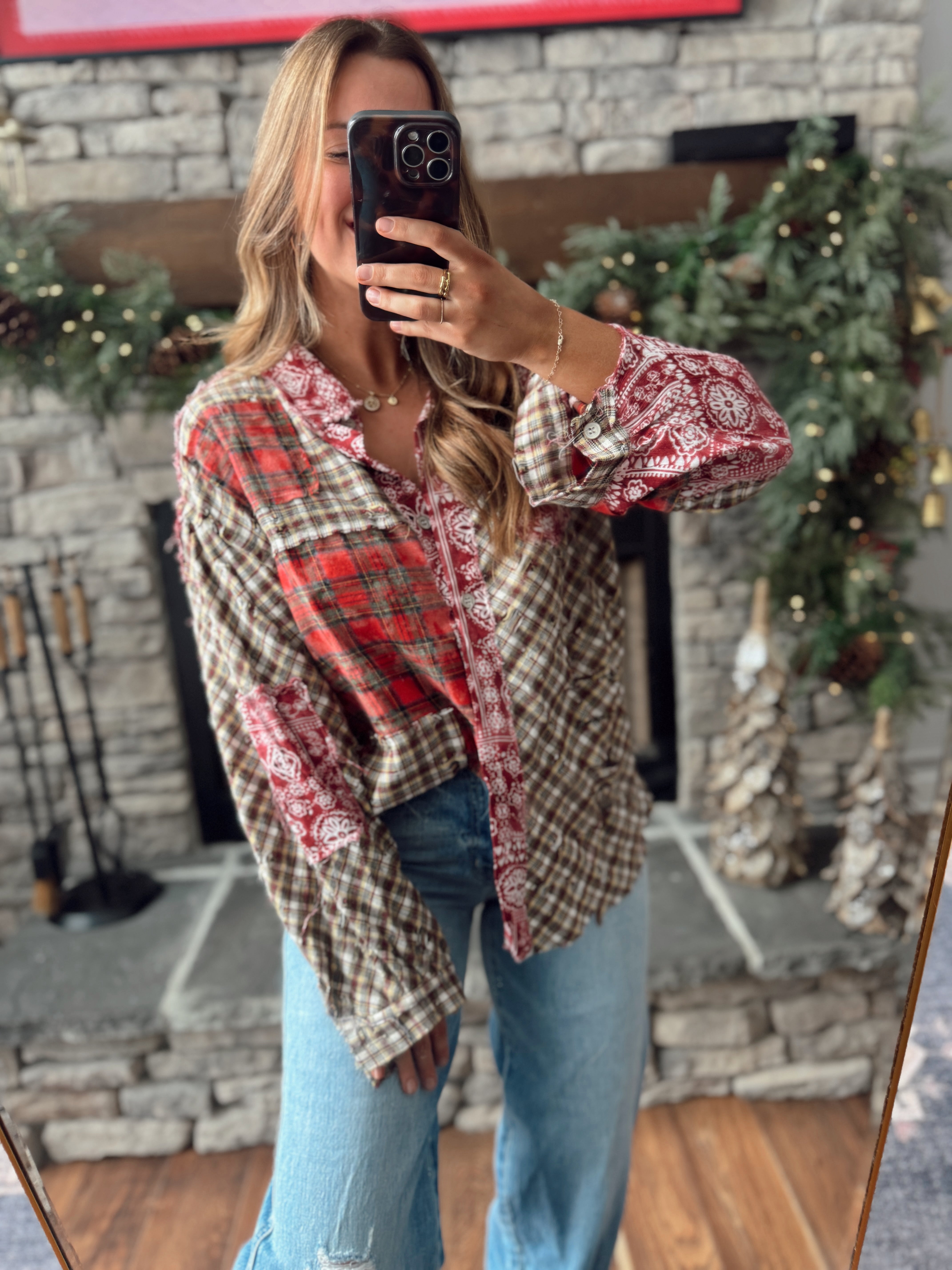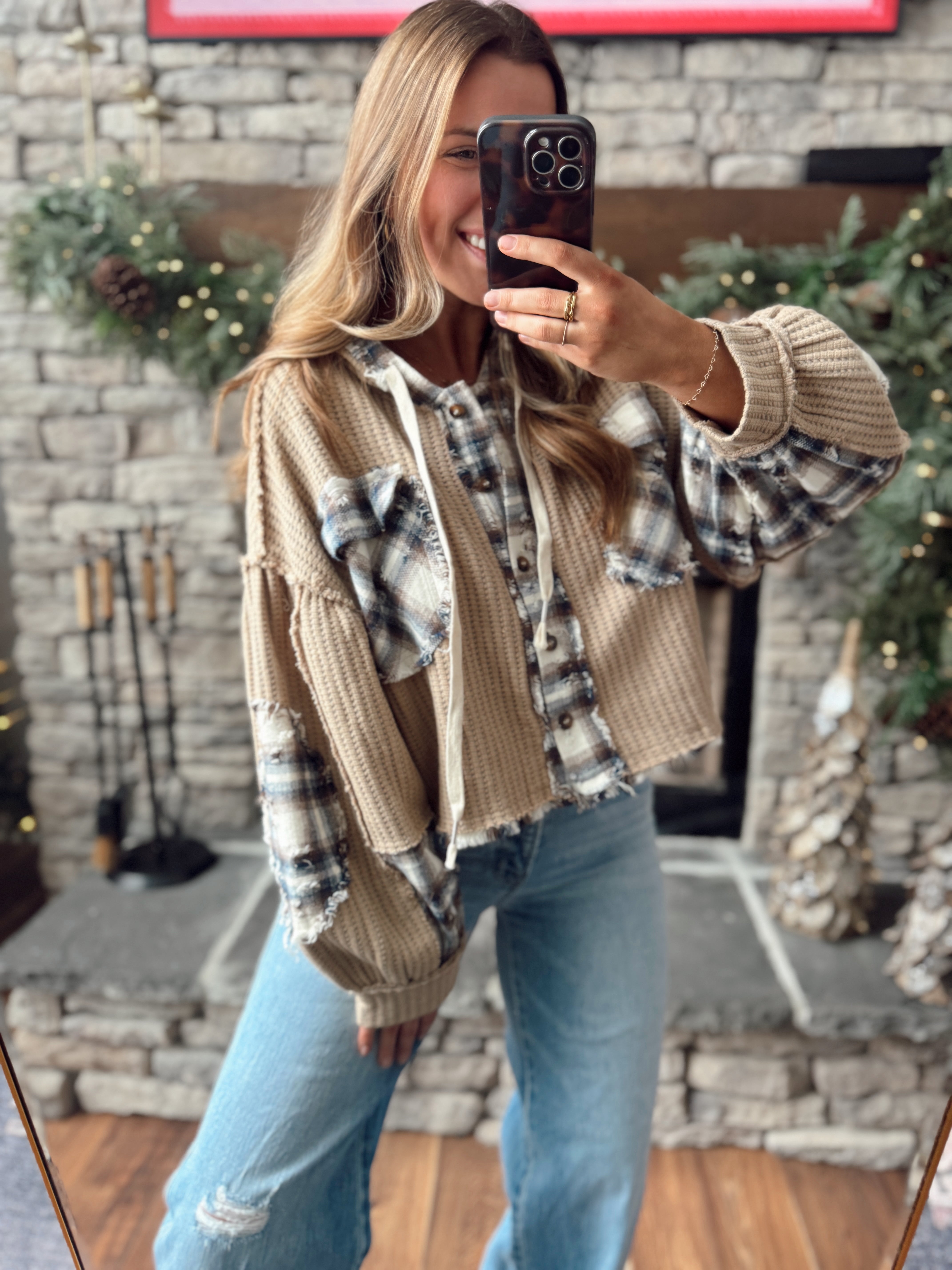 Luna Acorn Plaid Patch Multi Textured Hi-Low Hooded Button Down