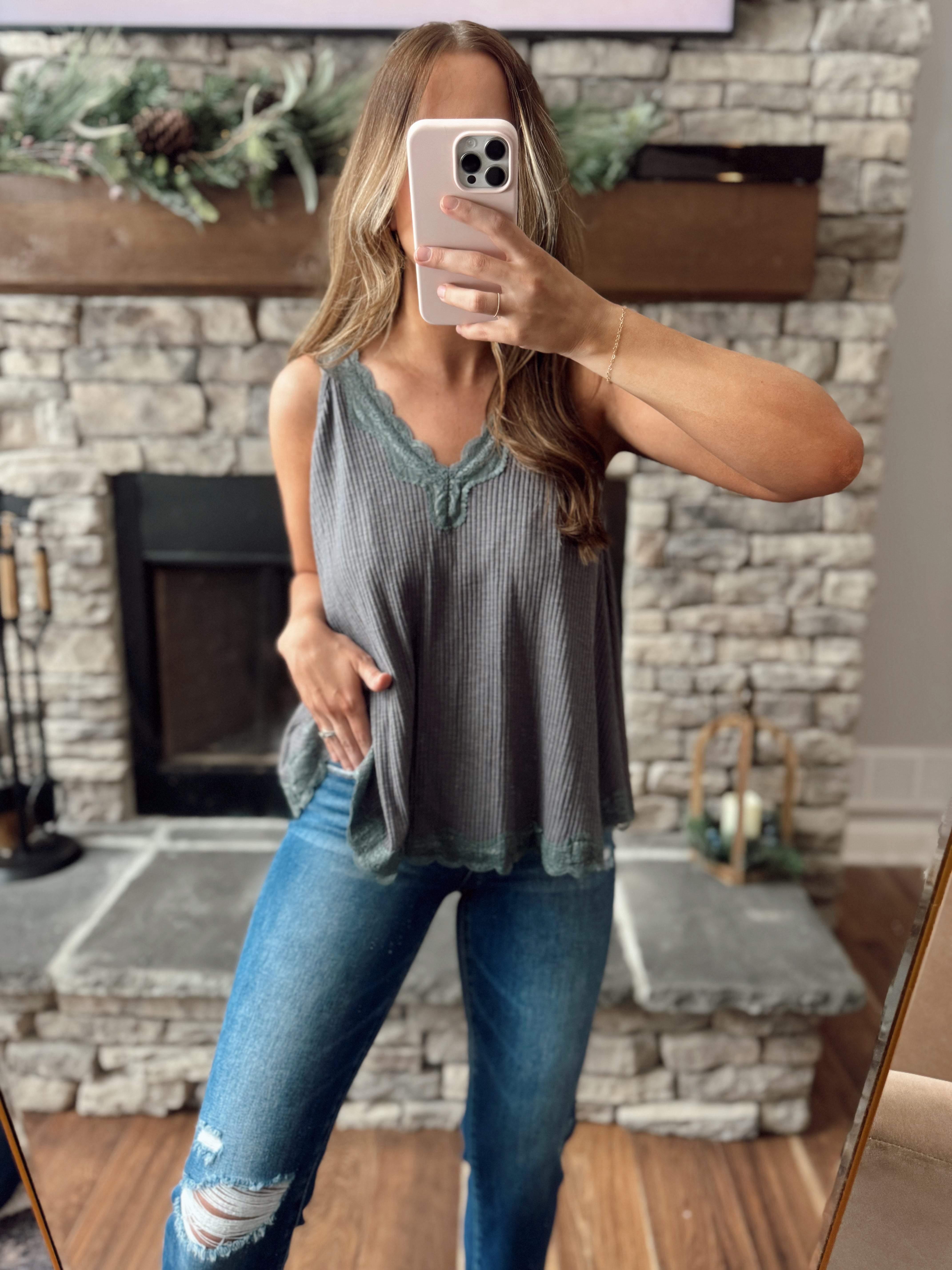 Charcoal High Hopes V Neck Ribbing & Lace Tank