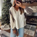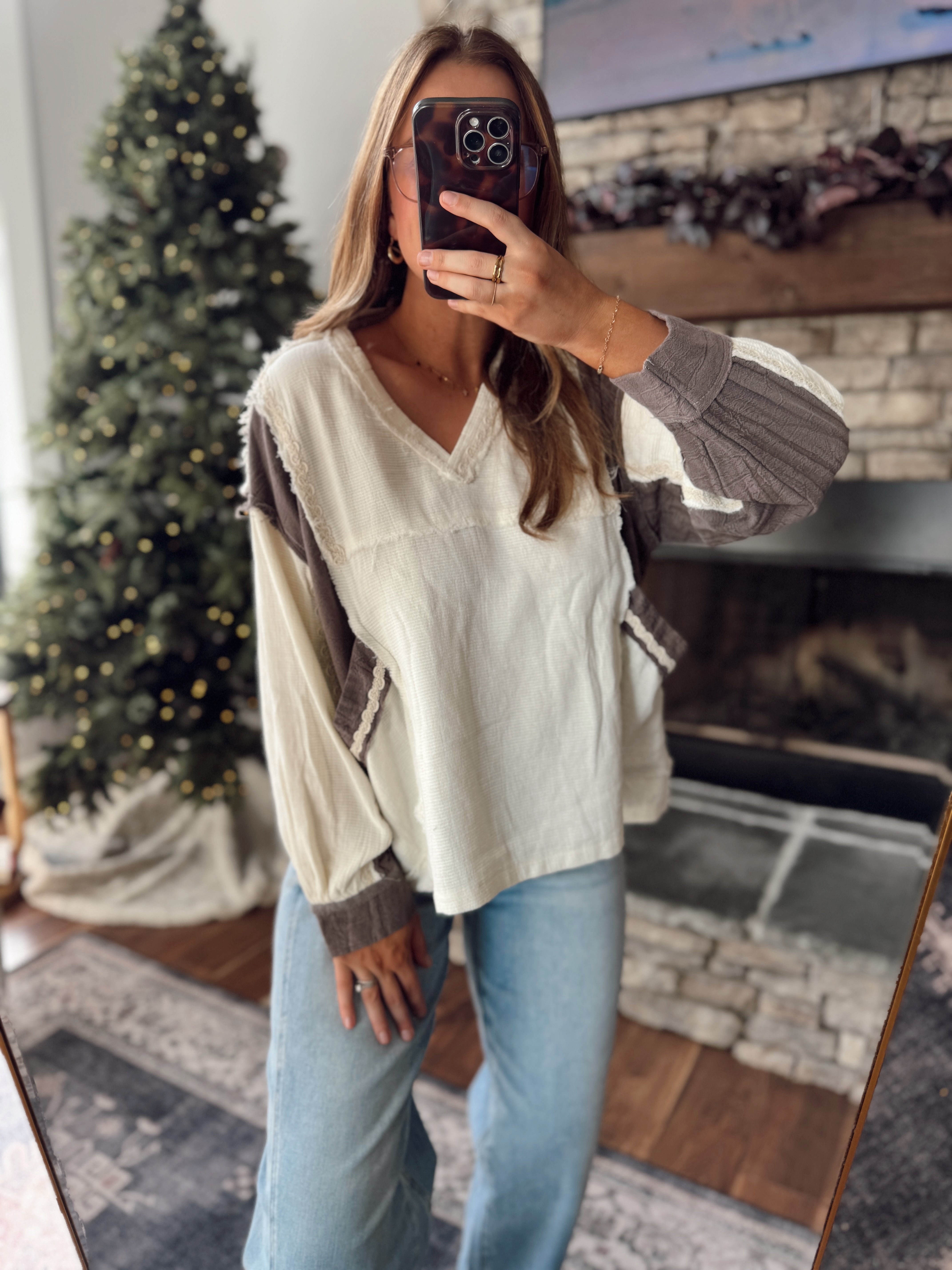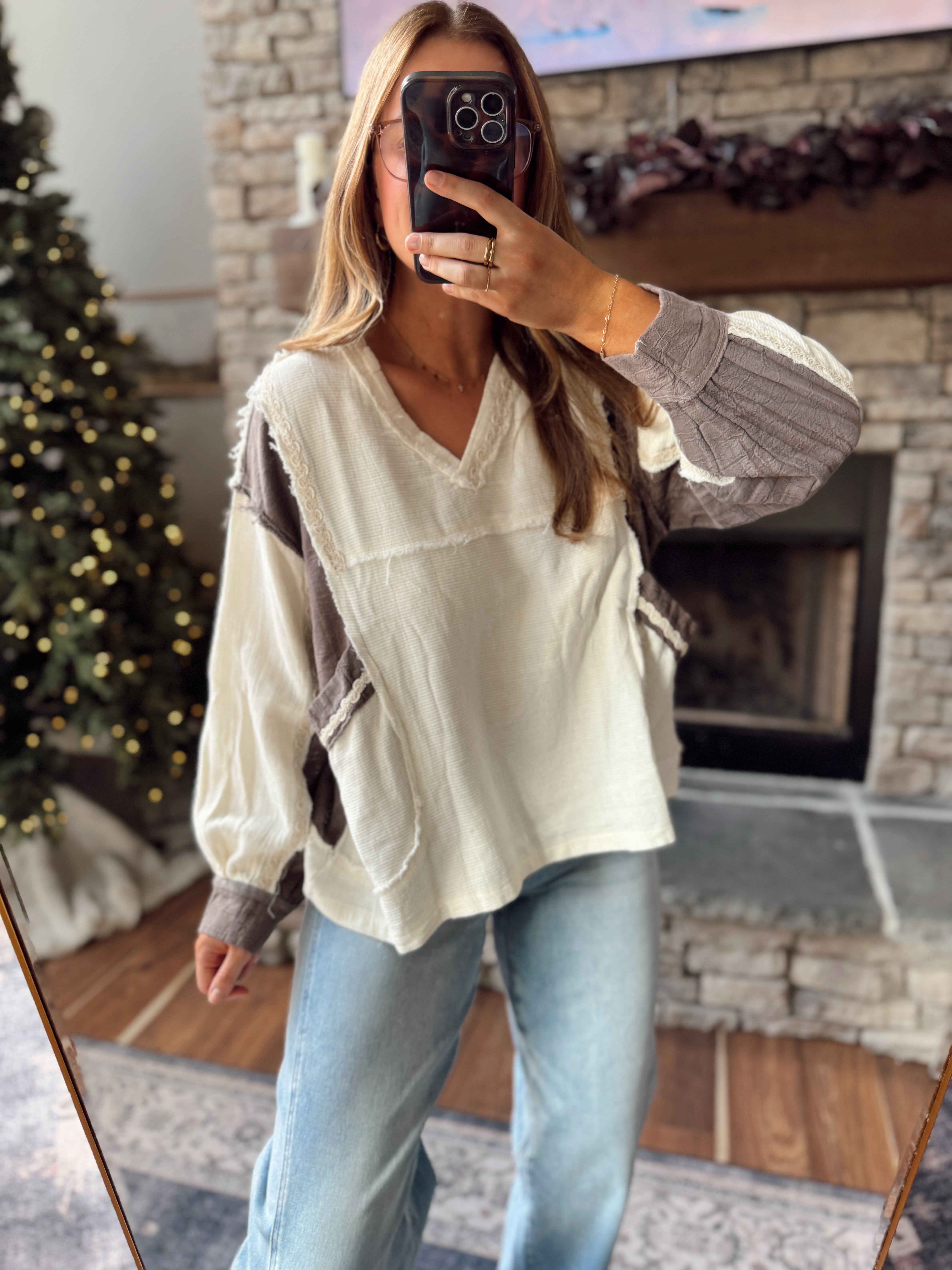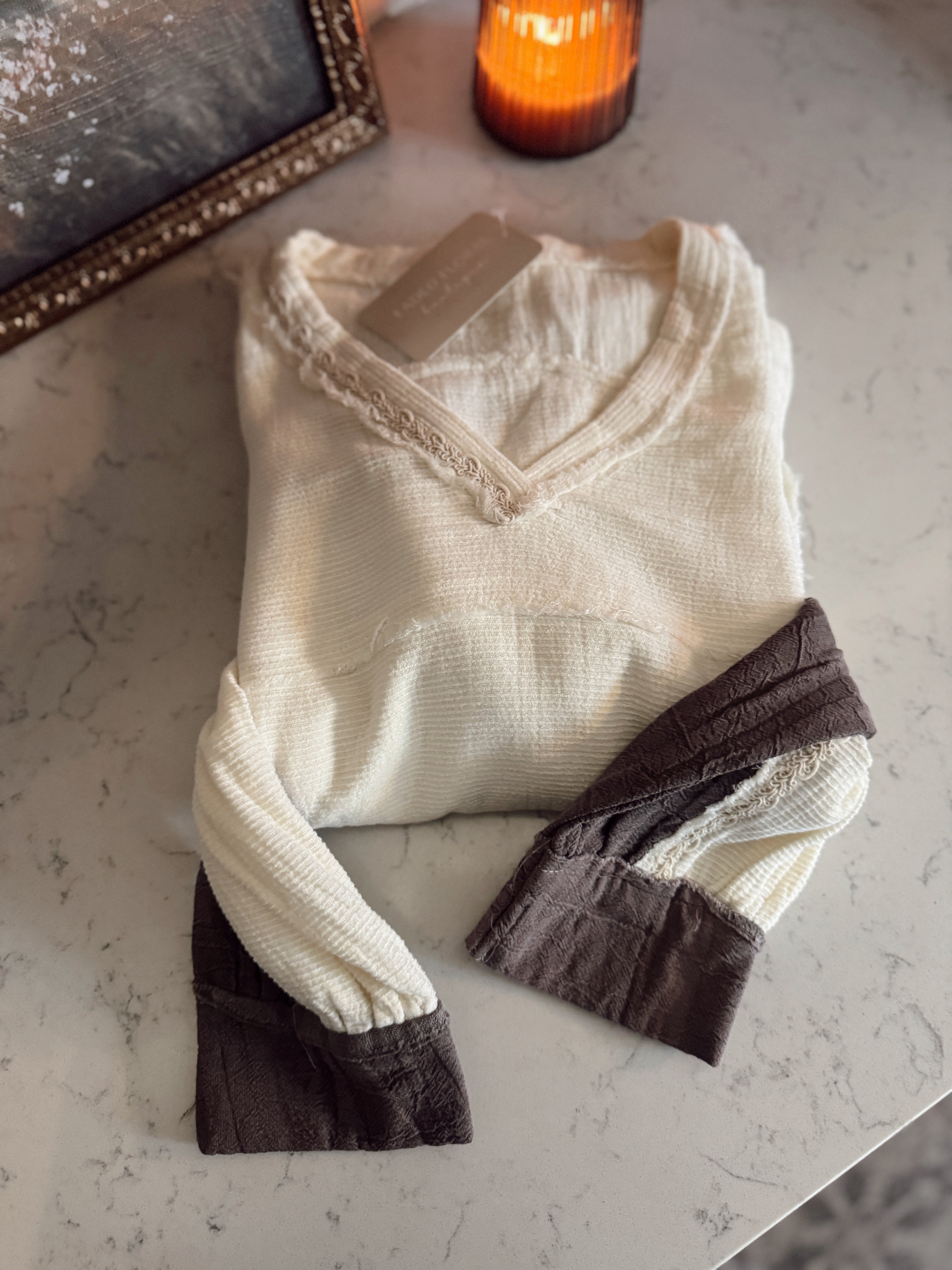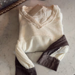 Cozy meets cool in this contrast pullover — a mix of soft cream and mocha tones with raw-edge seams and lace-trim details that add the perfect touch of charm. The relaxed fit and textured fabric make it an effortless throw-on with jeans, leggings, or a midi skirt.