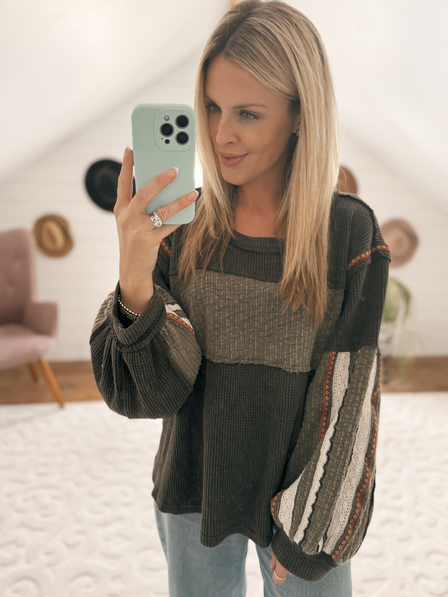 Dawn Charcoal/ Olive Multi Stitch Detail Long Sleeve