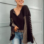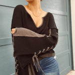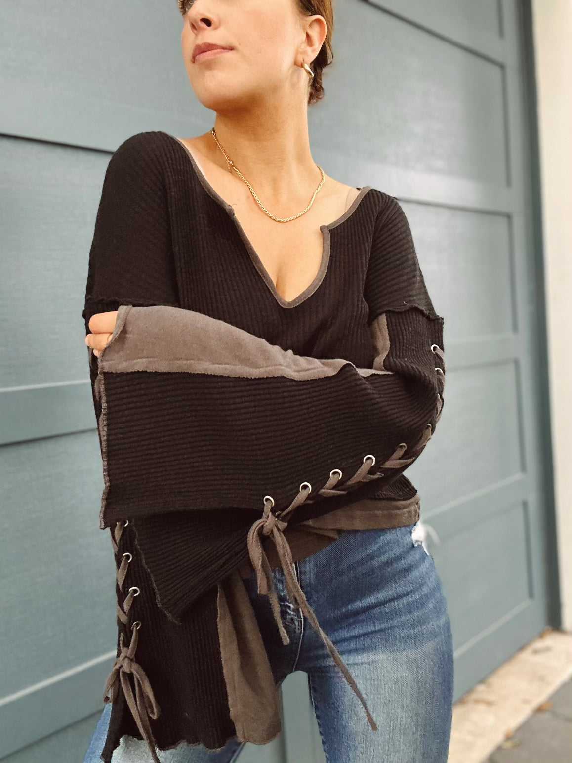 Notched neckline, long sleeve with lace up detail, ribbed with contrasting color block panels.
