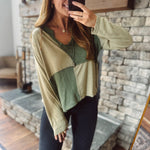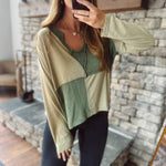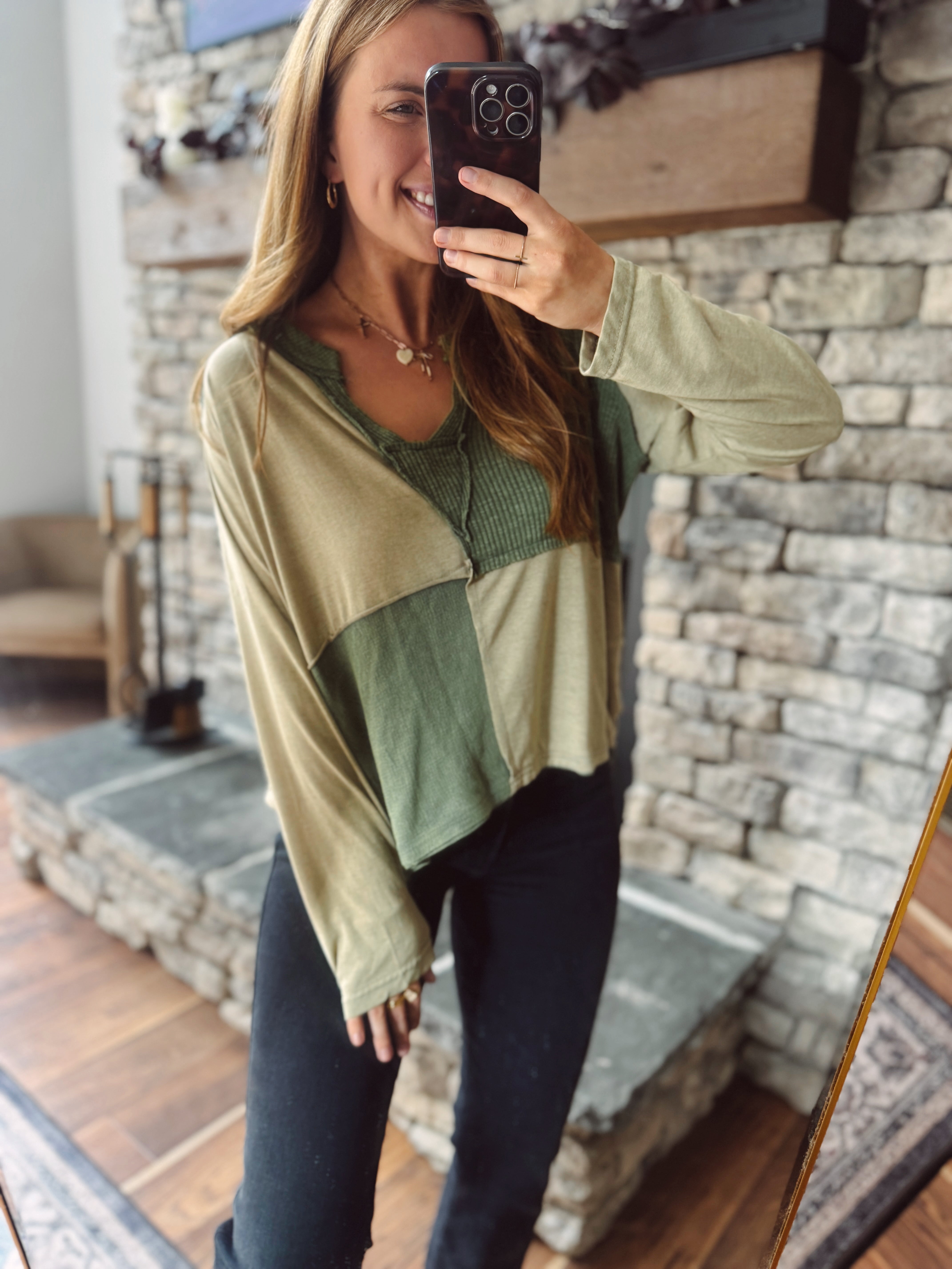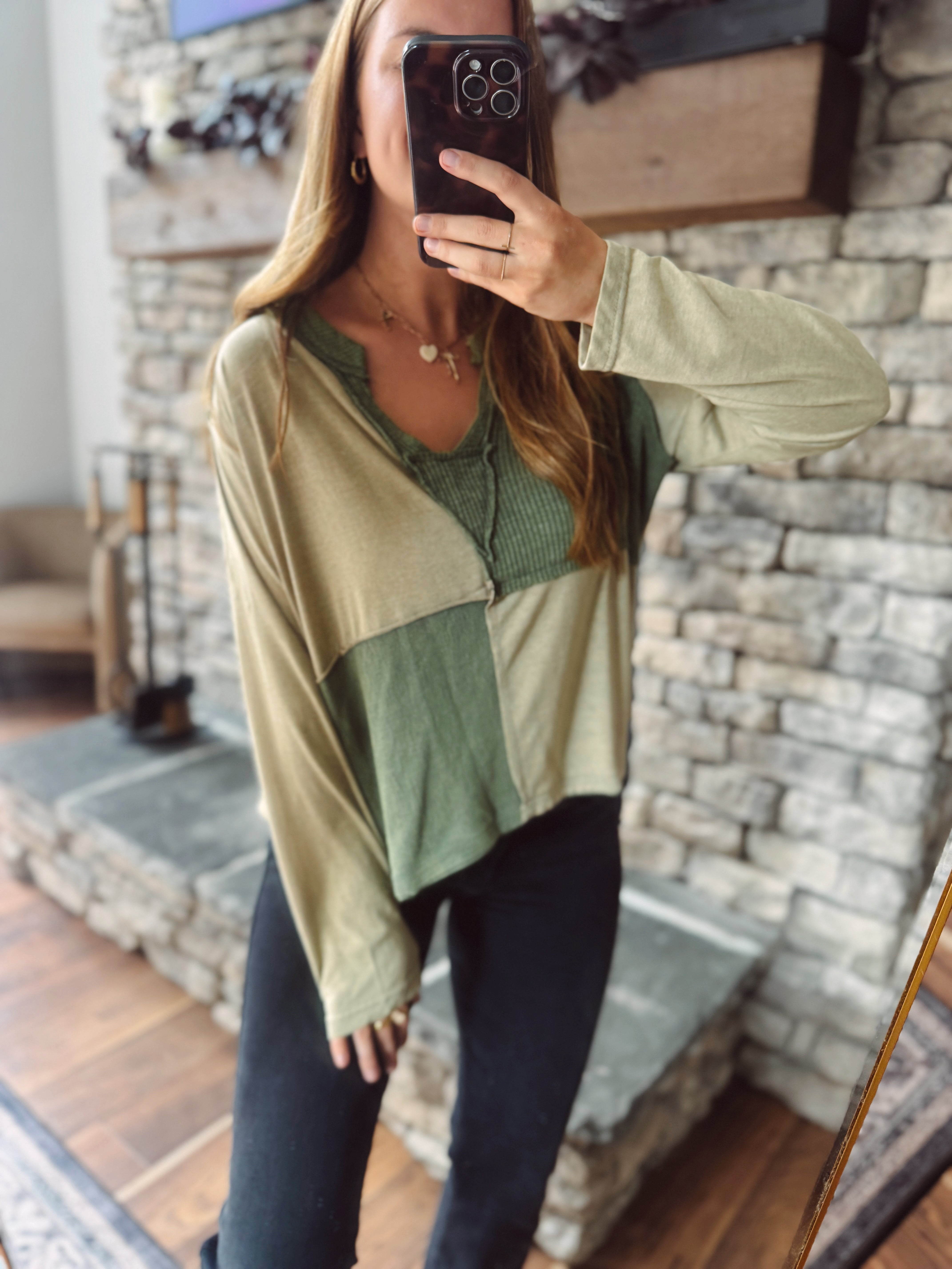 Leave it to POL to bring the effortless vibe we love. This long sleeve features a relaxed fit with unique colorblock panels in earthy greens that feel casual but elevated. The raw hem details + mixed textures make it the perfect throw-on with jeans or leggings.