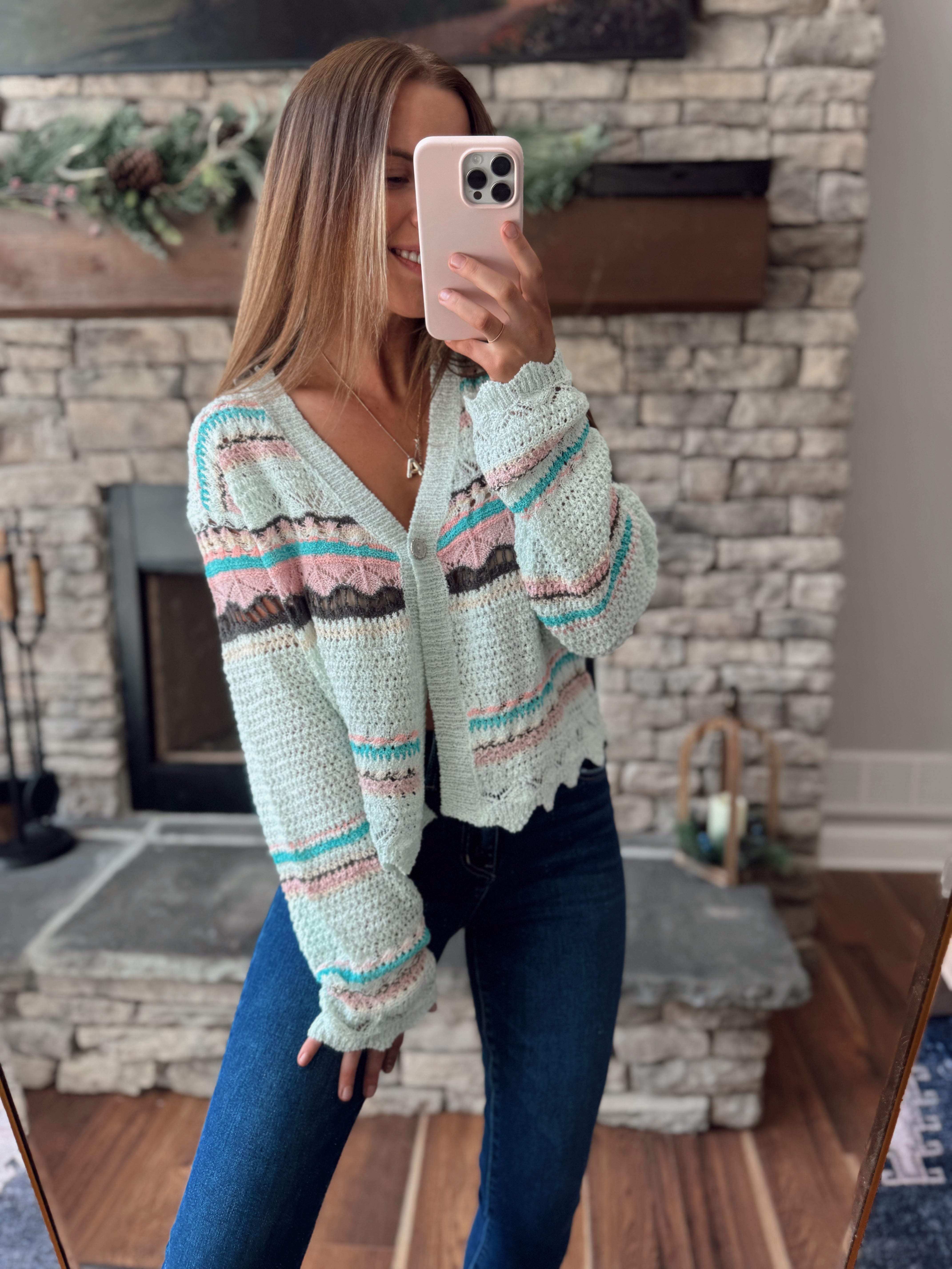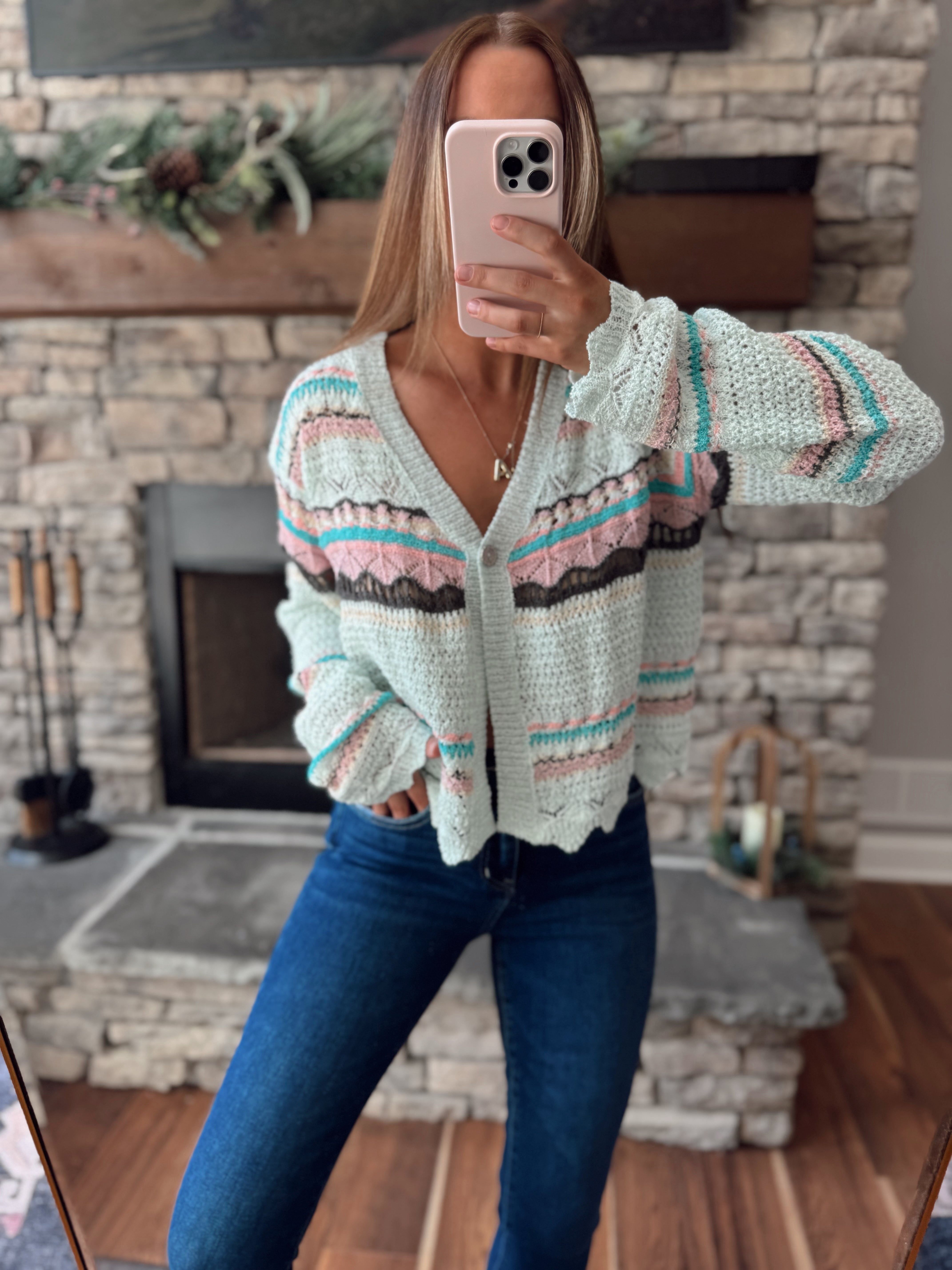 Payton Mint Multi Striped Crochet V-Neck Cardi