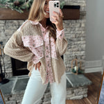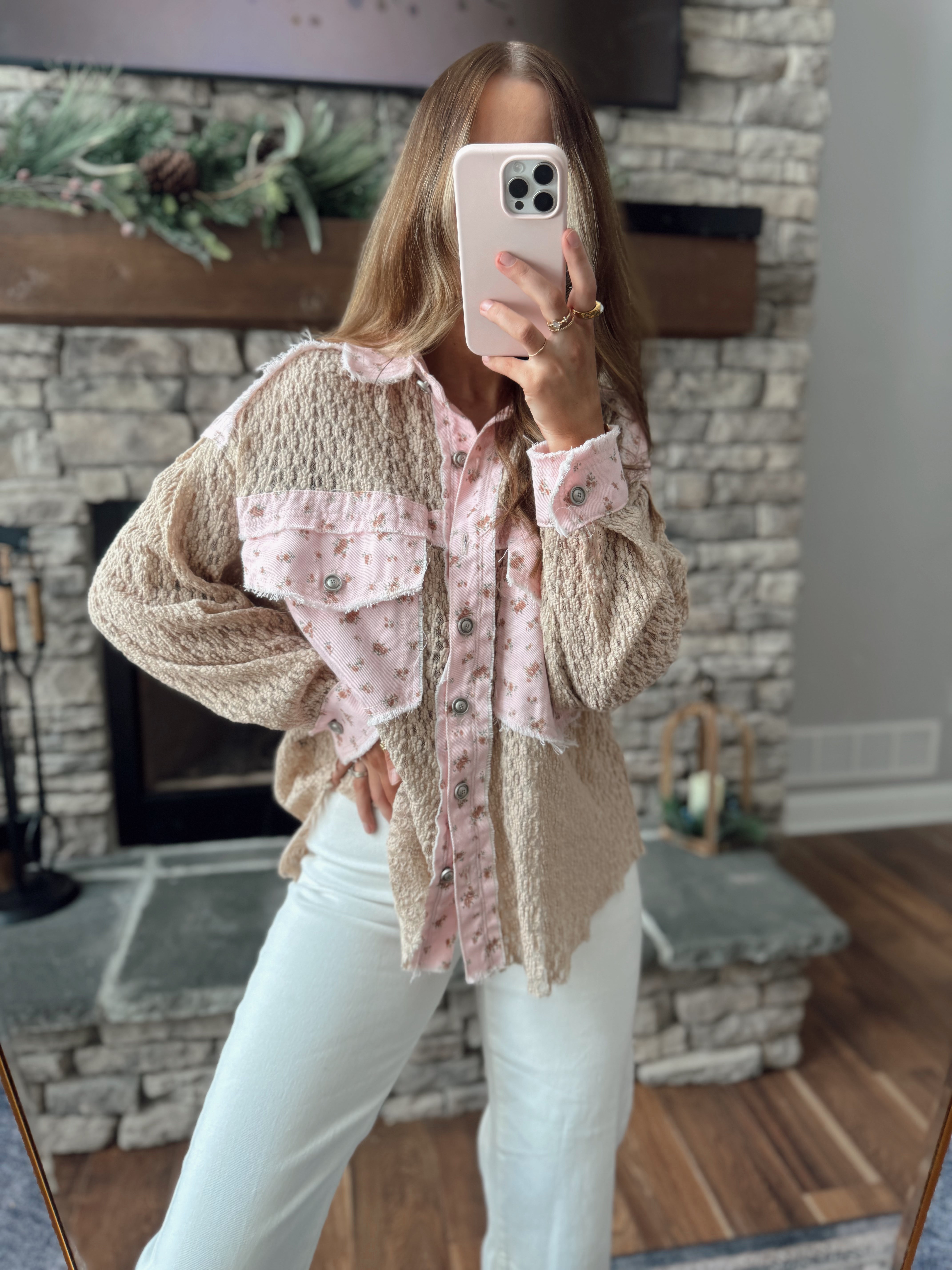 POL Pink Latte Multi Lace& Denim Mix Floral Button Down