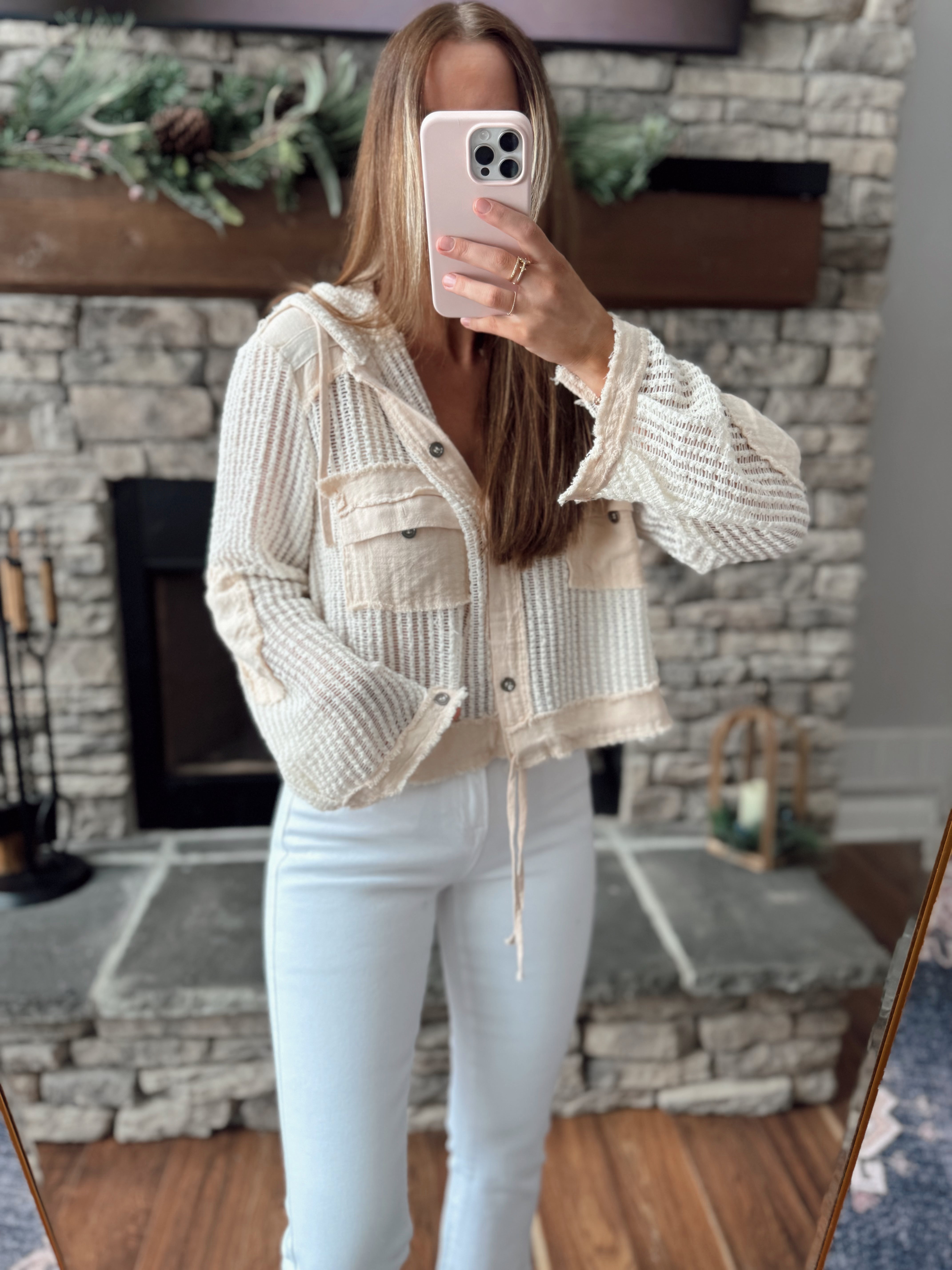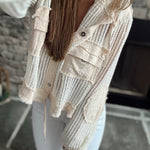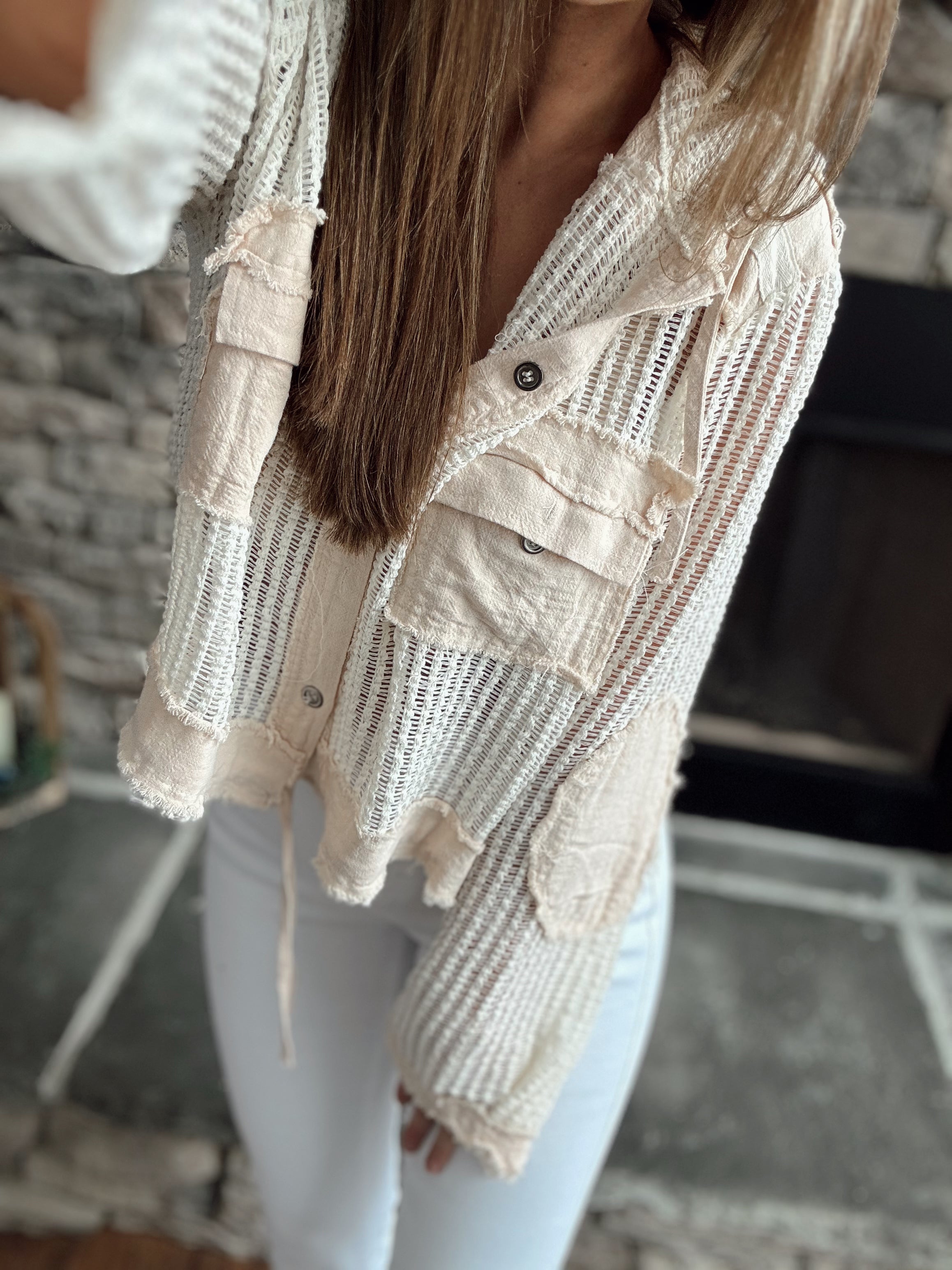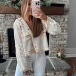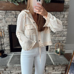 So Coastal Cream Multi Crochet Knit Hooded Cropped Button Down