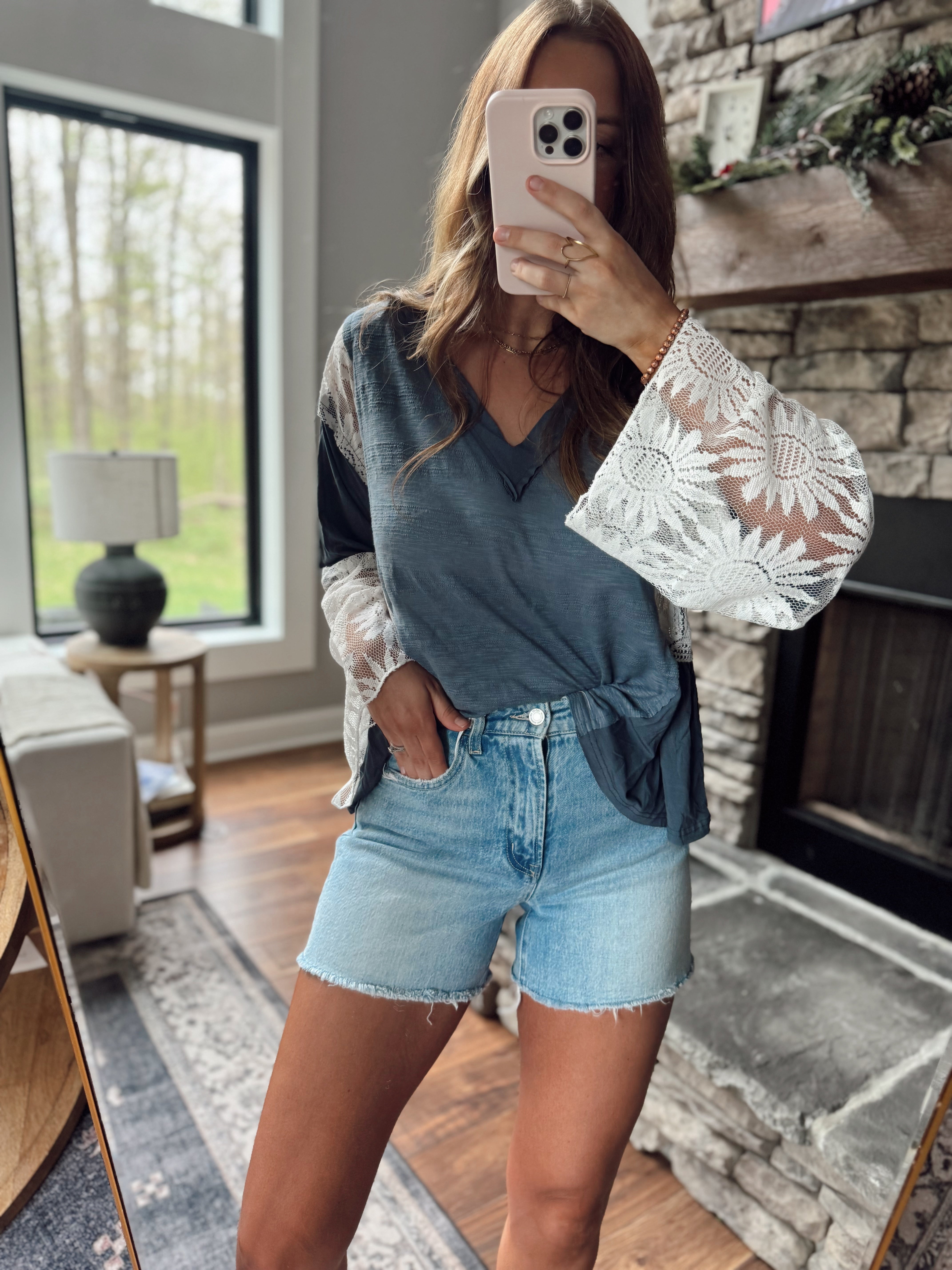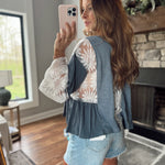 Sunni Indigo V Neck Floral Lace Wide Sleeve Top