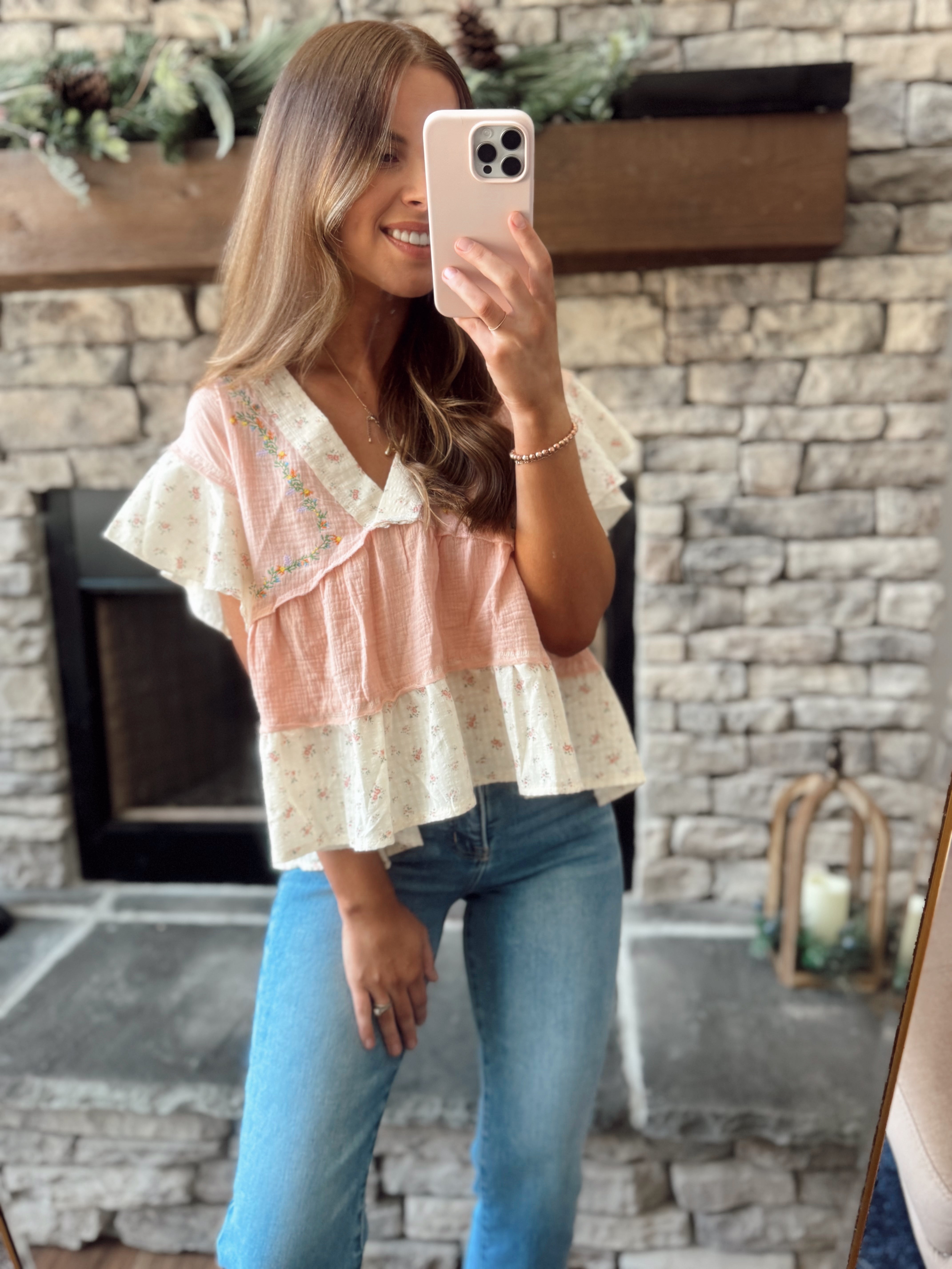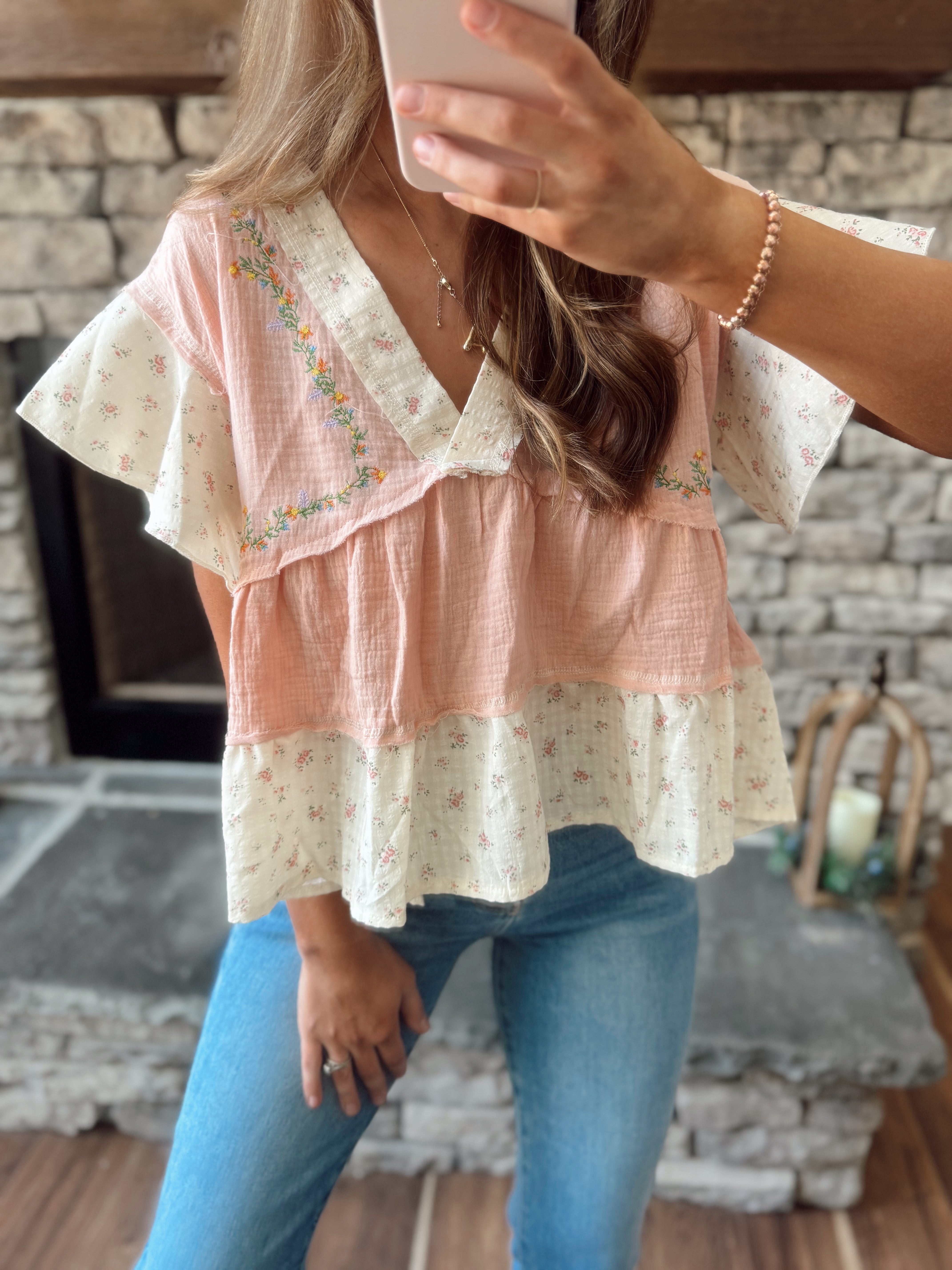 Micro Blooms Salmon Pink Floral Embroidered Linen Top