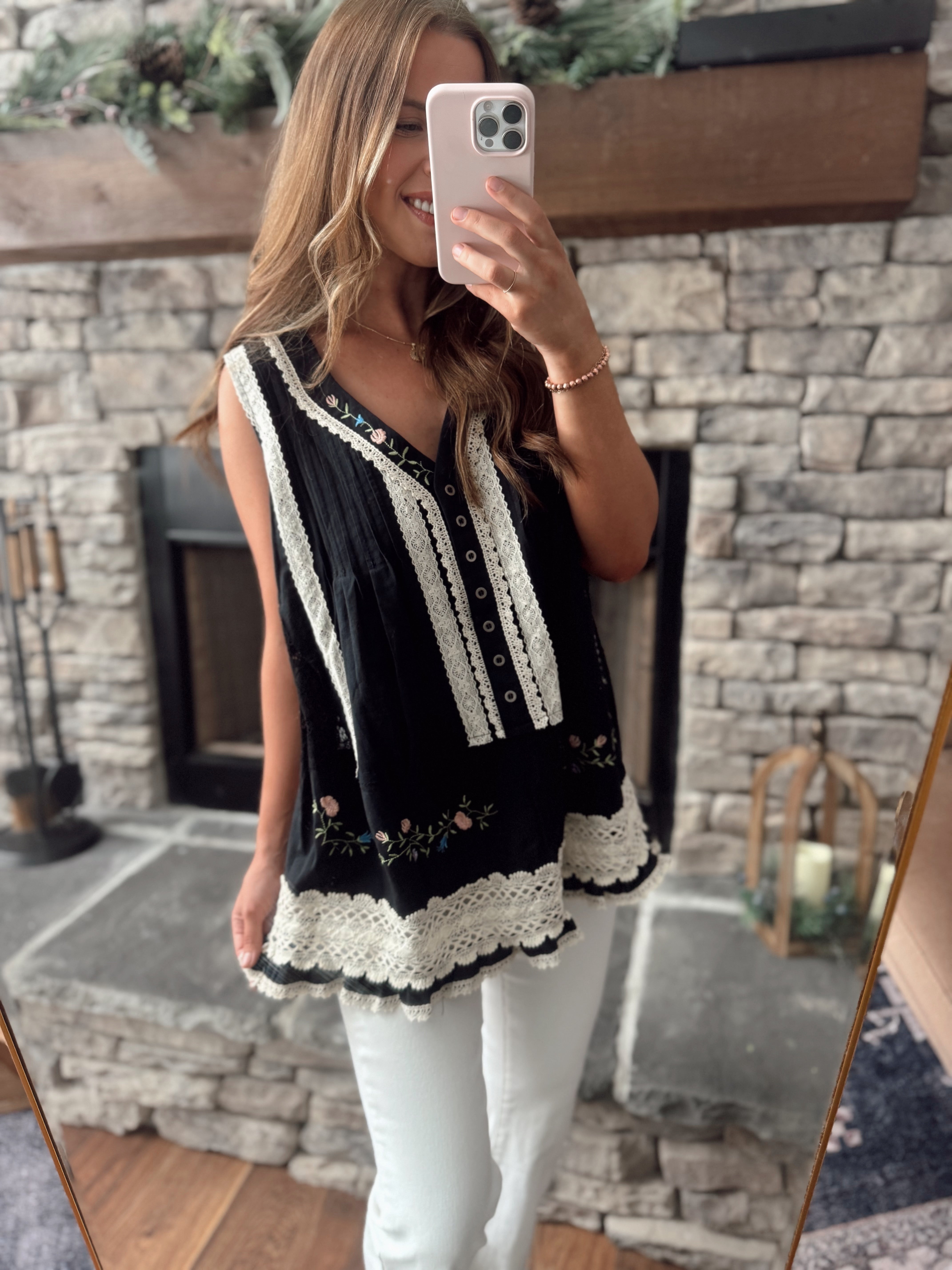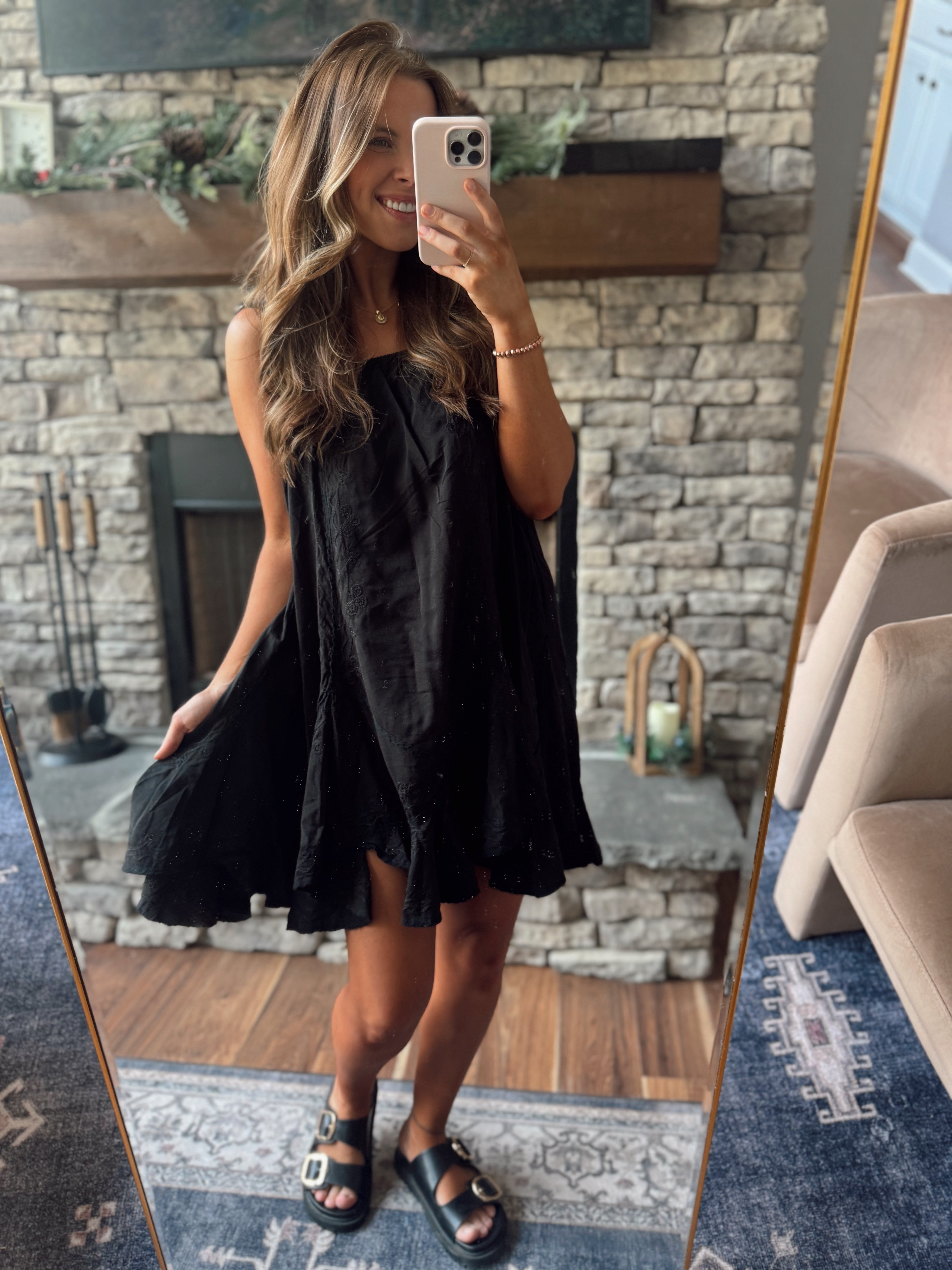 Coastal Elegance Black Mock Overall Embroidered Flowy Mini