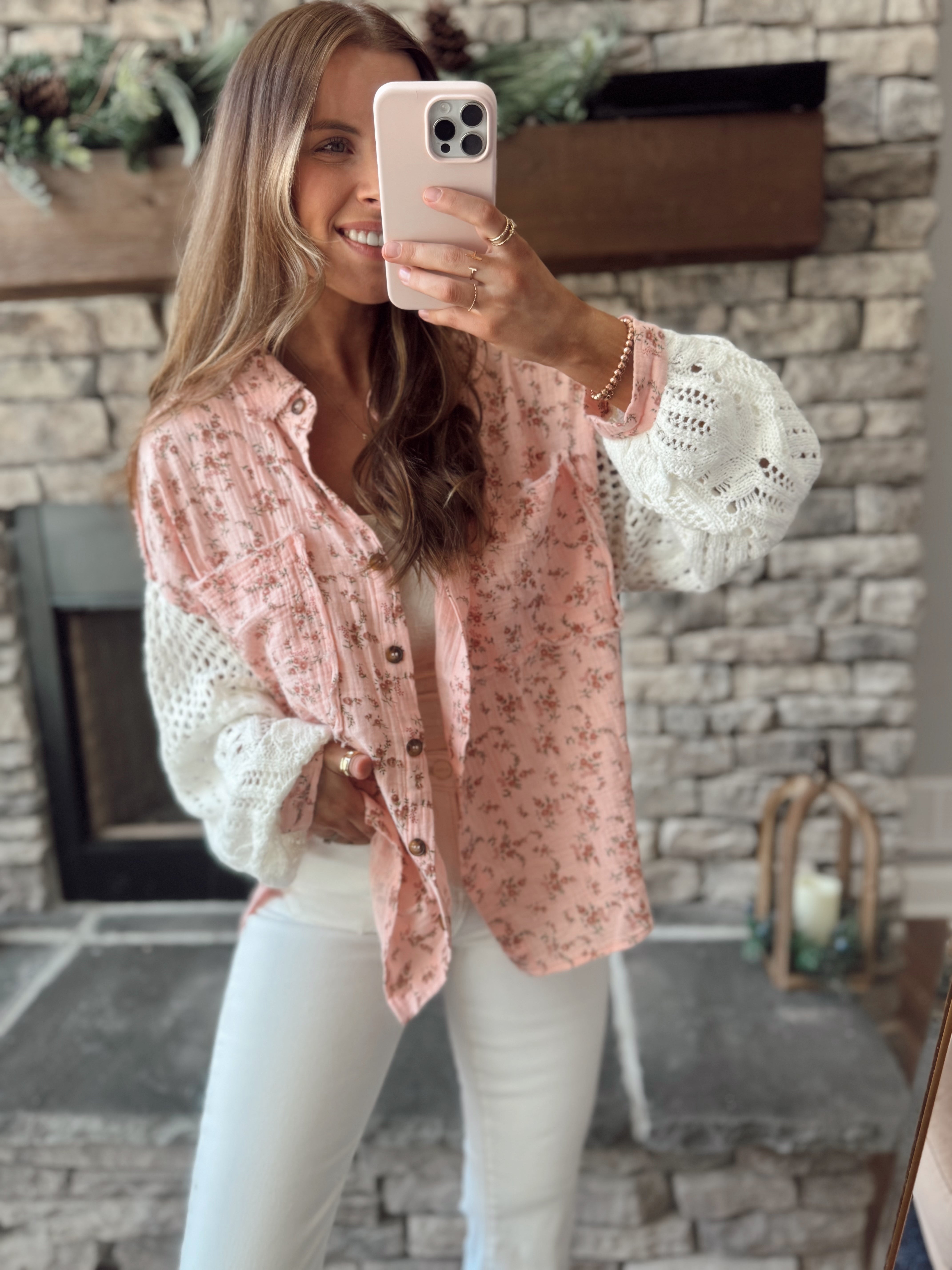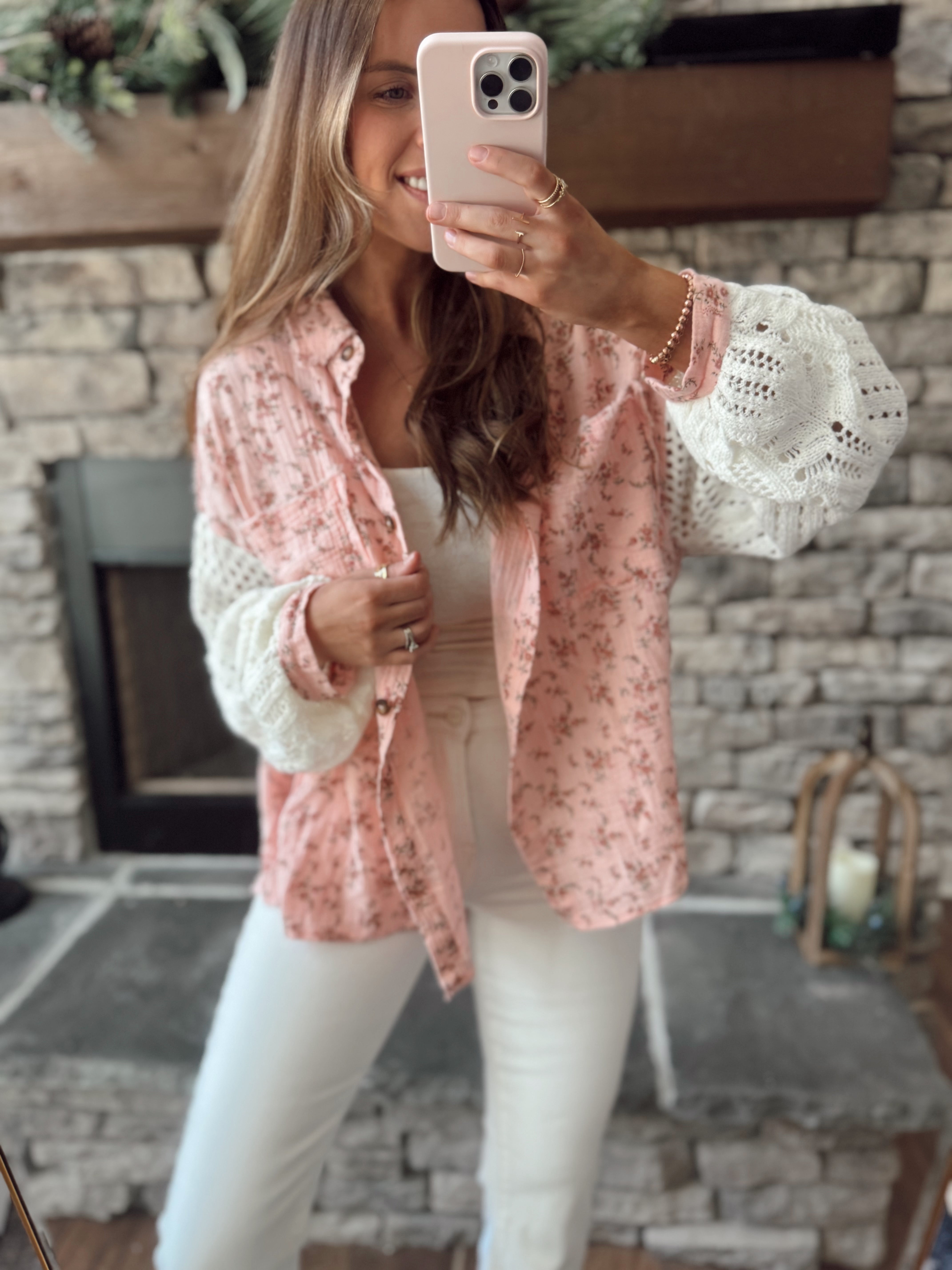 Rose Pink Floral Sweater Sleeve Gauze Button-Up
